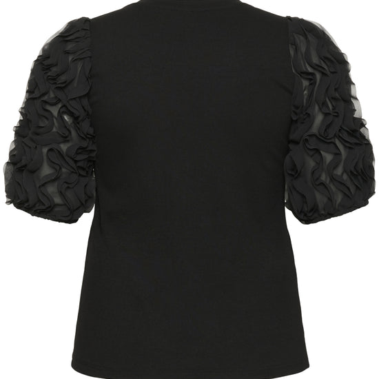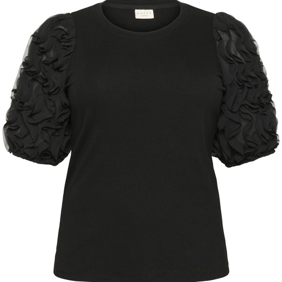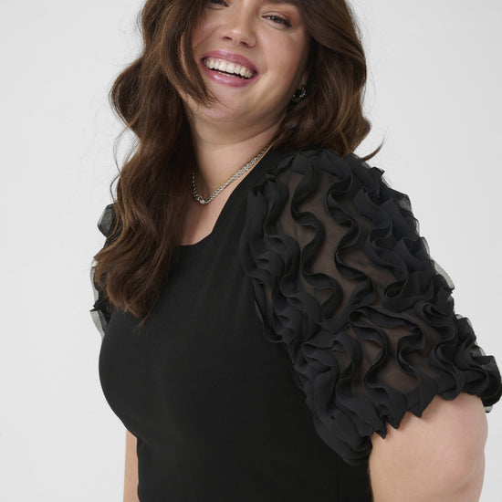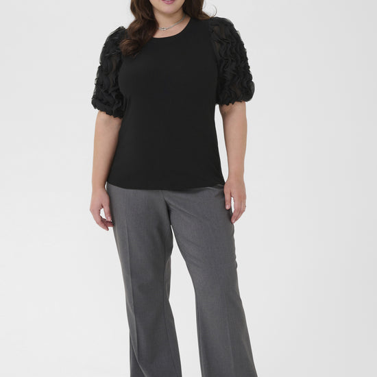 En moderne og feminin bluse som gir garderoben et stilsikkert løft. Denne sorte t-skjorten fra Kaffe Curve har dekorative, lett voluminøse ermer i transparent mesh som gir et unikt uttrykk. Stoffet er mykt og elastisk, og kombinerer komfort med en elegant silhuett.