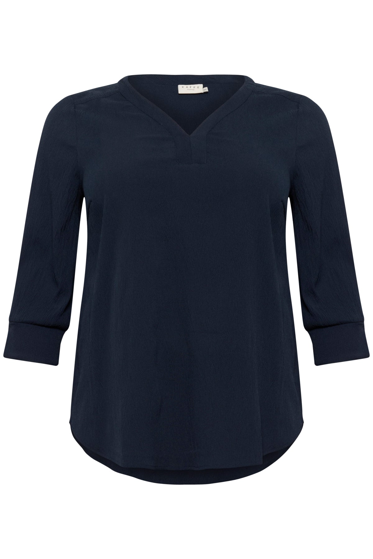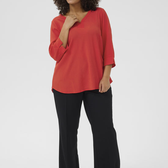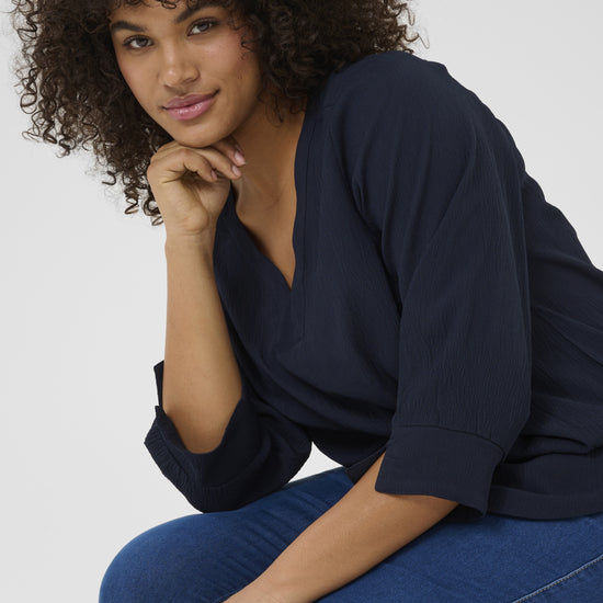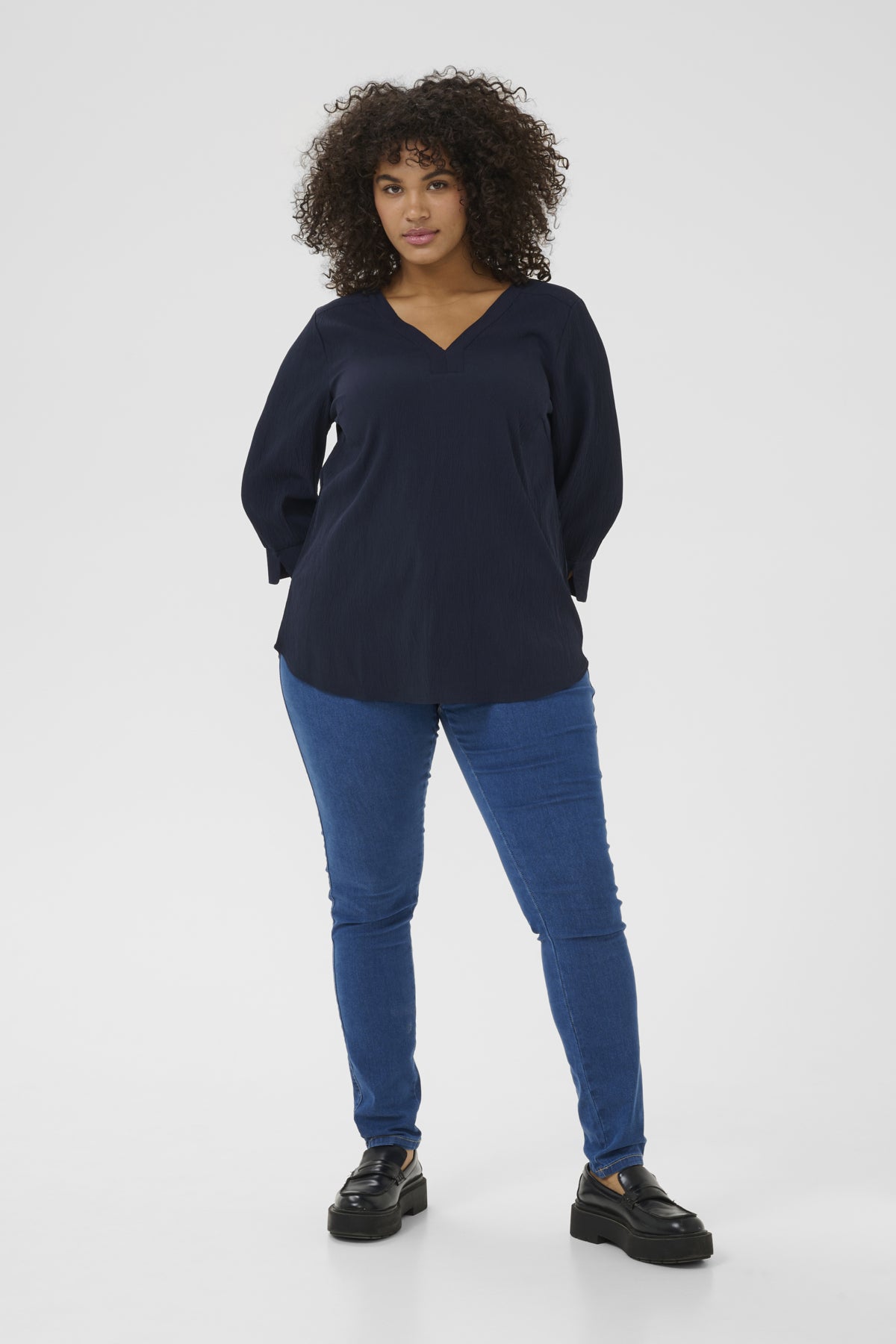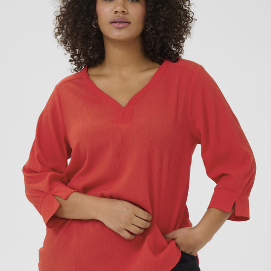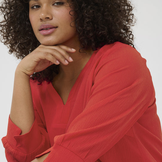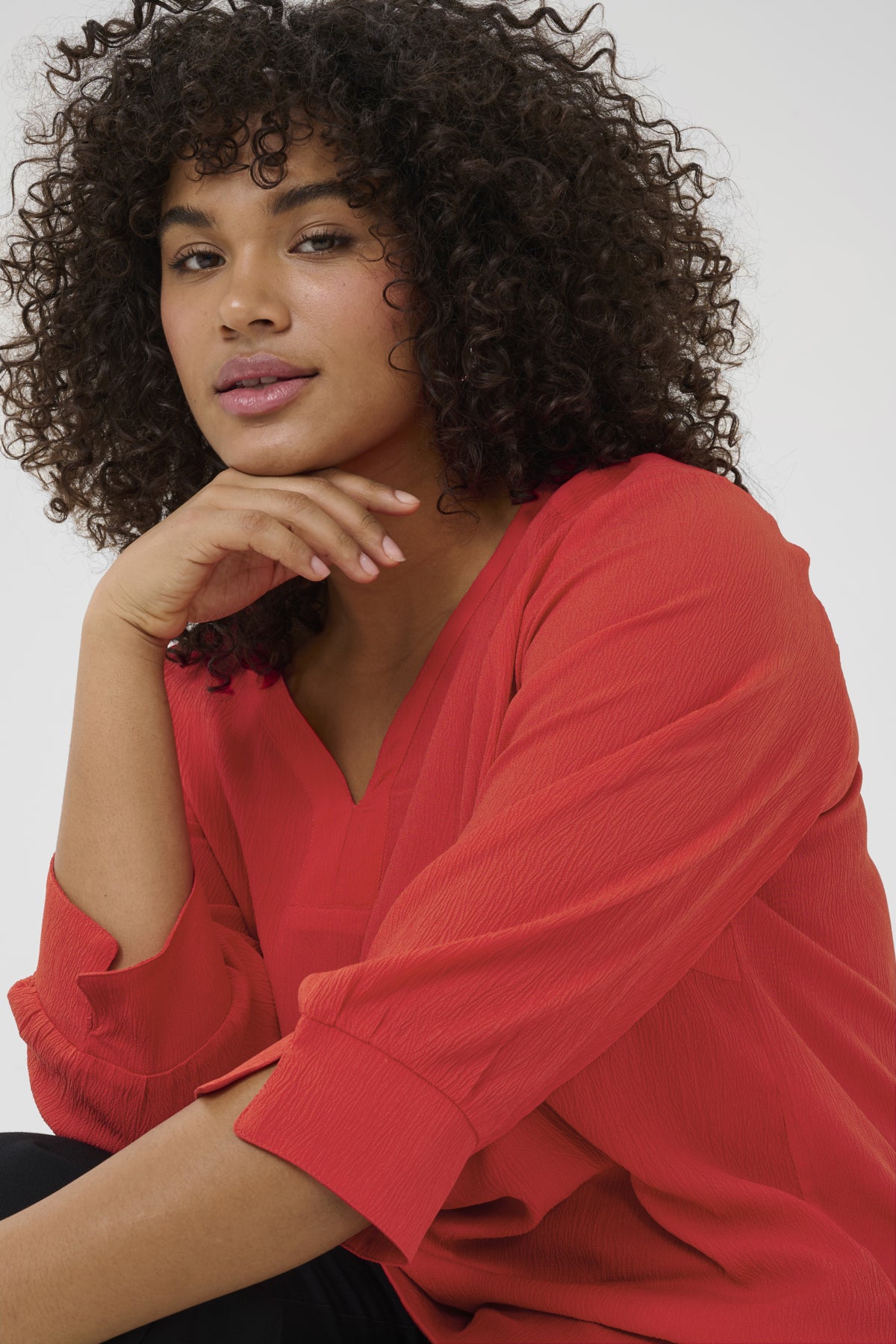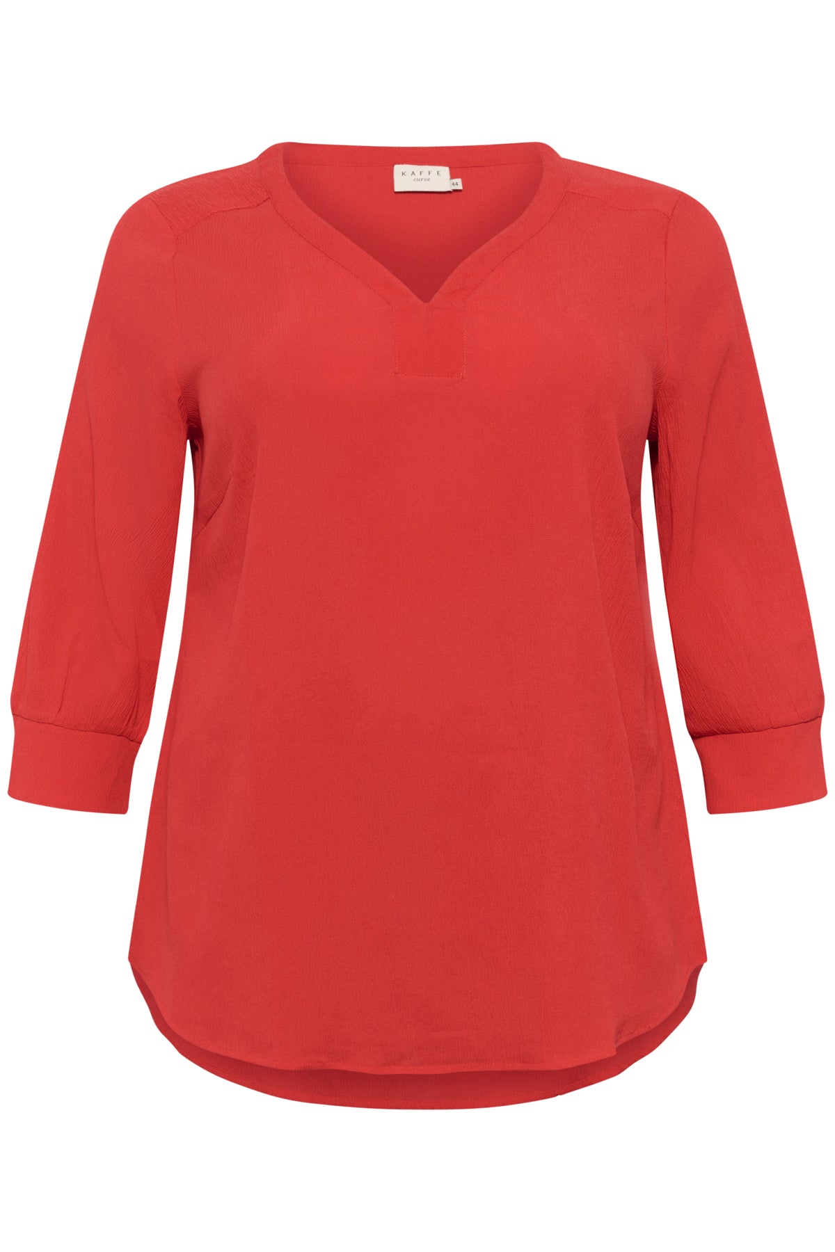 Gi garderoben et løft med denne flotte blusen fra Kaffe Curve. Den er laget i 100% polyester og kommer i to tidløse farger: True Red og Midnight Marine. Blusen har en løs og flatterende passform, myk V-hals og trekvartlange ermer med dekorativ oppbrett.
