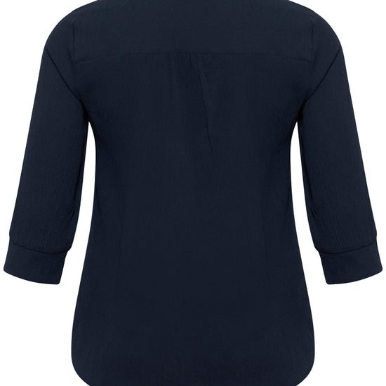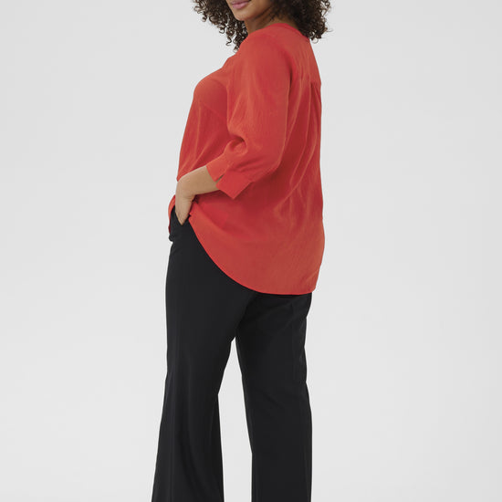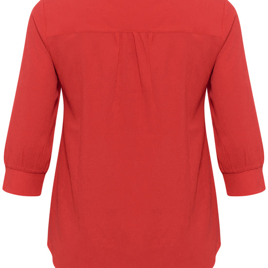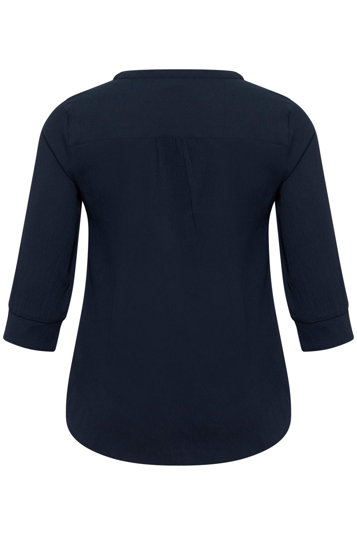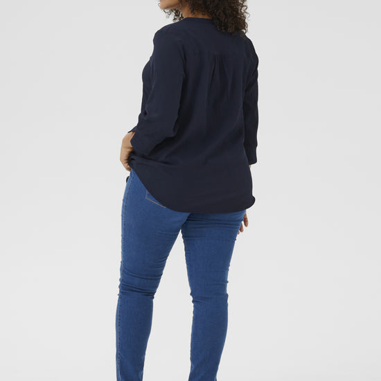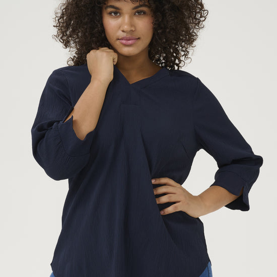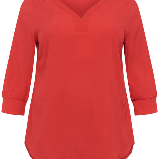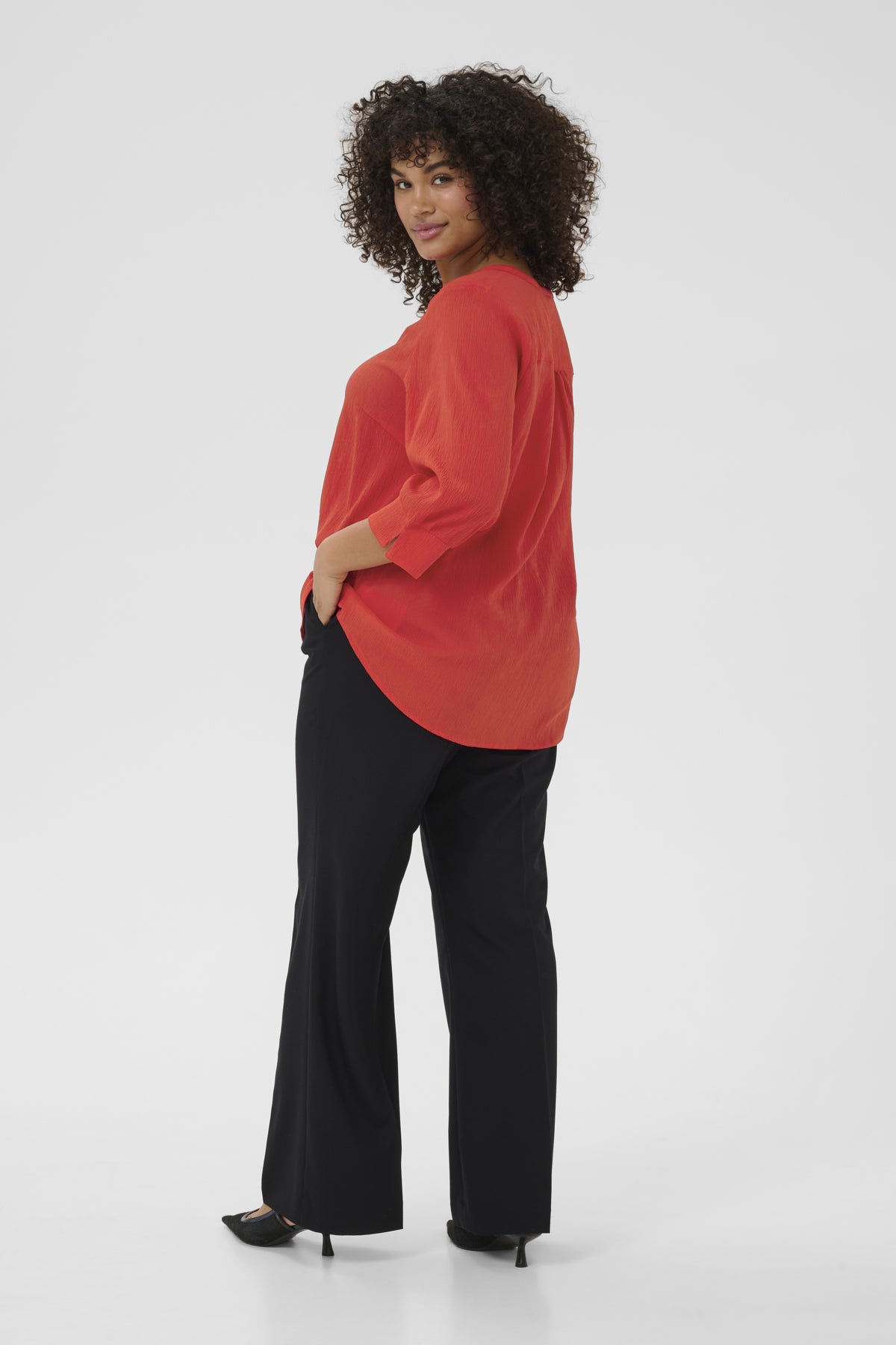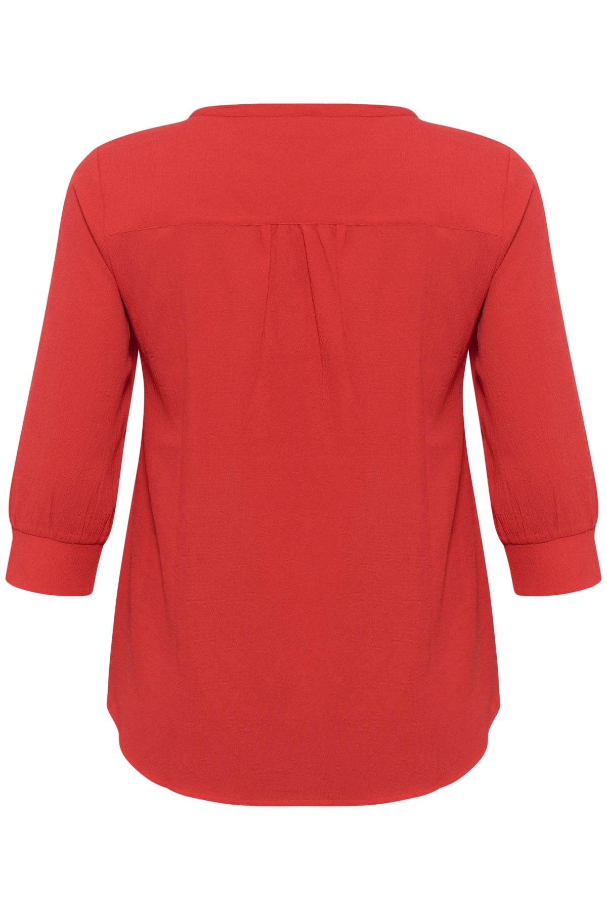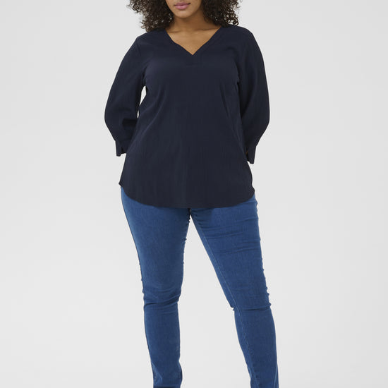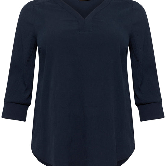 Gi garderoben et løft med denne flotte blusen fra Kaffe Curve. Den er laget i 100% polyester og kommer i to tidløse farger: True Red og Midnight Marine. Blusen har en løs og flatterende passform, myk V-hals og trekvartlange ermer med dekorativ oppbrett.