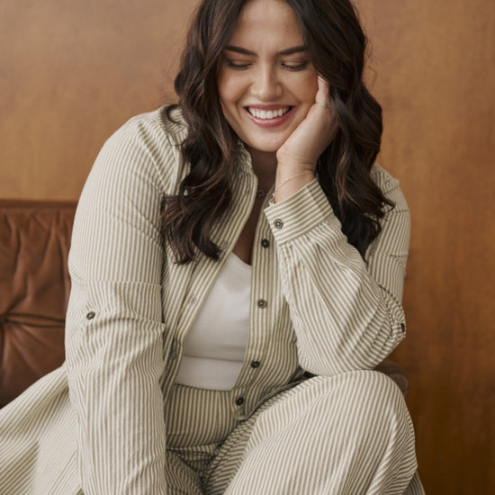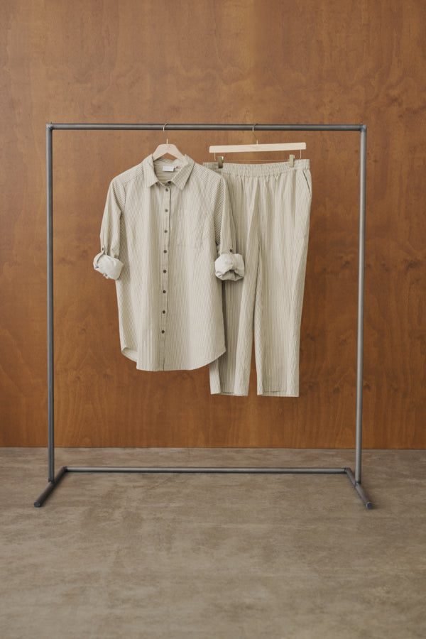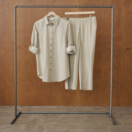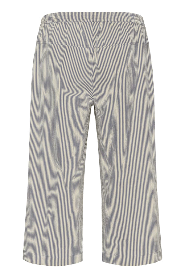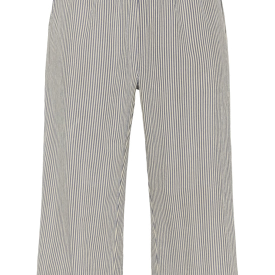 Disse buksene er designet med et klassisk nålestripet mønster, som tilfører et sofistikert preg til antrekket ditt. Den høye midjen fremhever figuren din, mens det enkle designet uten synlige lommer sikrer et elegant og stilrent utseende.