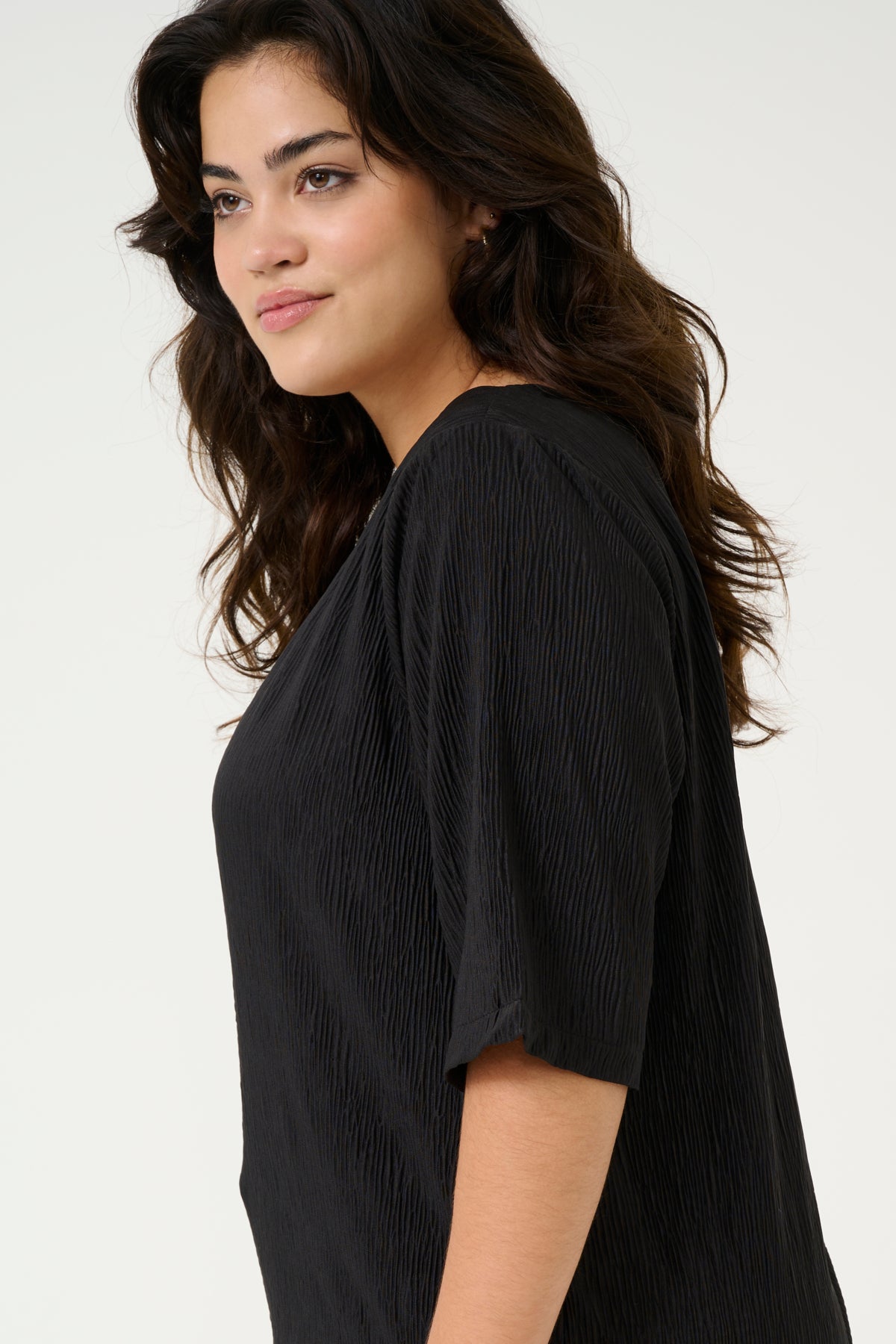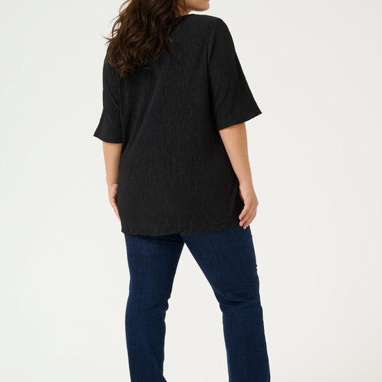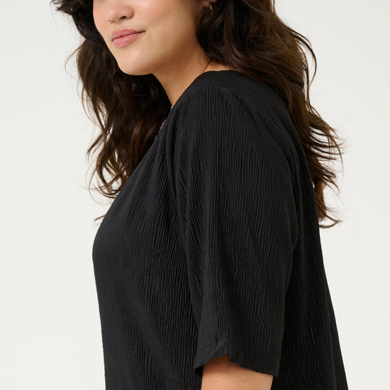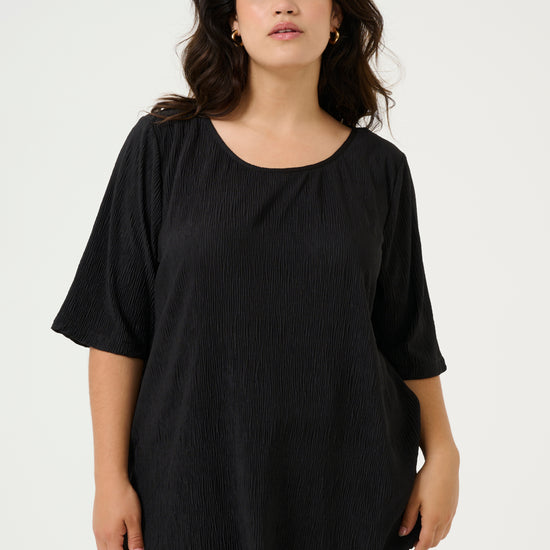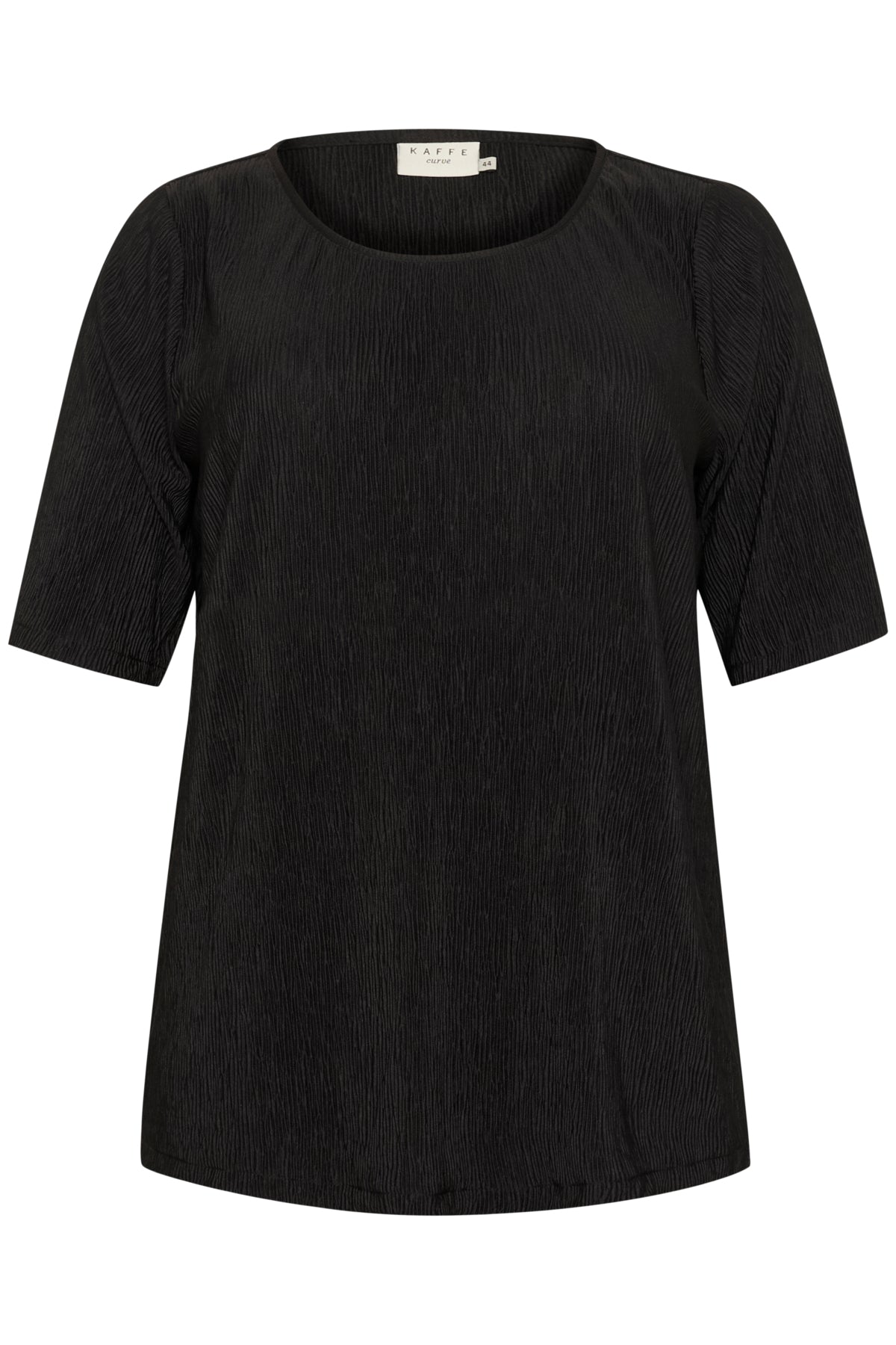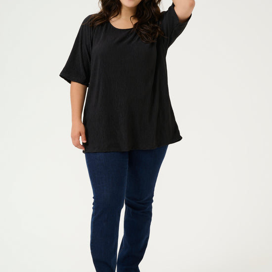 En tidløs og elegant bluse fra Kaffe Curve, designet for både komfort og stil. Blusen er laget i 100% polyester med en lett teksturert overflate, som gir et moderne preg til det klassiske sorte uttrykket.
