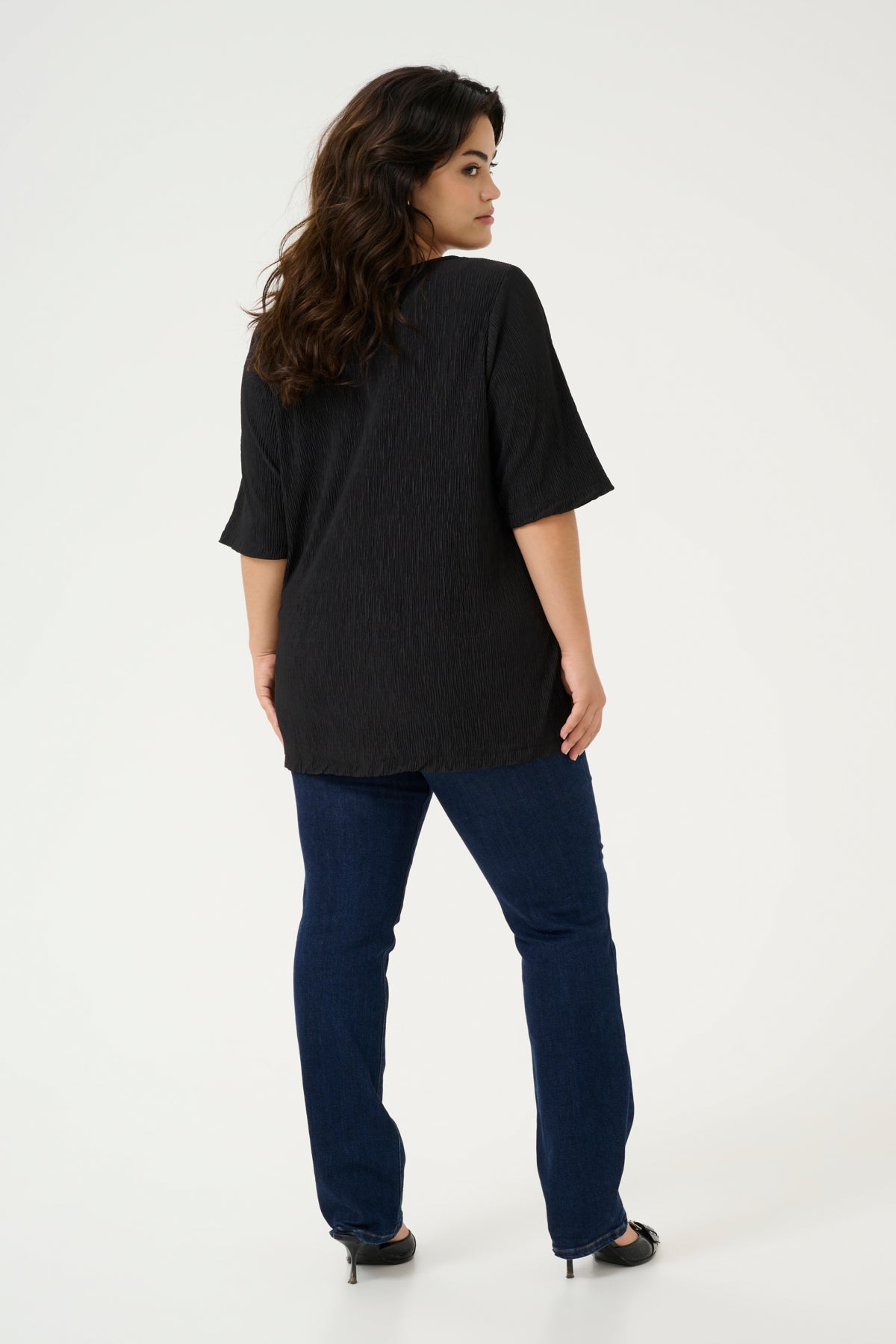Den sorte blusen er et must i garderoben og passer like godt til hverdag som til fest. Tilgjengelig i størrelser 44-54, slik at du enkelt finner din perfekte passform. Kombiner den med jeans fra plus size jeans eller skap et feminint uttrykk med en topp fra plus size topper for et personlig antrekk.