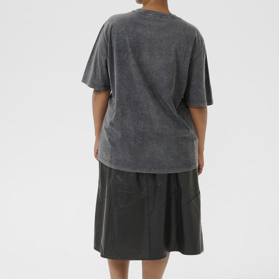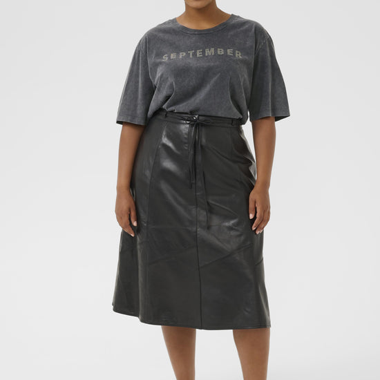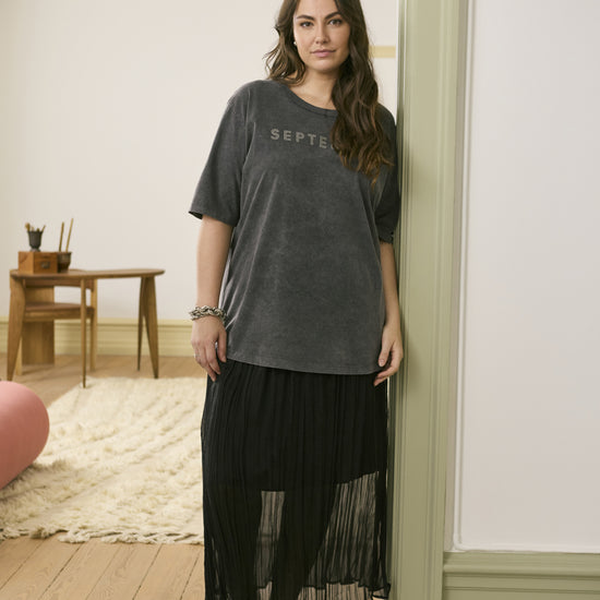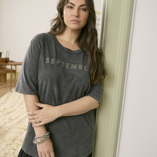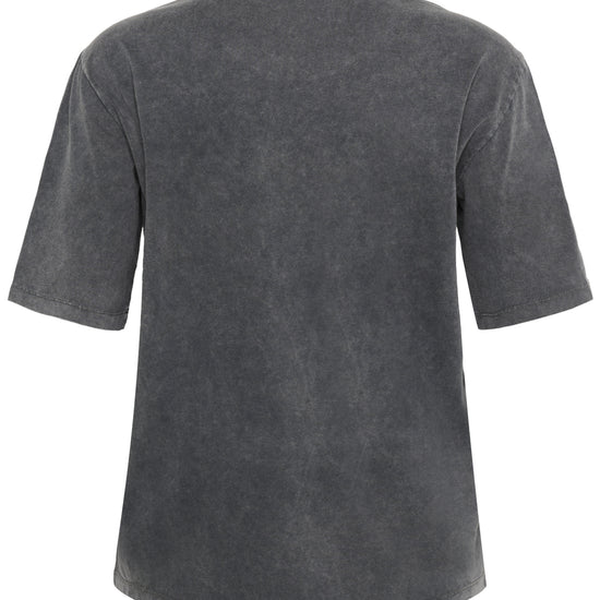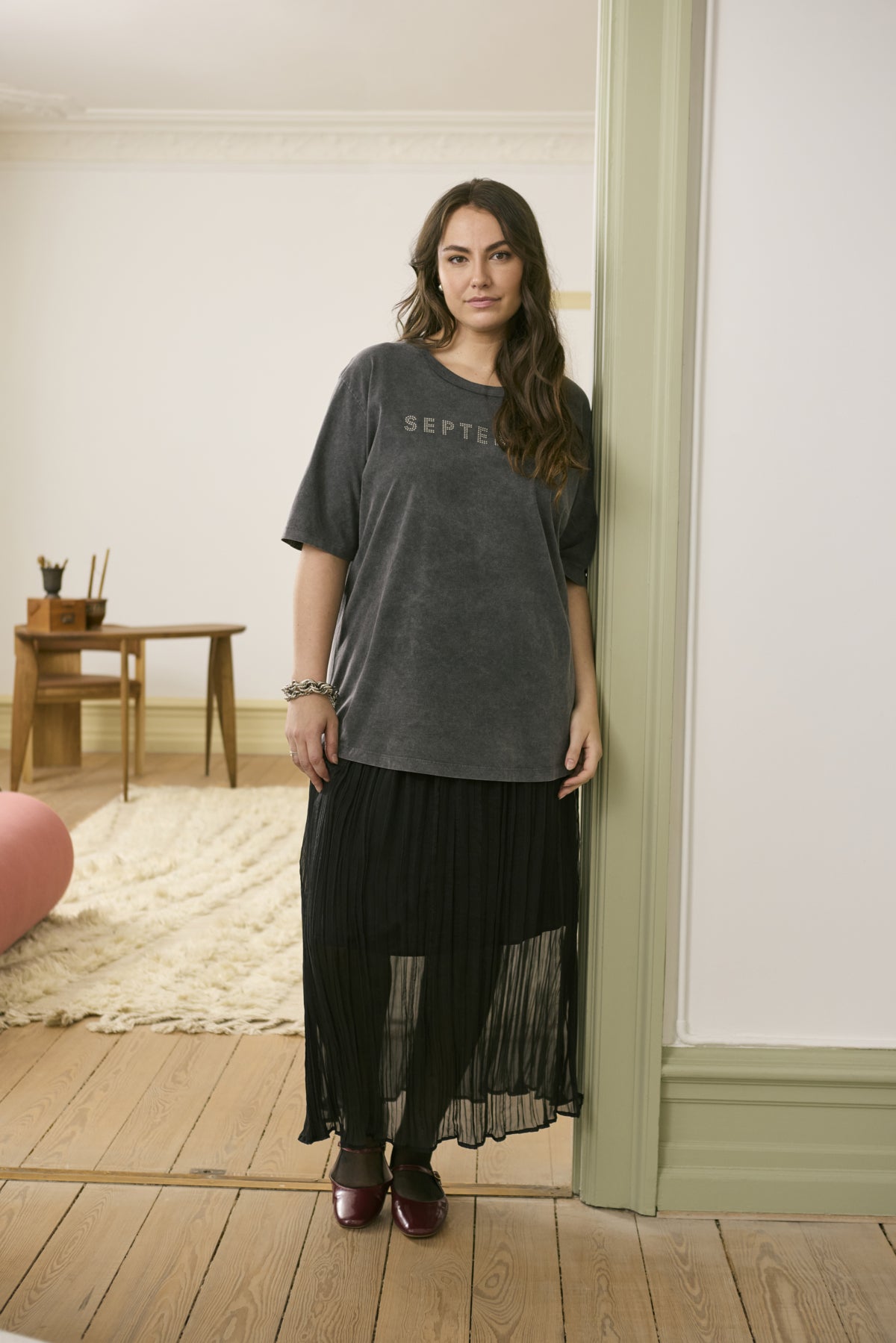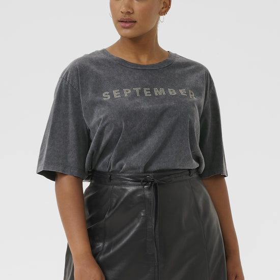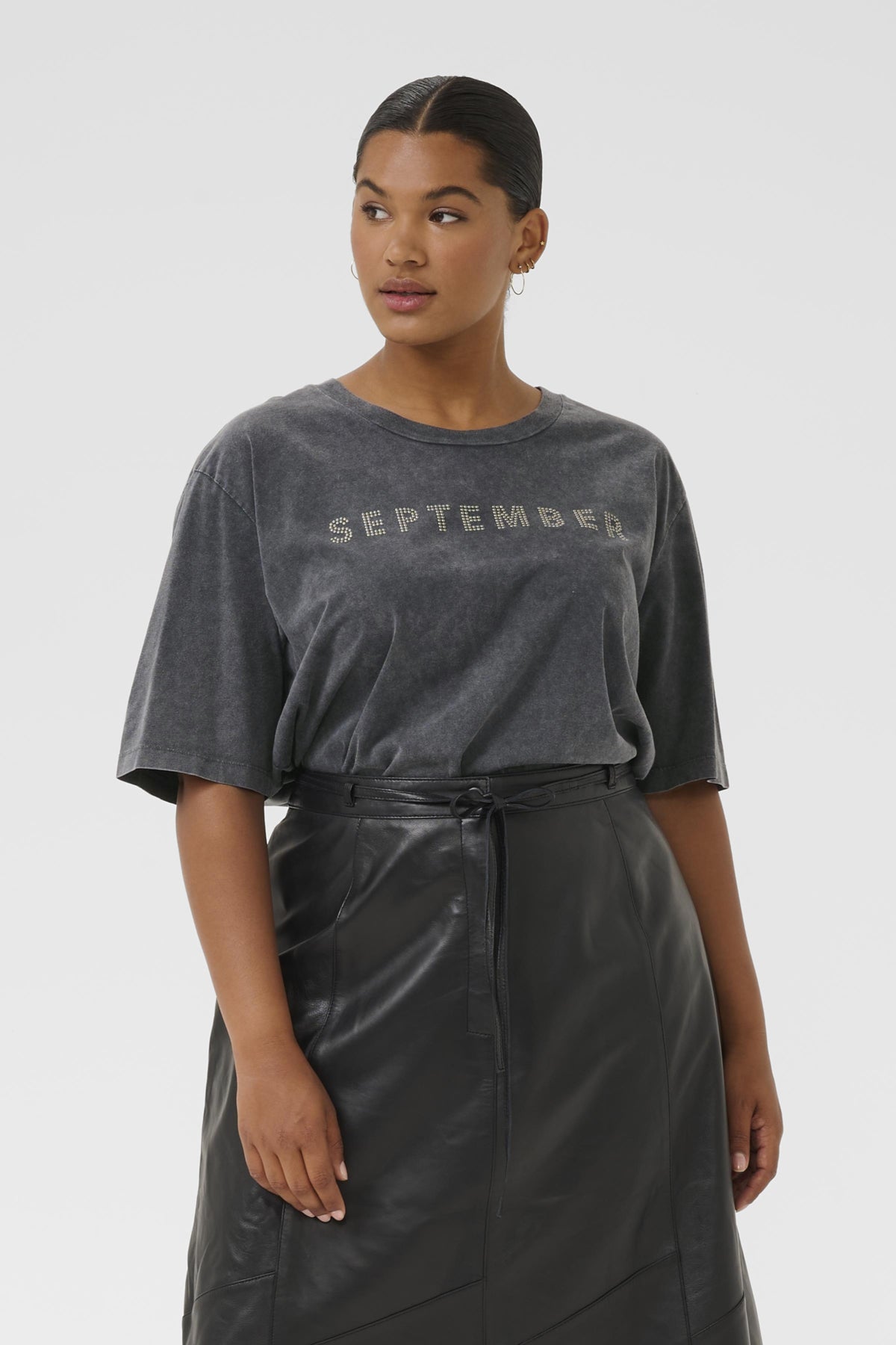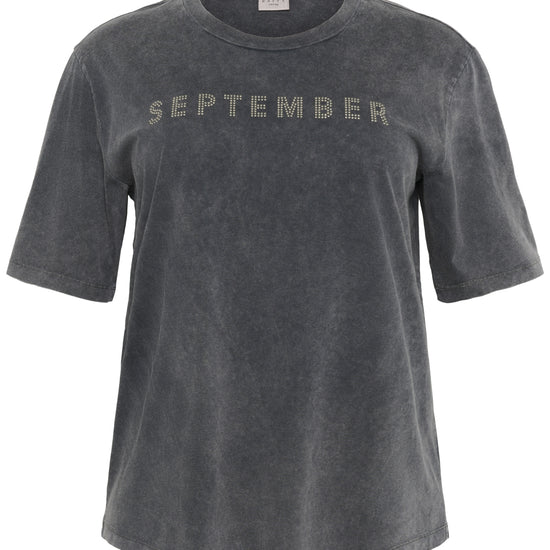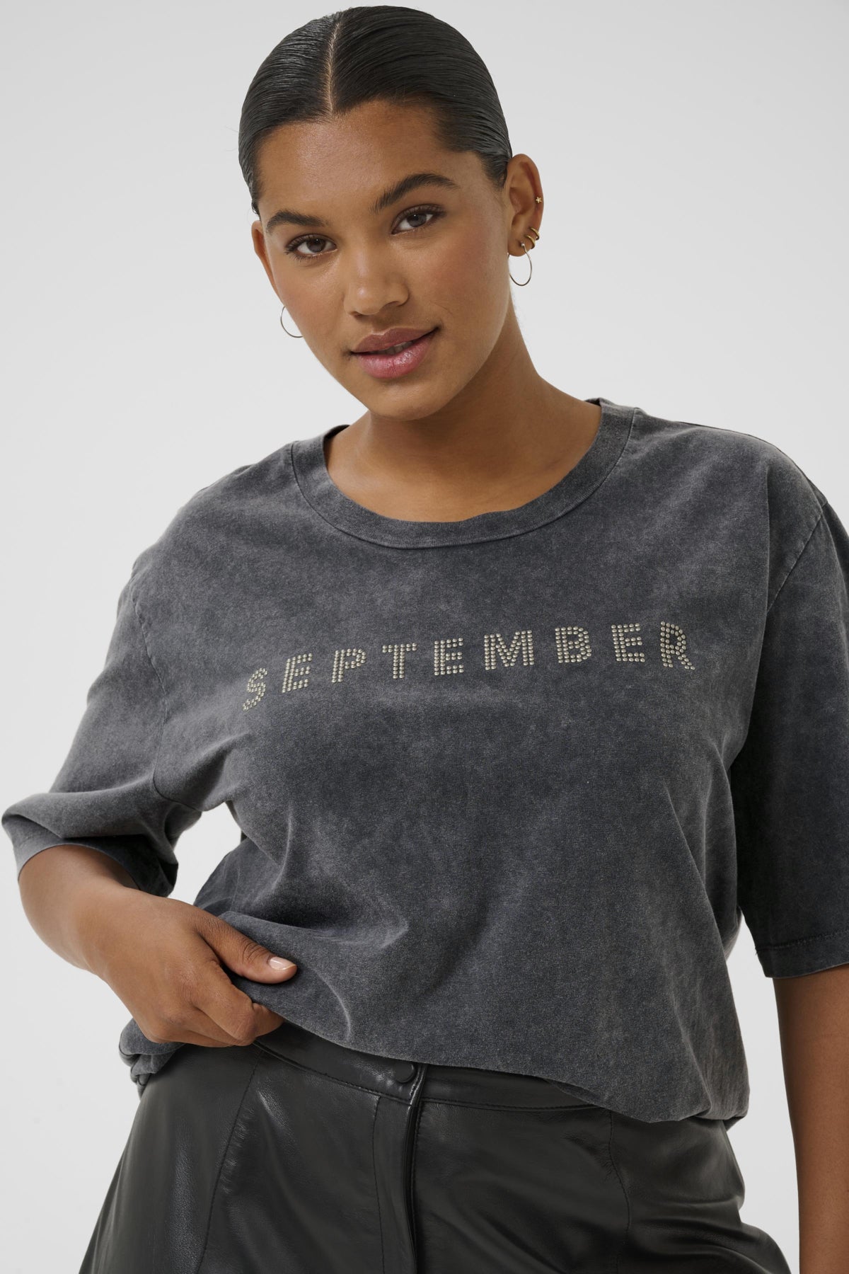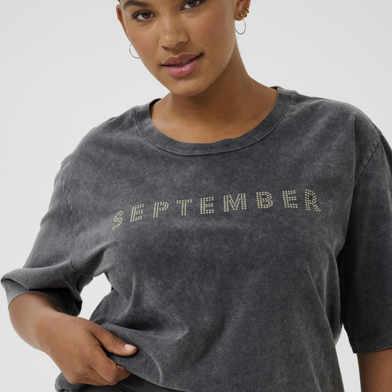 Opgrader din basisgarderobe med denne T-shirt fra Kaffe Curve i en flot vasket mørkegrå nuance. T-shirten er lavet i 100% blød bomuld, har afslappet pasform og rund halsudskæring. På brystet er teksten "SEPTEMBER" pyntet med små, skinnende sten, som giver et elegant twist til det rå look.