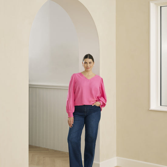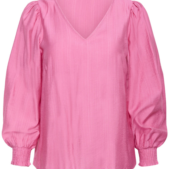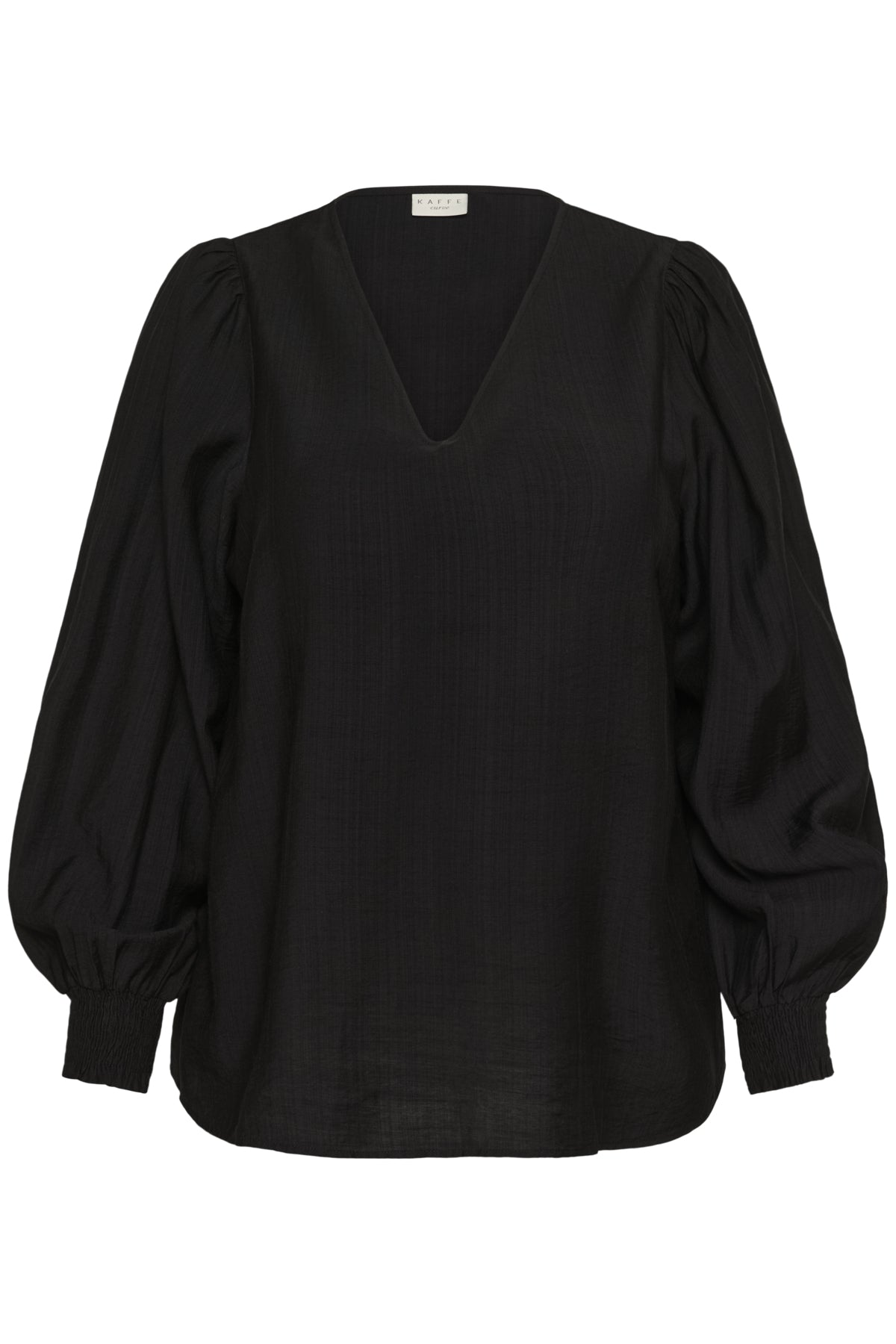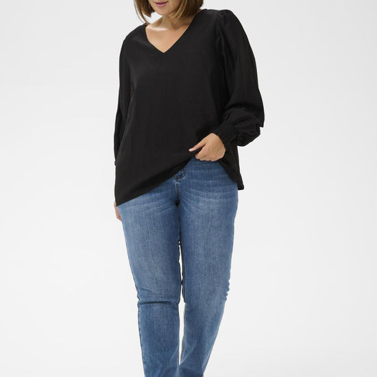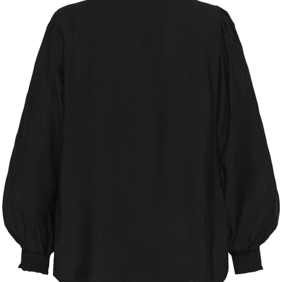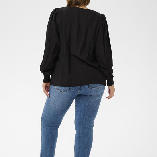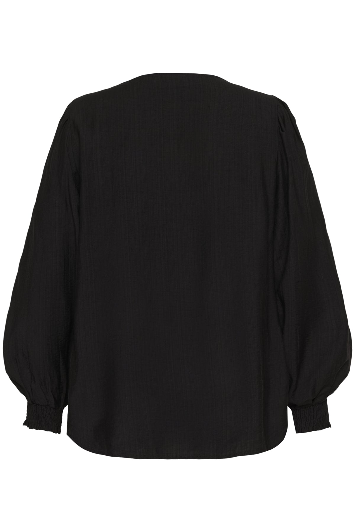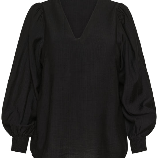 Blusen har en let tekstur, afslappet pasform og dyb V-udskæring. Store pufærmer med rynkede skuldre afsluttes af brede, tætsiddende manchetter.