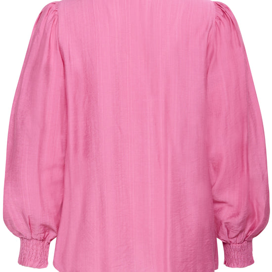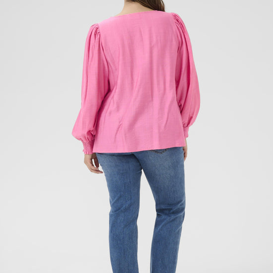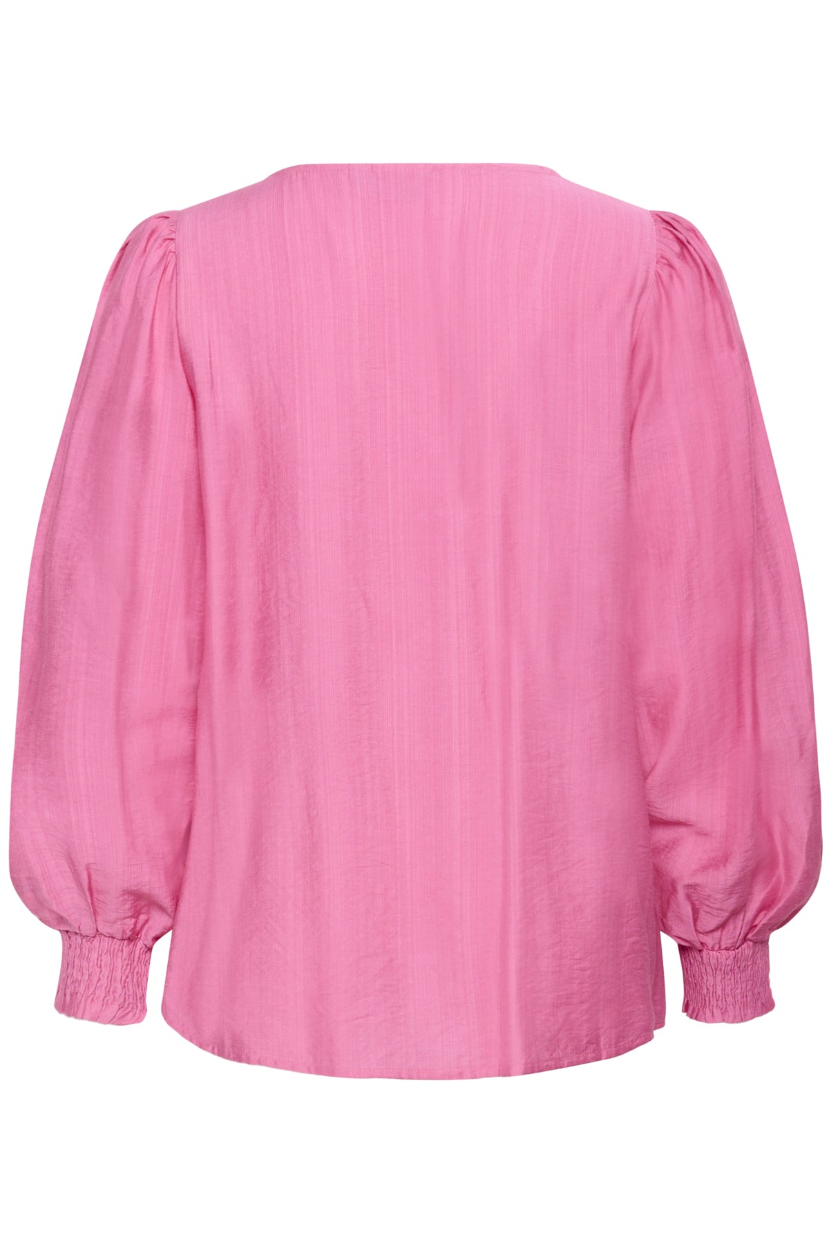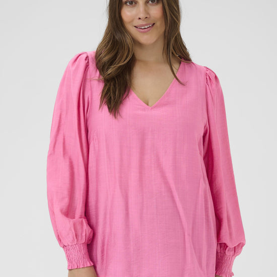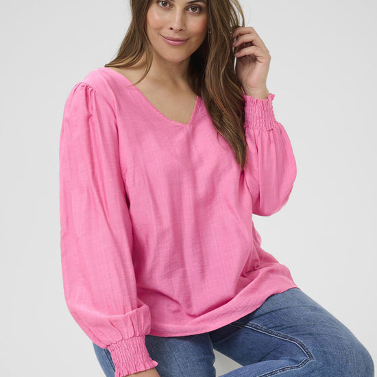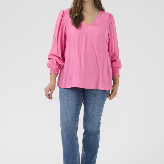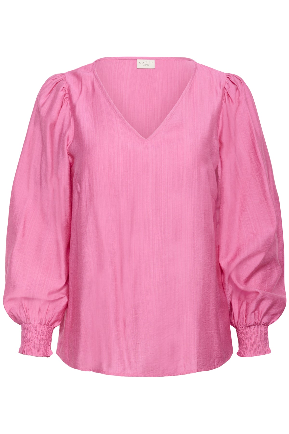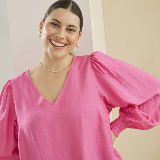 Blusen har en let tekstur, afslappet pasform og dyb V-udskæring. Store pufærmer med rynkede skuldre afsluttes af brede, tætsiddende manchetter.