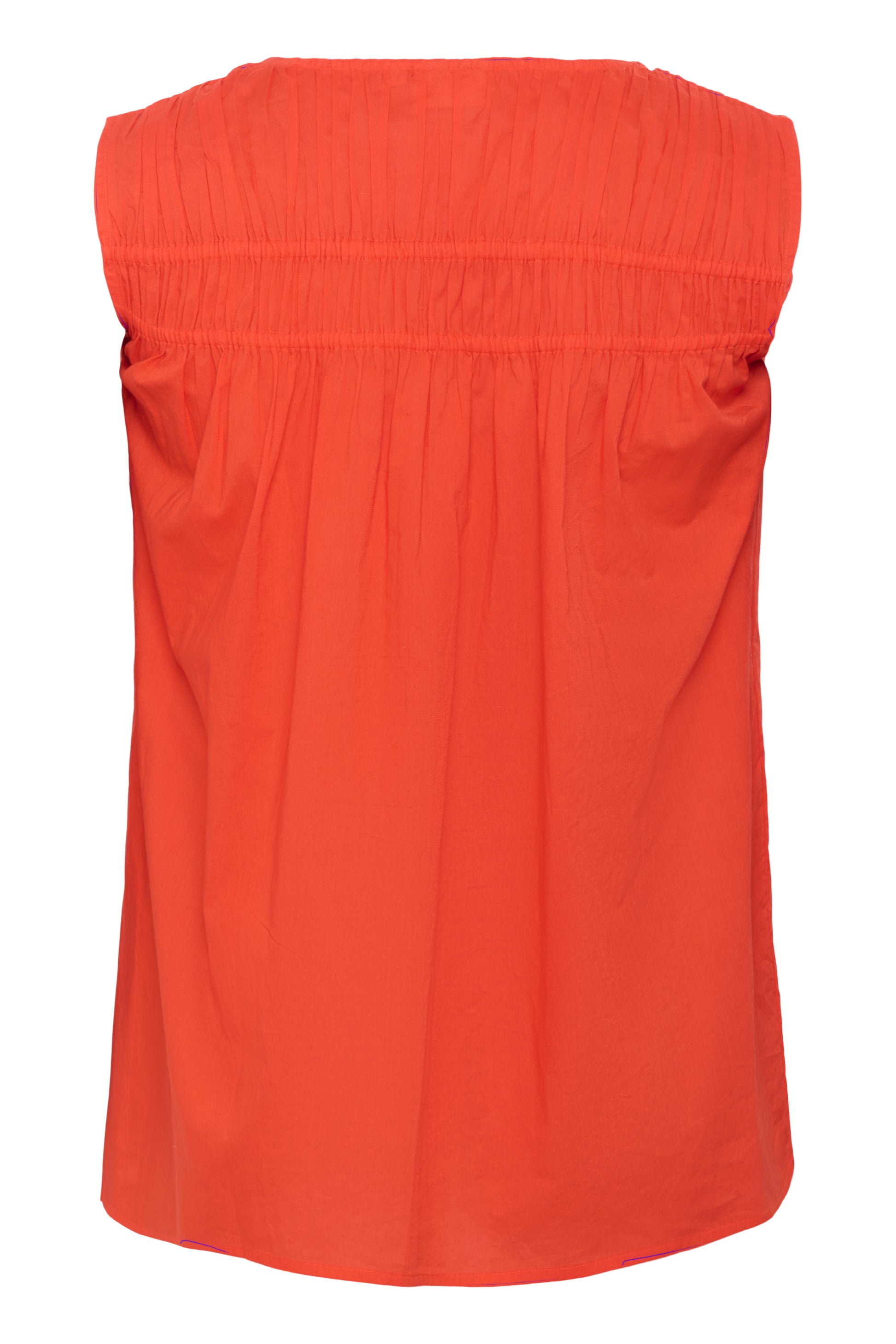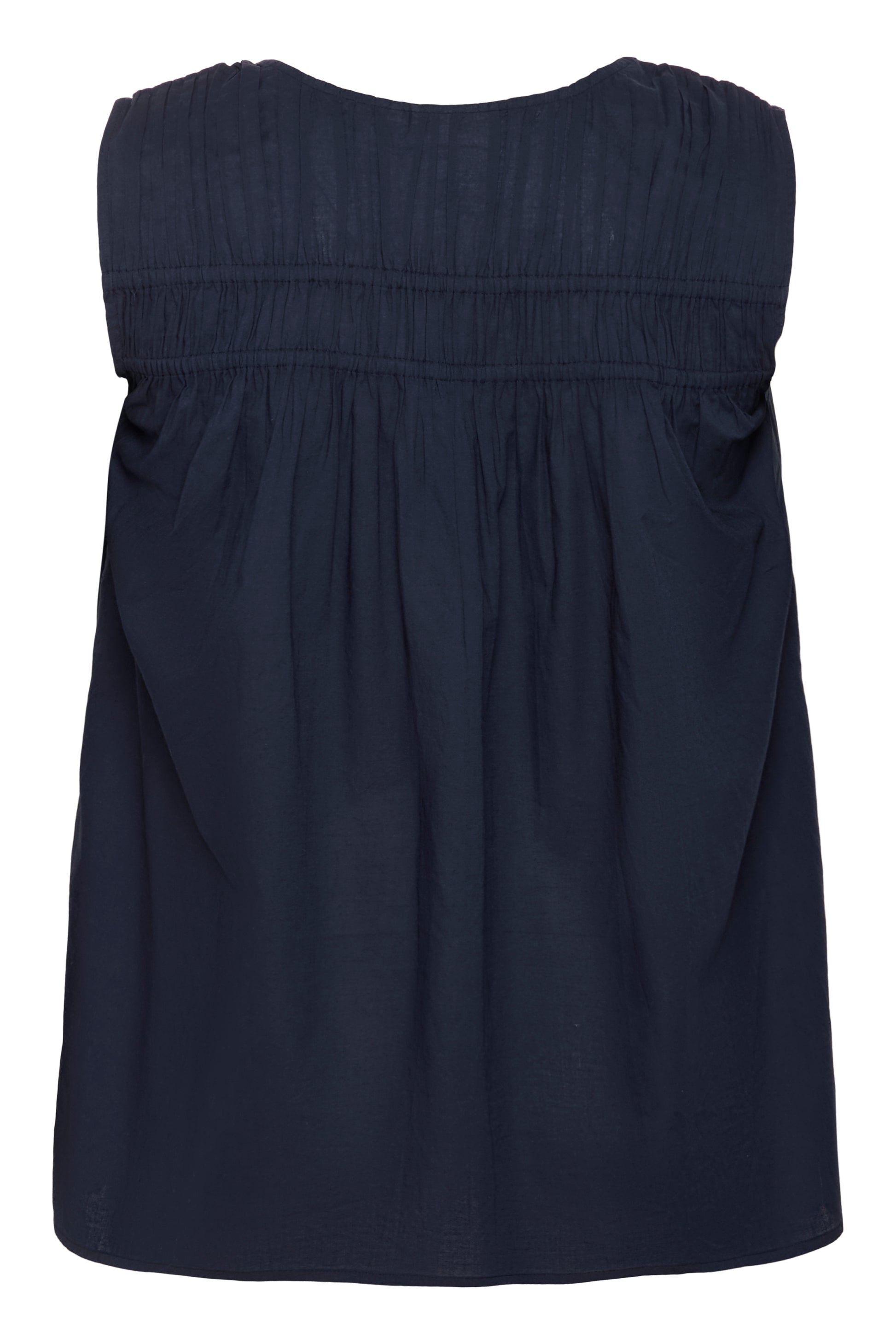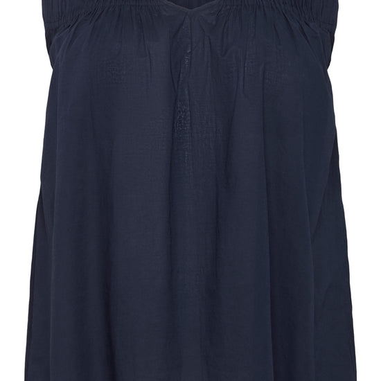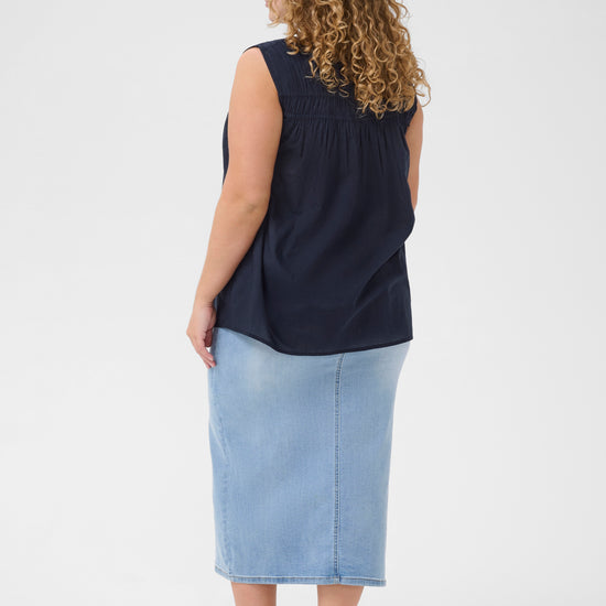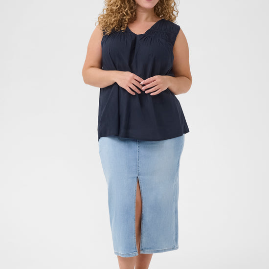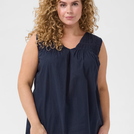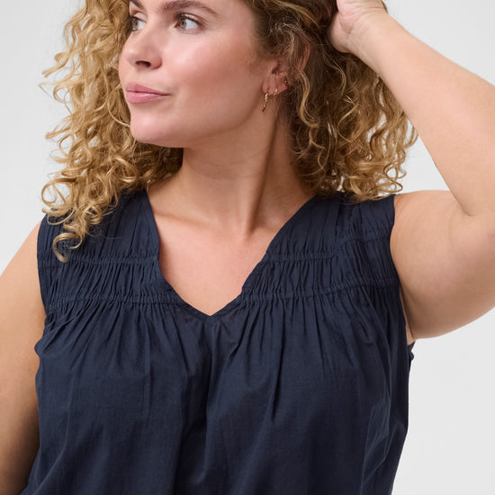 Opplev en perfekt kombinasjon av stil og komfort med denne ermeløse blusen fra Kaffe Curve. Laget av 100% bomull, gir denne blusen en lett og pustende følelse som er ideell for både hverdagsbruk og spesielle anledninger. Den er tilgjengelig i de vakre fargene Grenadine og Midnight Marine, som gir et elegant preg til enhver garderobe.