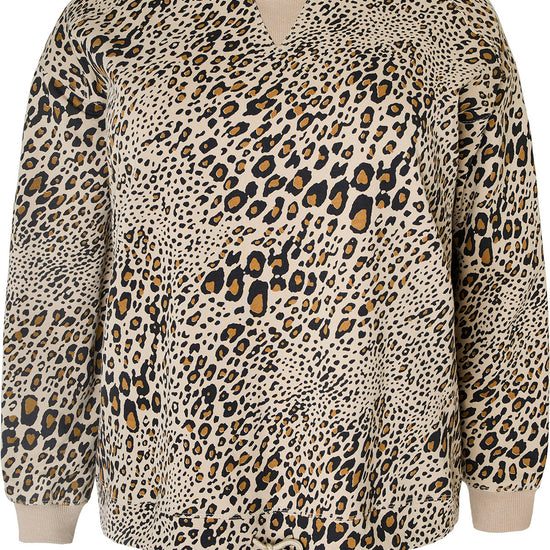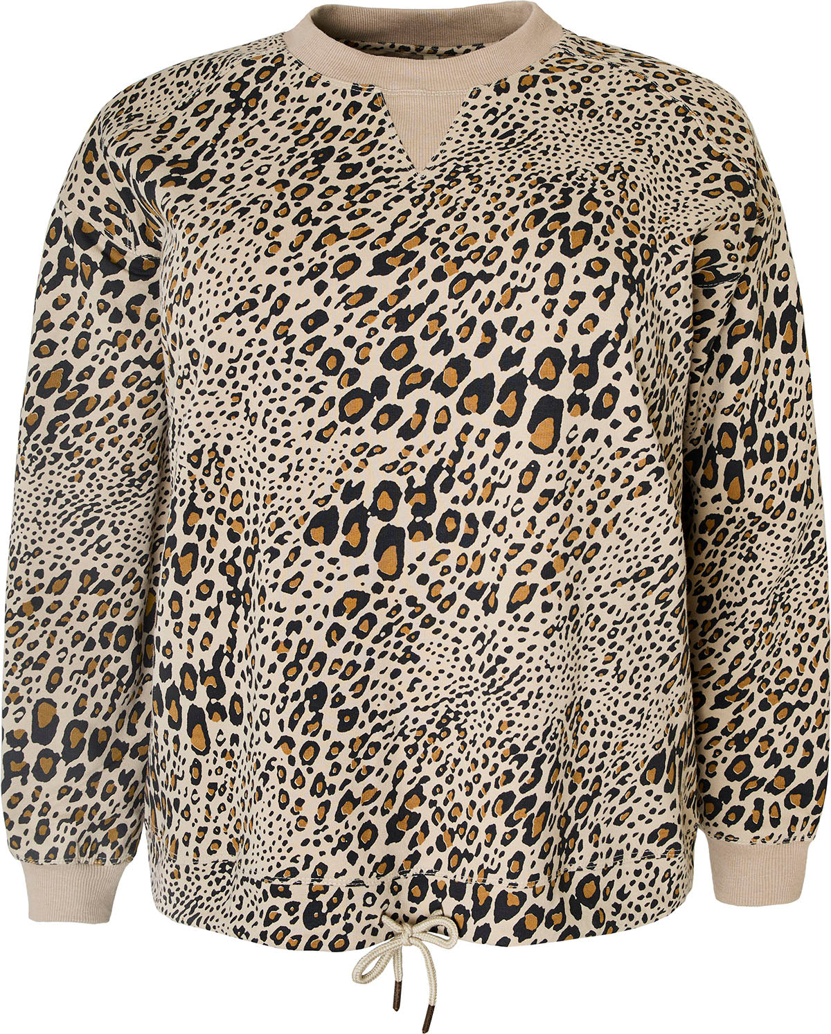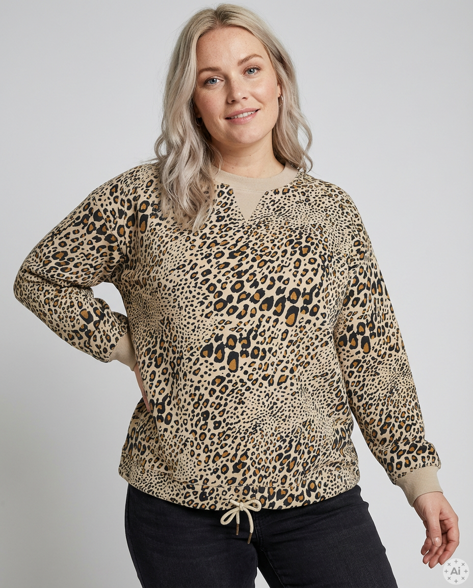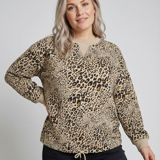 Denne flotte modellen fra Cassiopeia er perfekt for deg som liker mønstre og god komfort. Genseren er laget i en myk bomullskvalitet og prydes av et flott dyreprint i sandfargede og sorte nyanser som gir et livlig uttrykk.