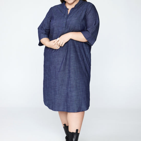 Opplev eleganse og komfort i denne vakre kjolen fra NO. 1 BY OX, laget av 100 % bomull. Den blå denimfargede kjolen har en avslappet og klassisk stil, perfekt for både hverdagsbruk og mer formelle anledninger. Designet med rund hals og v-åpning, samt enkle knapper foran, gir kjolen et elegant preg som gjør den både tidløs og moderne.