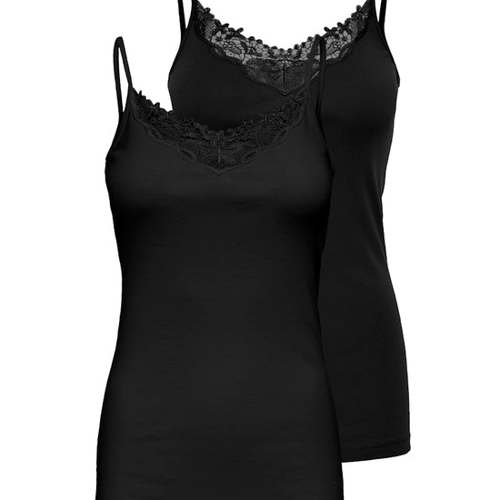 Dette settet inneholder to elegante sorte topper som forener klassisk komfort med et feminint uttrykk. De har delikate blondekanter ved halsen, rund halsutskjæring og er ermeløse – perfekt til både lag-på-lag og som selvstendige topper i hverdagen.