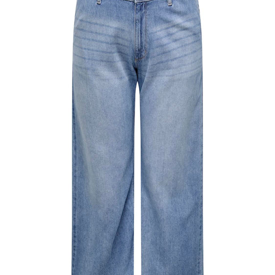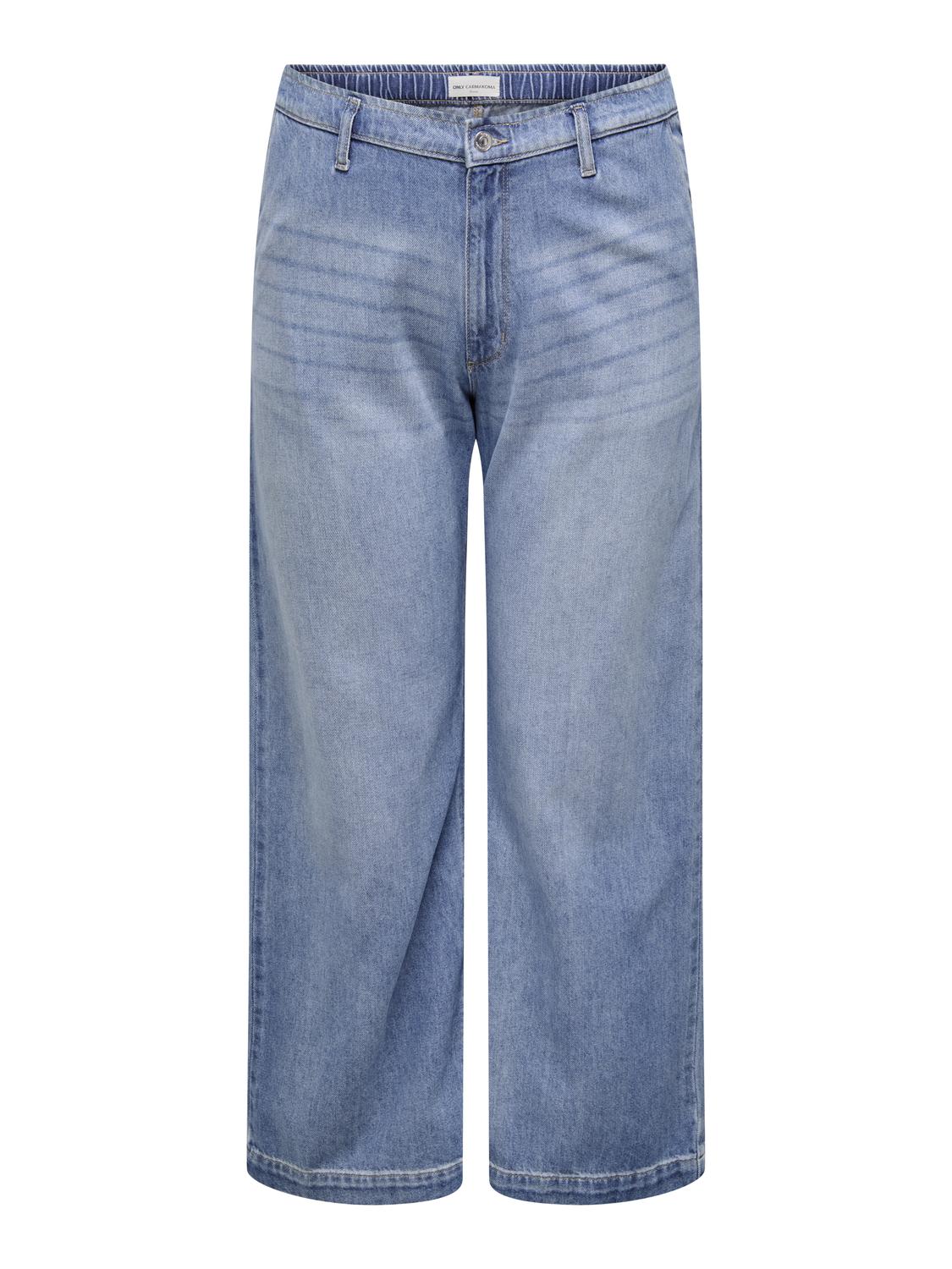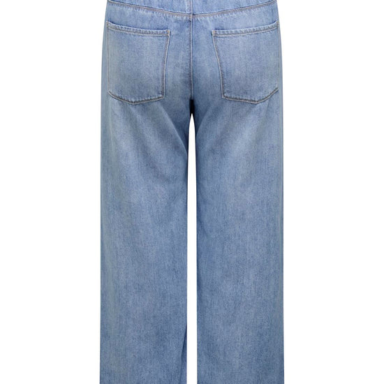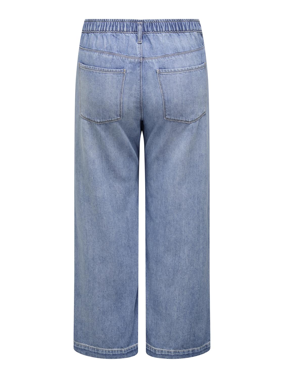 Disse brede jeans med midt talje er designet med fokus på komfort, og giver masser af plads fra hoften til anklen. Den lyse blå denim har bæltestropper og en lukning med hægte og lynlås, hvilket gør dem både praktiske og stilfulde. Materialerne kombinerer bomuld med genanvendt bomuld, som hjælper med at spare natur-ressourcer og reducere mængden af tekstilaffald.