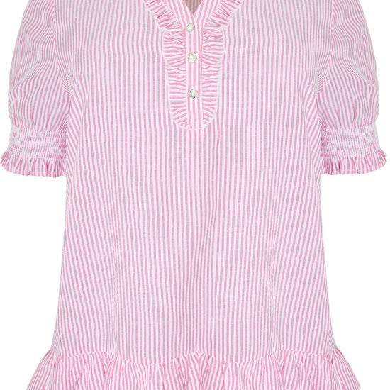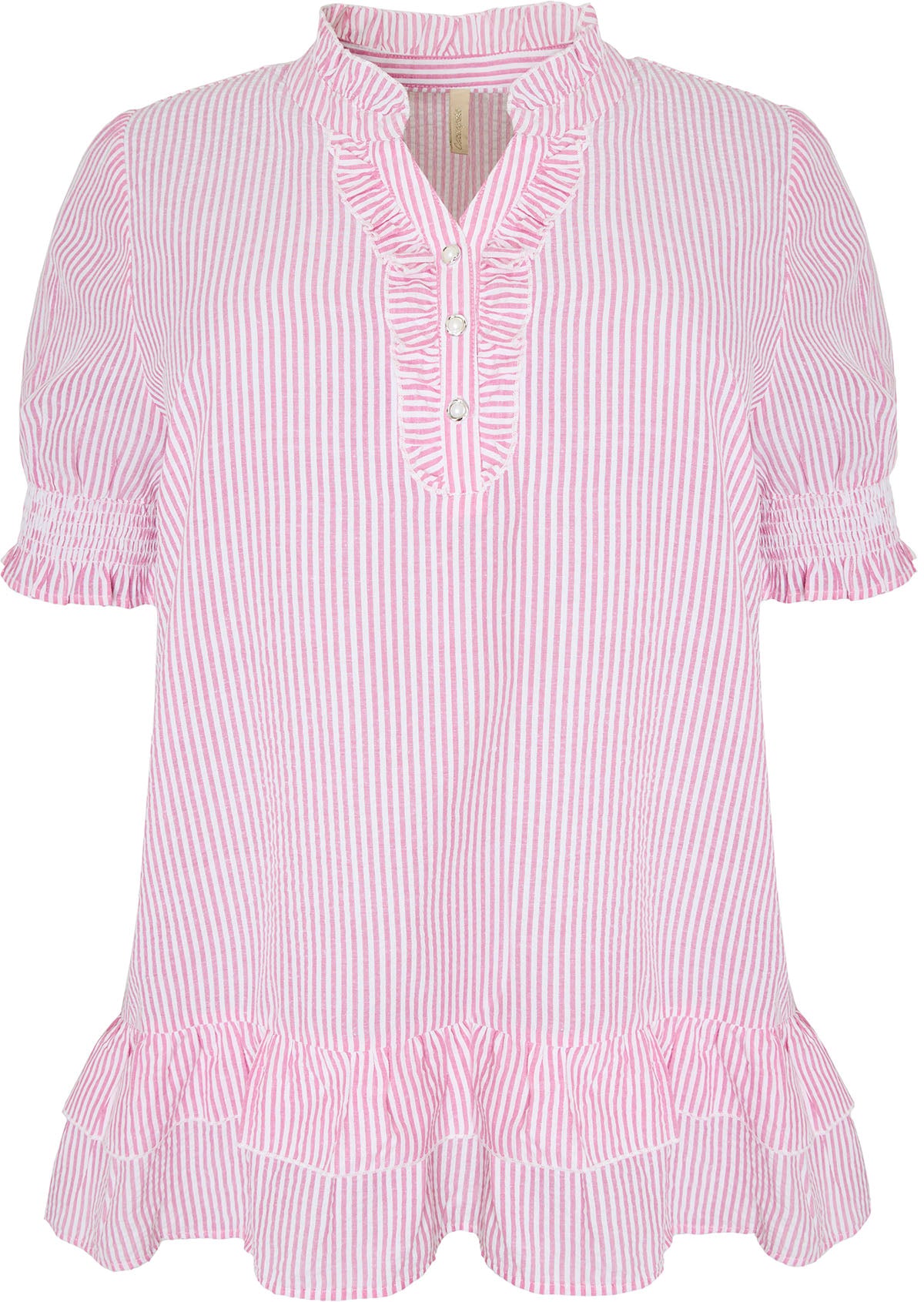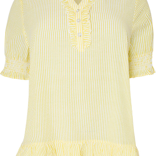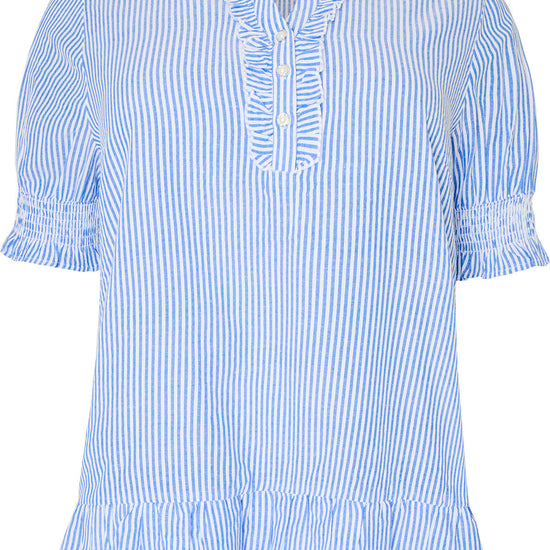 Blusen har et elegant snitt med fine volangdetaljer ved kragen og mansjettene, som gir et feminint preg. Den avslappede passformen gjør den perfekt til både hverdagsbruk og mer formelle anledninger. Kombiner den med dine favorittjeans eller et skjørt for en stilig look.