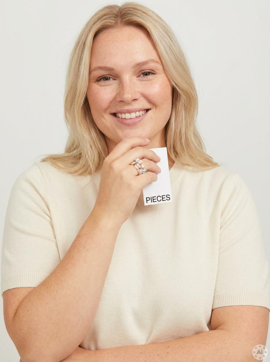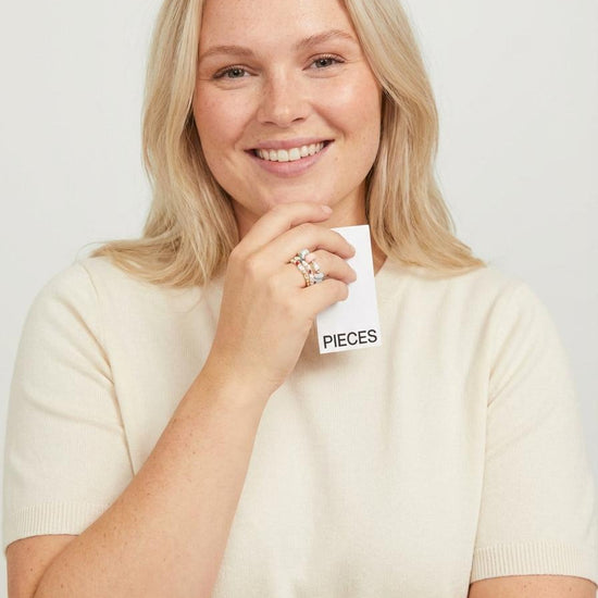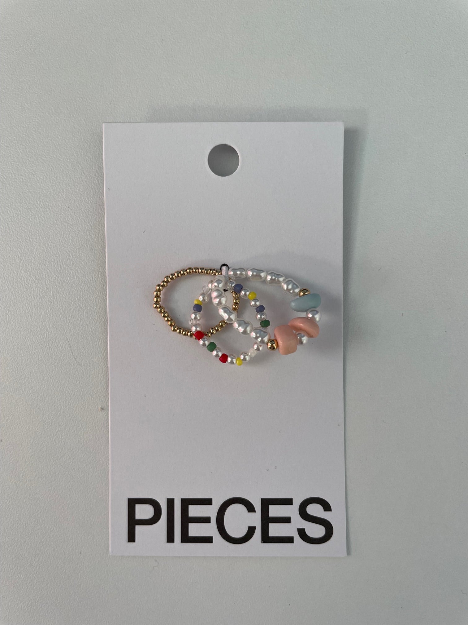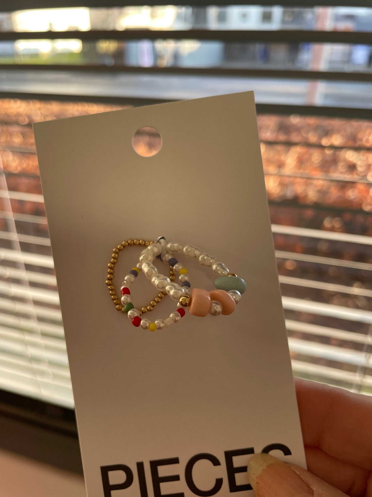 Her får du en søt pakke med tre forskjellige fingerringer fra Pieces, som tilfører et feminint og fargerikt preg til antrekket ditt. Settet kombinerer vakre gulltoner med perler, noe som gir et lett og lekent uttrykk til hendene dine.
