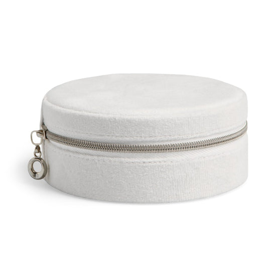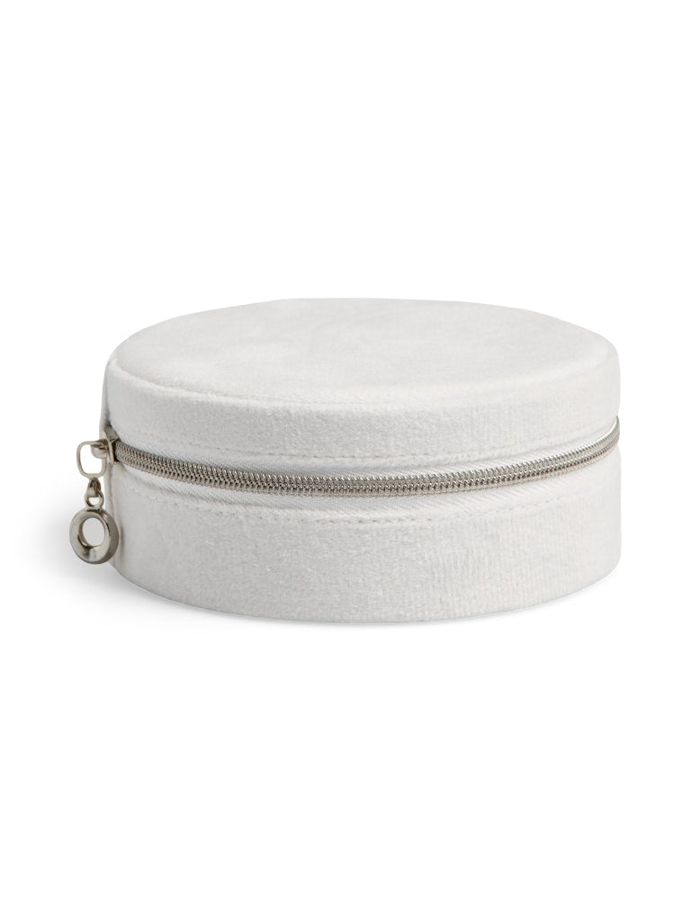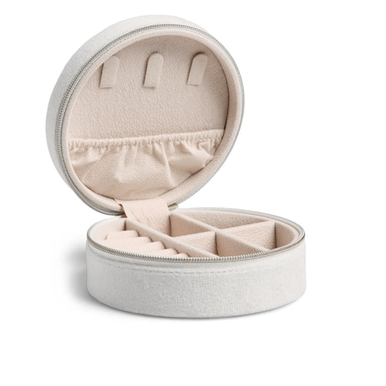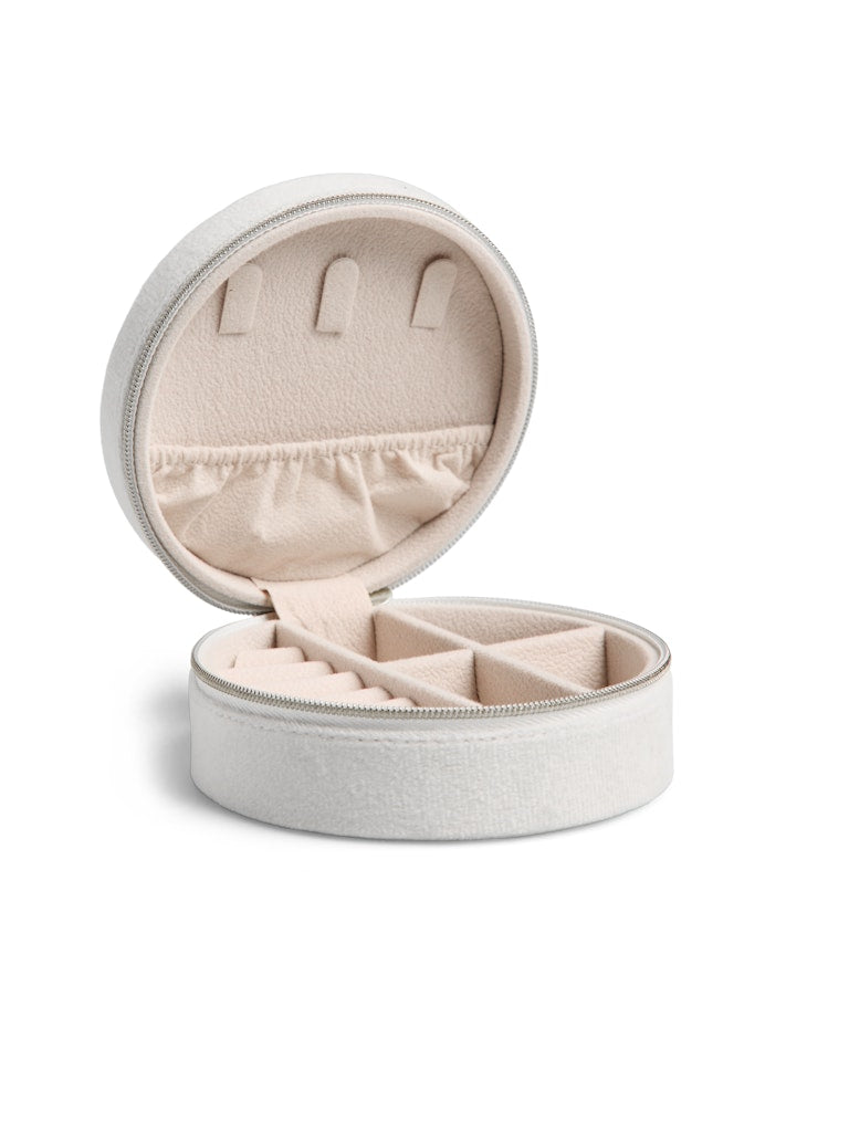 Dette runde smykkeskrinet fra Pieces forener funksjonalitet med et elegant uttrykk i en vakker, lys grå nyanse som passer inn i enhver innredning. Med sin kompakte størrelse er det ideelt til å passe på dine verdisaker, og den myke overflaten gir et eksklusivt uttrykk, mens den solide glidelåsen holder alt sikkert på plass.