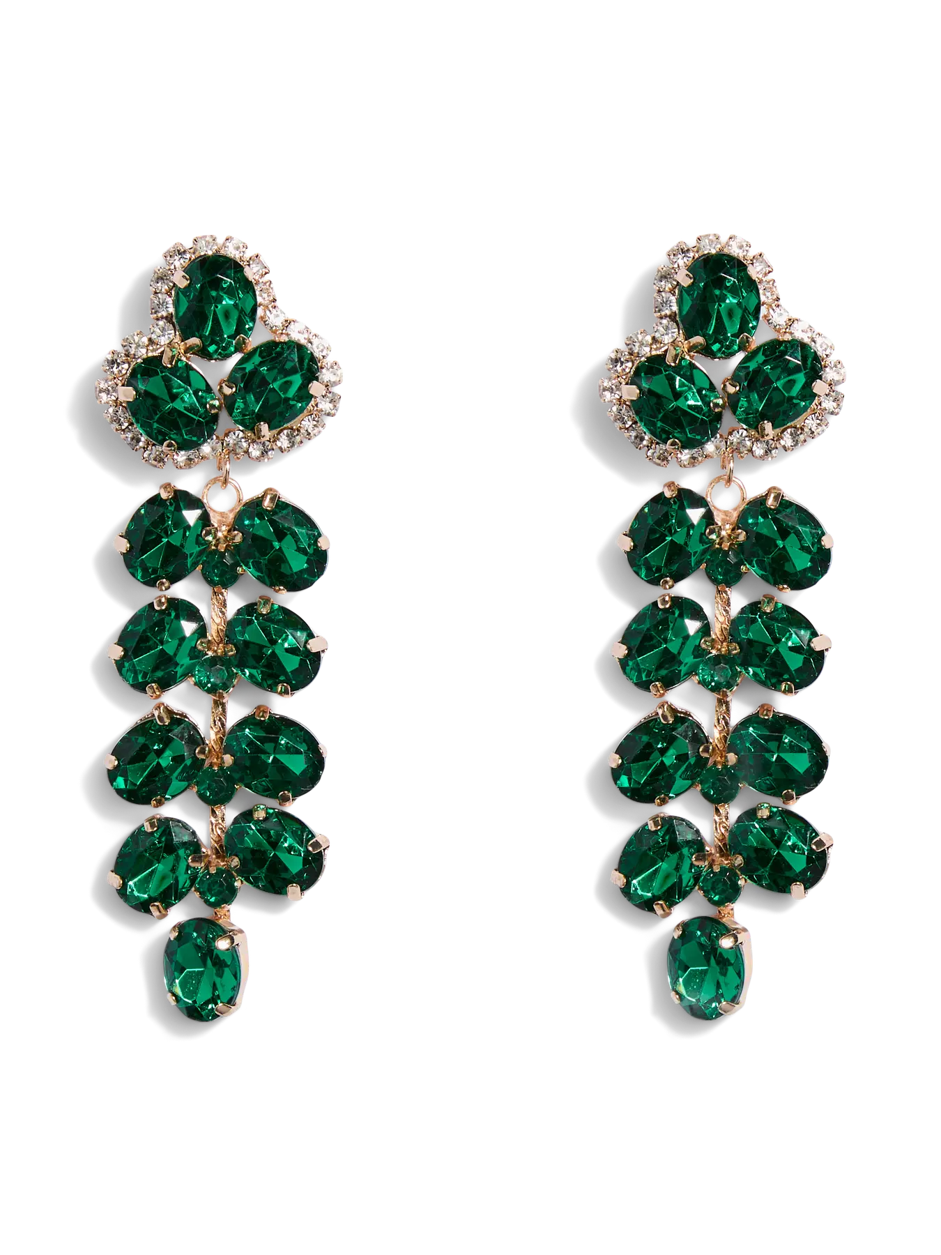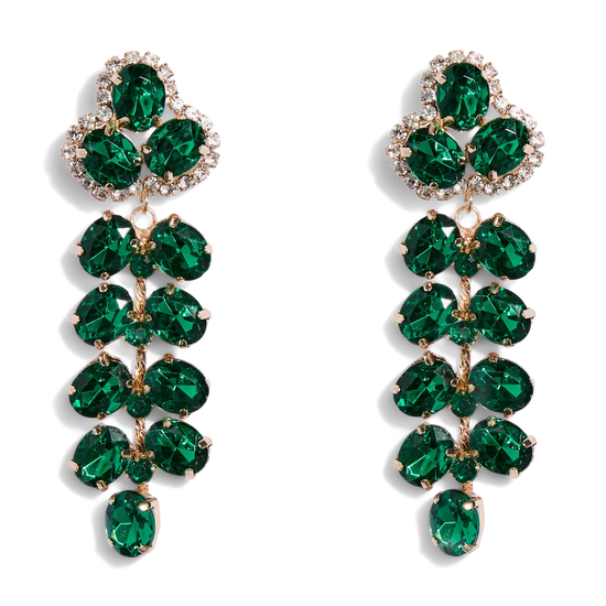 Gjør antrekket ditt helt spesielt med disse fantastiske øredobbene fra merket Pieces, som garantert vil tiltrekke seg beundrende blikk. Smykkene er designet som et par imponerende hengesmykker, hvor dype, smaragdgrønne fasetterte steiner er vakkert arrangert i en lang klynge som faller elegant. Den varme, gullfargede innfatningen danner en flott kontrast til det grønne og binder hele det glamorøse designet sammen på fineste vis.