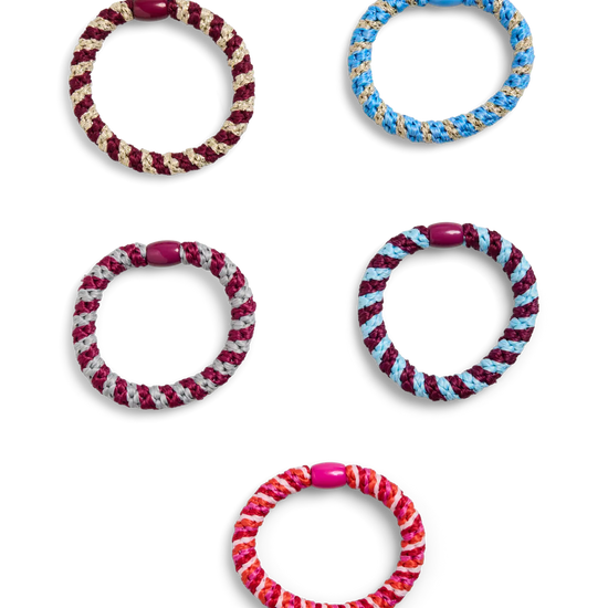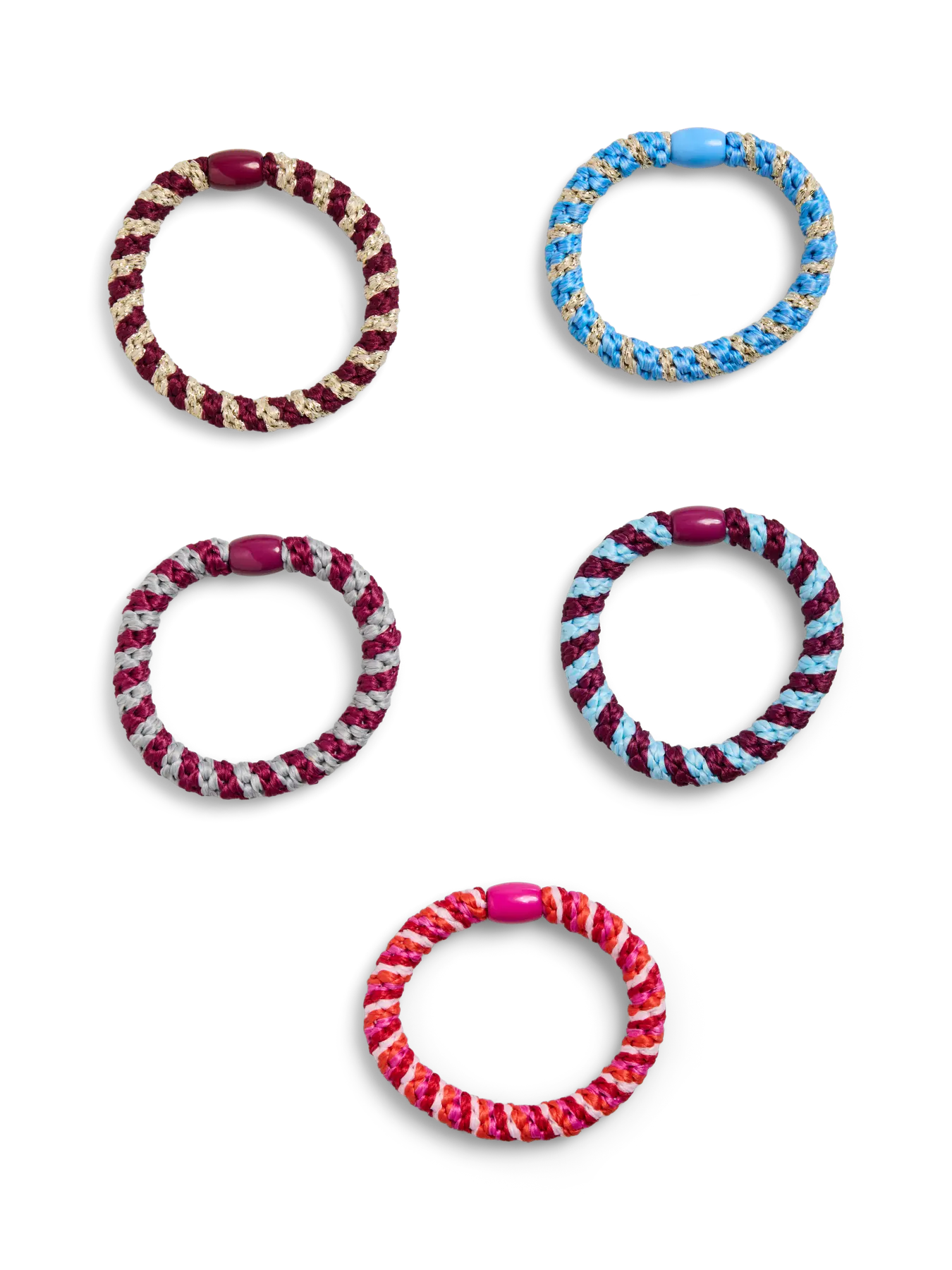 Gi frisyren et løft med disse dekorative hårstrikkene fra Pieces, som kommer i en praktisk pakke med fem stykk. Hver strikk har en unik flettet struktur i ulike fargekombinasjoner, vevd sammen med skinnende gull- eller sølvtråder. De er samlet med en liten perle i matchende farge for en fin avslutning. Du finner enkelt nytt hårtilbehør til samlingen her, da designet kombinerer både funksjonalitet og estetikk.