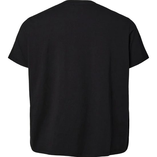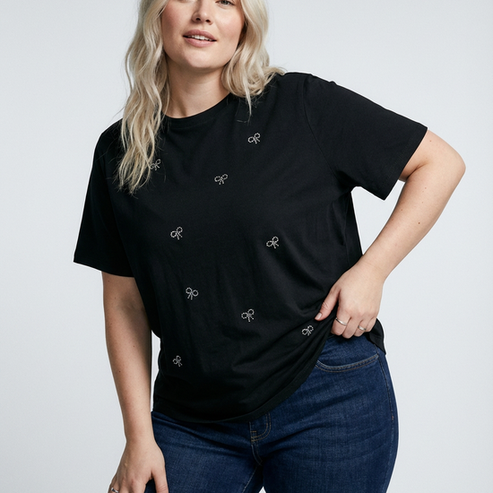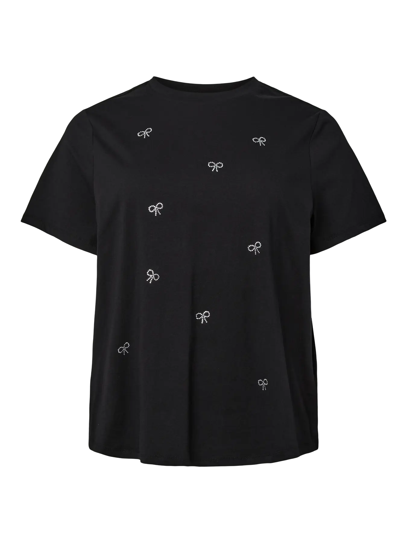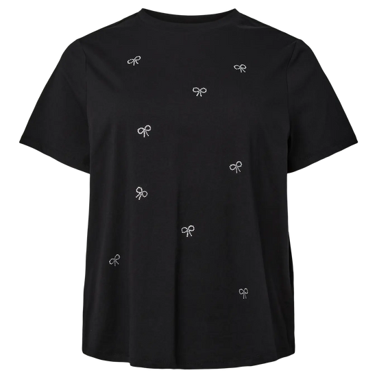 De glitrende rhinstenene er formet som små sløyfer som ligger spredt over den svarte bakgrunnen for et elegant uttrykk. Dette gir t-skjorten et unikt preg som enkelt kan styles opp eller ned sammen med et par plus size jeans.