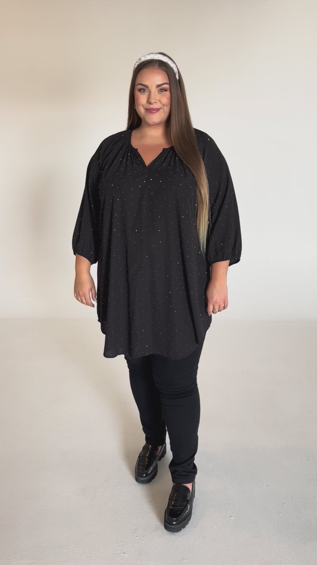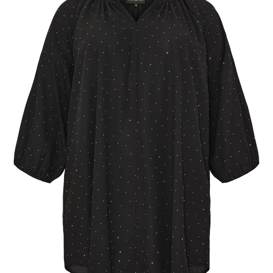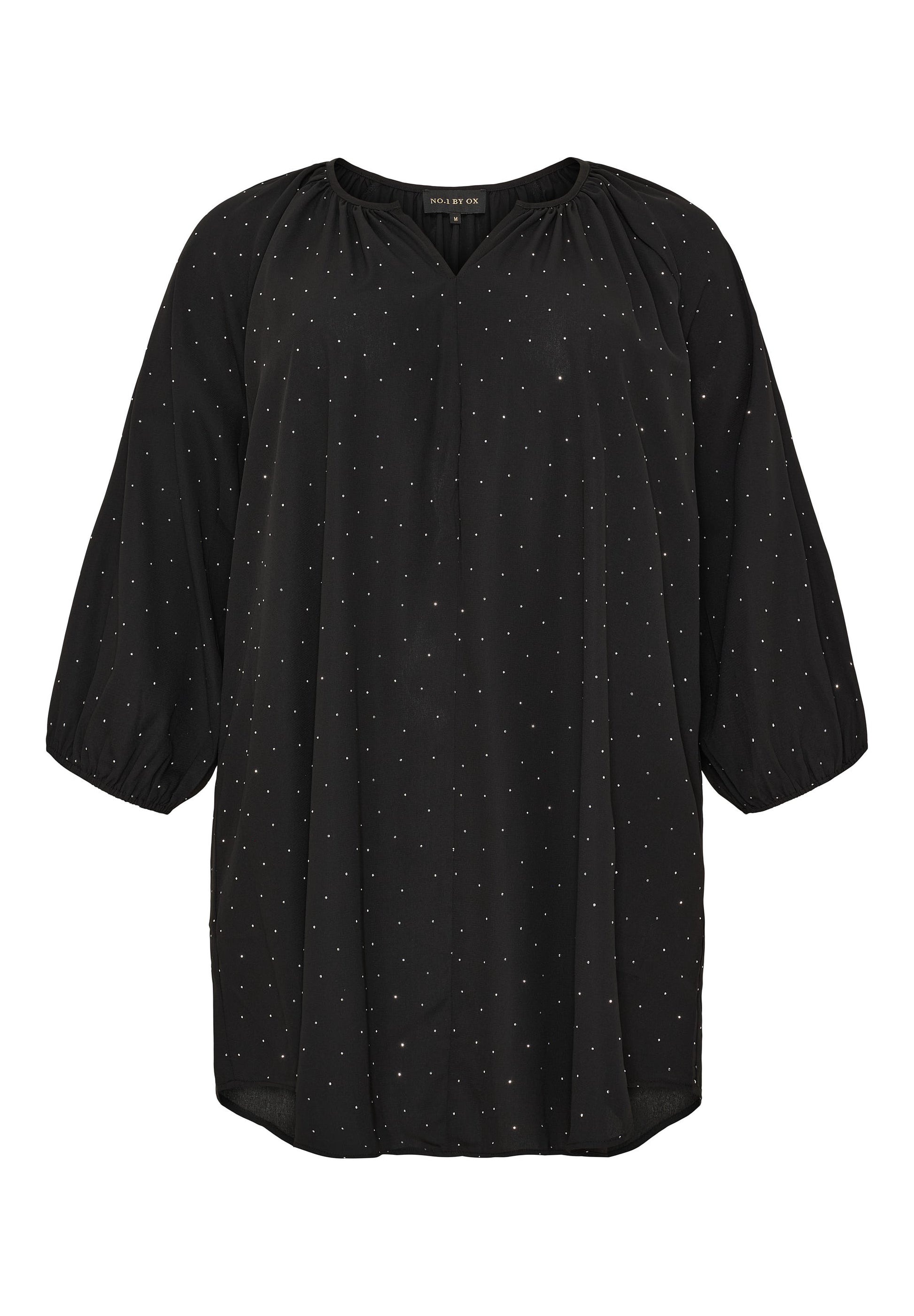 Forny garderoben med denne elegante tunika fra NO. 1 BY OX. Modellen er laget i 100% polyester og har en løs, behagelig passform med klassiske snitt. Rund hals med v-åpning, 3/4 ermer og funklende sølvstener gir tunikaen et eksklusivt uttrykk.