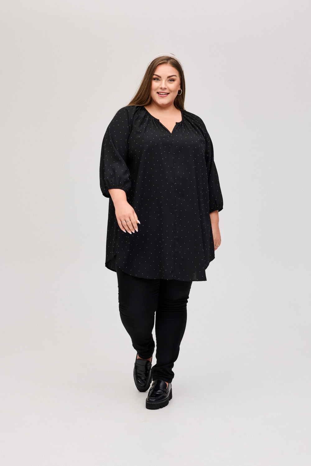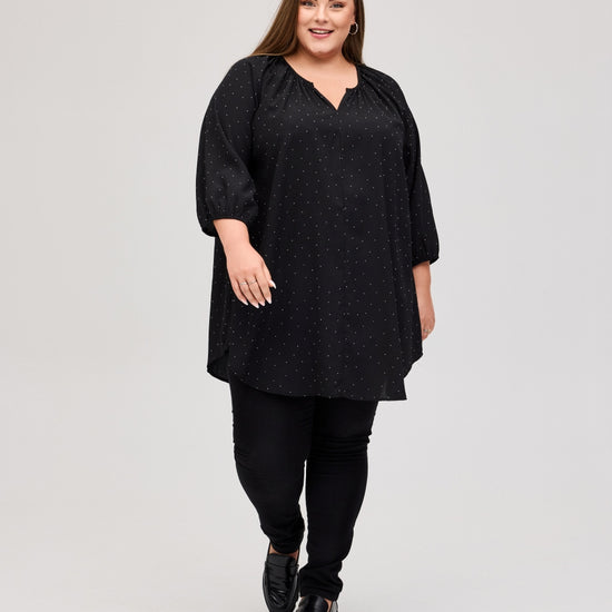 Den svarte tunikaen passer til enhver anledning og er enkel å style med et par plus size leggings eller plus size bukser. Velg mellom størrelser fra S (42-44) til XL (54-56) og opplev en flatterende og komfortabel silhuett.