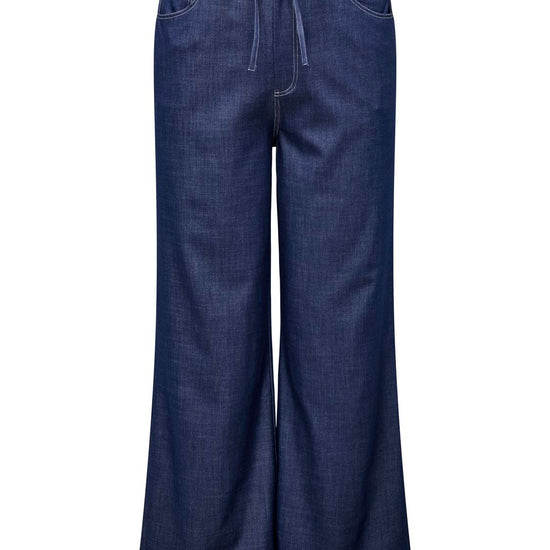 Disse bukser i en vid ben-fit kombinerer komfort og stil på en elegant måde. Farven Naval Academy med kontraststikninger giver et unikt og moderne look, mens det medfølgende bælte og bæltestropper sikrer en god pasform og et gennemført udtryk. Bukserne er lavet af en blød og bæredygtig blanding af genanvendt polyester, viscose og elastan, hvilket giver både fleksibilitet og holdbarhed. Med knap- og lynlåslukning samt frontlommer er de praktiske og nemme at bruge til hverdagsbrug.