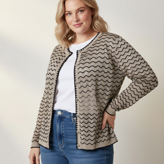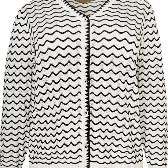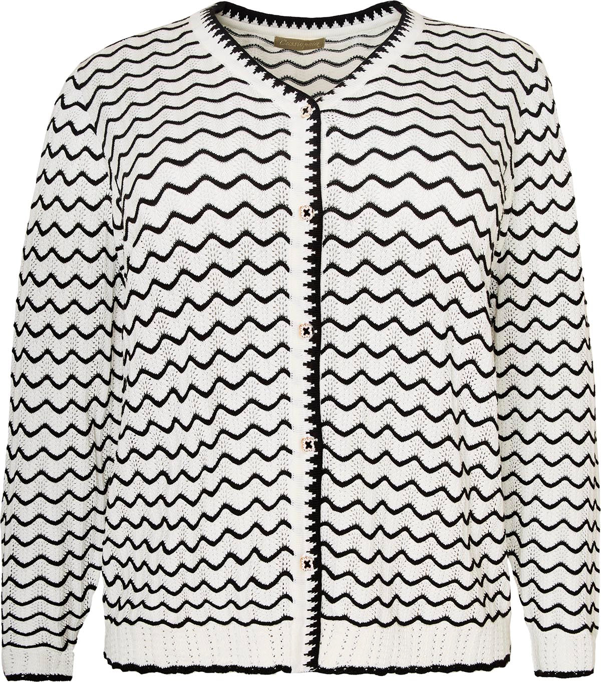 Denne strikkede cardigan fra Cassiopeia gir garderoben et løft med sitt flotte zigzag-mønster i sorte toner på enten latte combi eller off white combi bakgrunn. Den myke materialeblandingen av 58% bomull og 42% viskose føles behagelig mot huden og gir god pusteevne. Klassisk, rett passform og lange ermer gjør den til et allsidig valg for både hverdag og lag-på-lag styling.