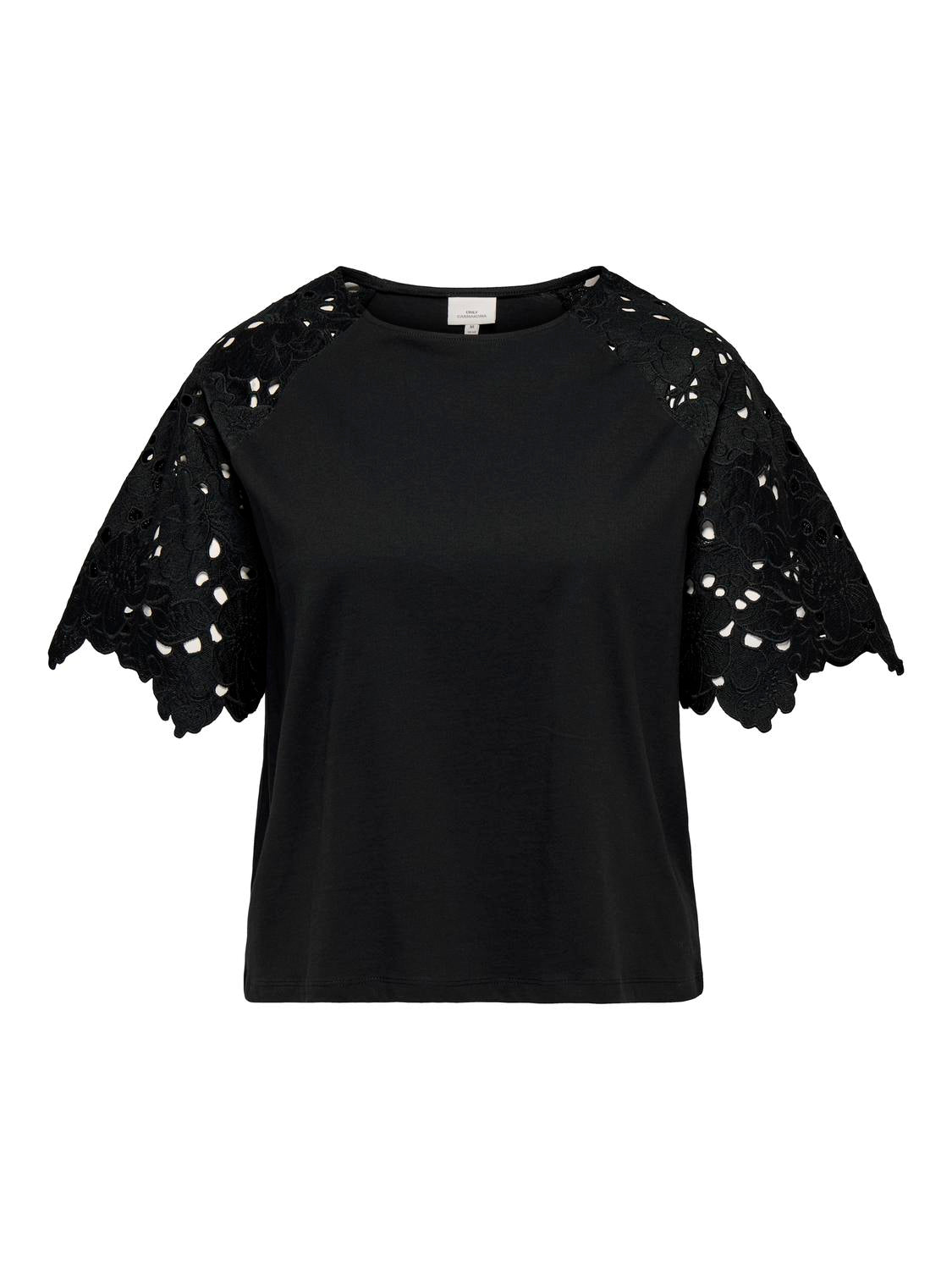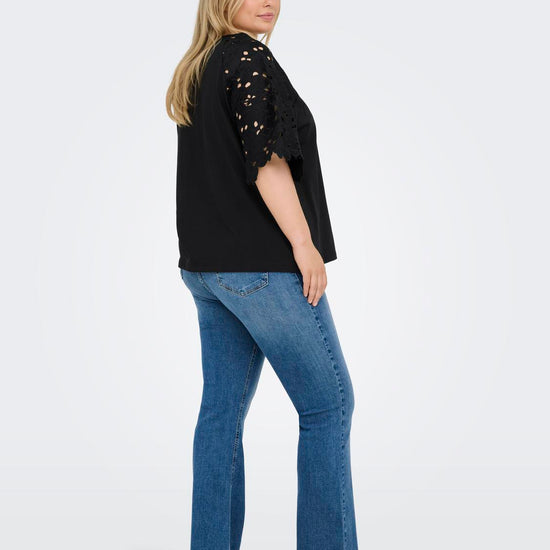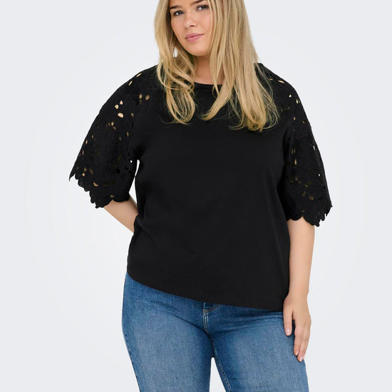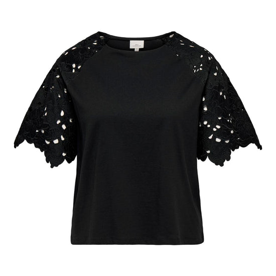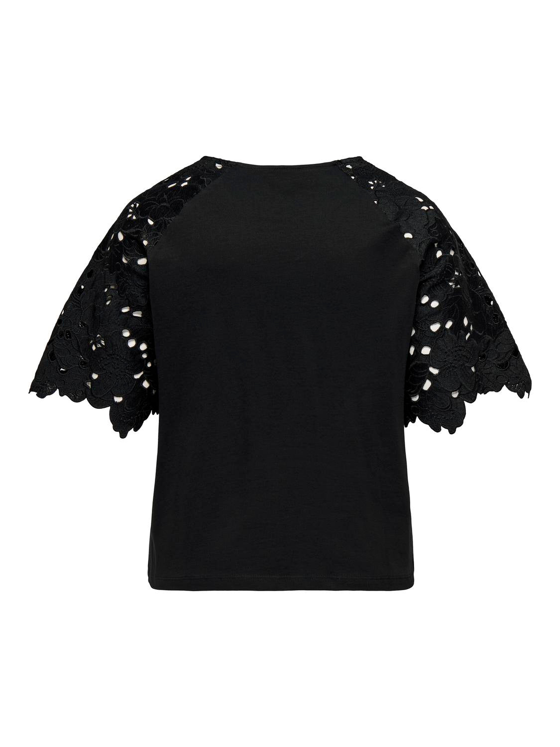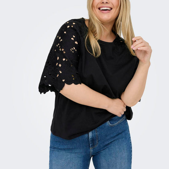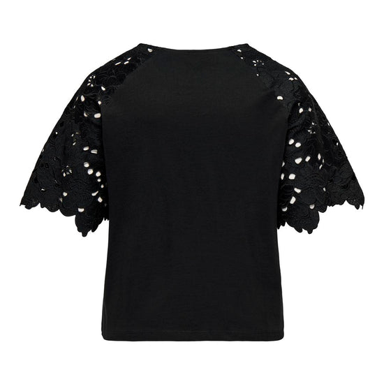 Dette bløde sortfarvede top er skabt i 100% bomuld, som giver en behagelig og åndbar oplevelse hele dagen. Den har en rund hals og korte ærmer med volumen, som tilføjer en feminin og let detalje til det enkle design. Broderie anglaise-detaljen giver et subtilt, dekorativt præg, der løfter det klassiske look uden at overdrive.