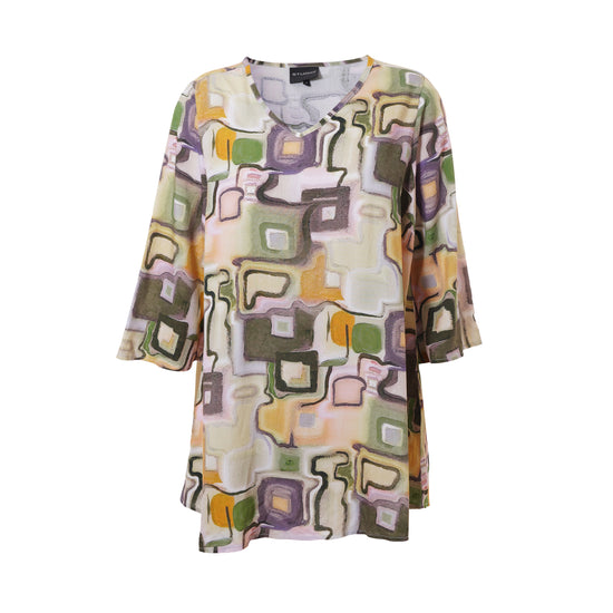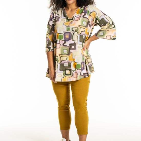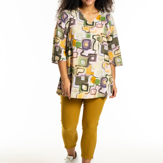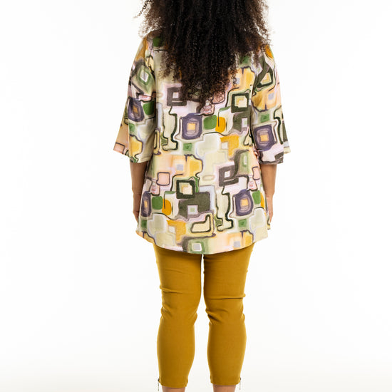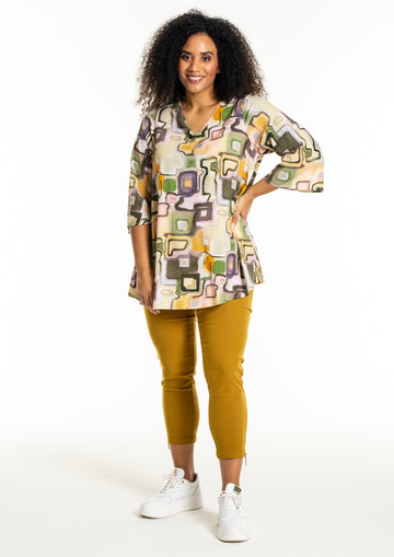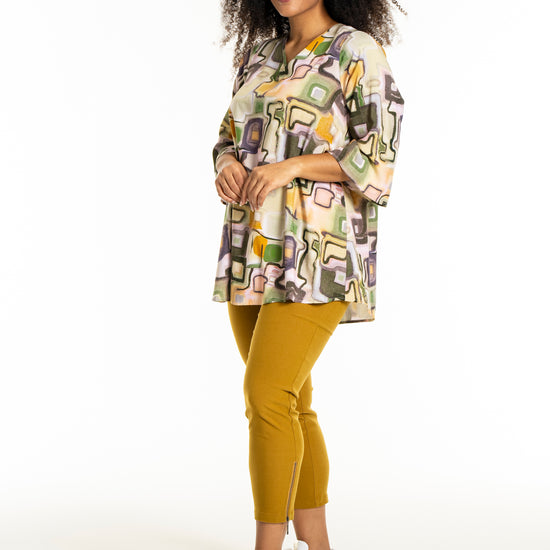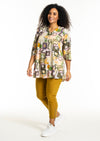Opplev den perfekte kombinasjonen av stil og komfort med denne vakre tunikaen fra Studio. Designet med et iøynefallende miks mønster i grønne nyanser, er denne tunikaen ideell for deg som ønsker å tilføre et snev av kunstnerisk stil til garderoben din. Laget av 100% viskose, sikrer den lette og luftige kvaliteten at du føler deg komfortabel hele dagen.