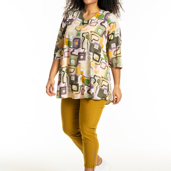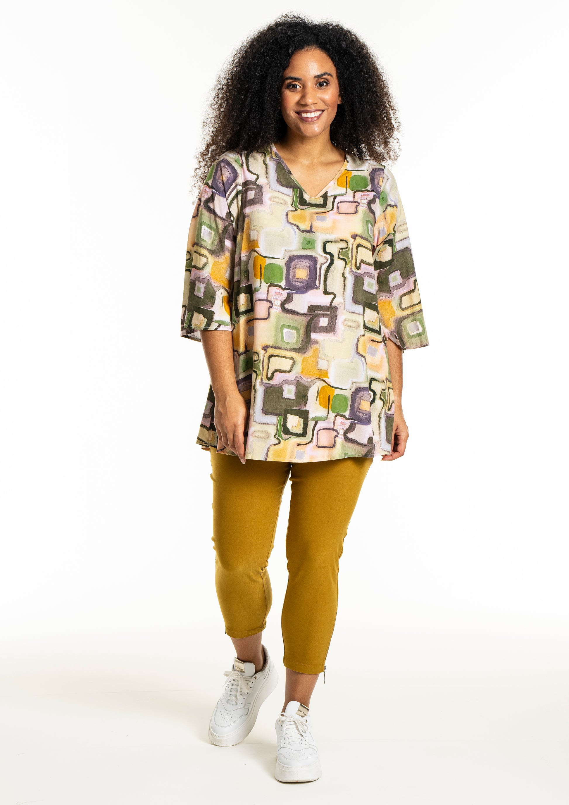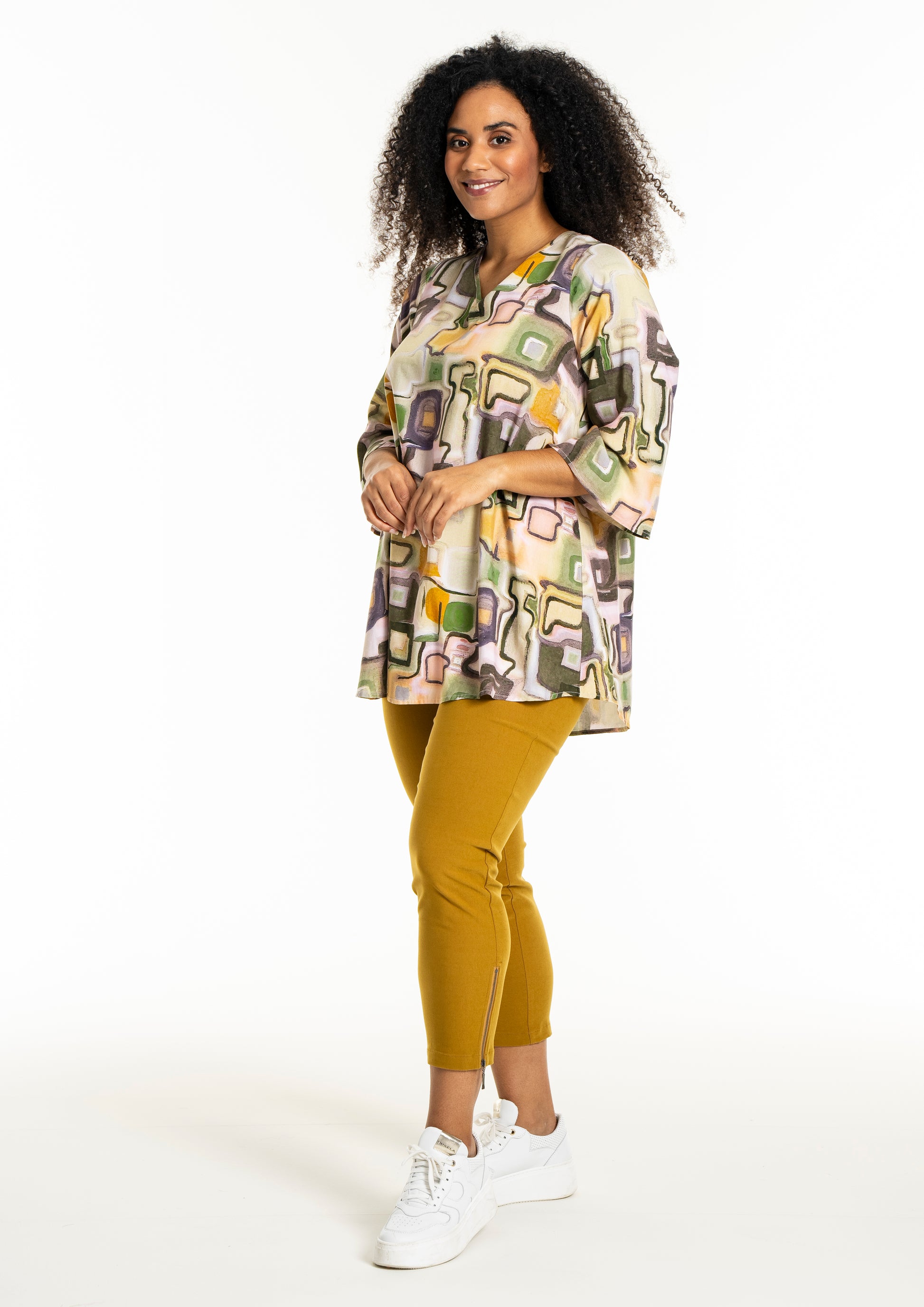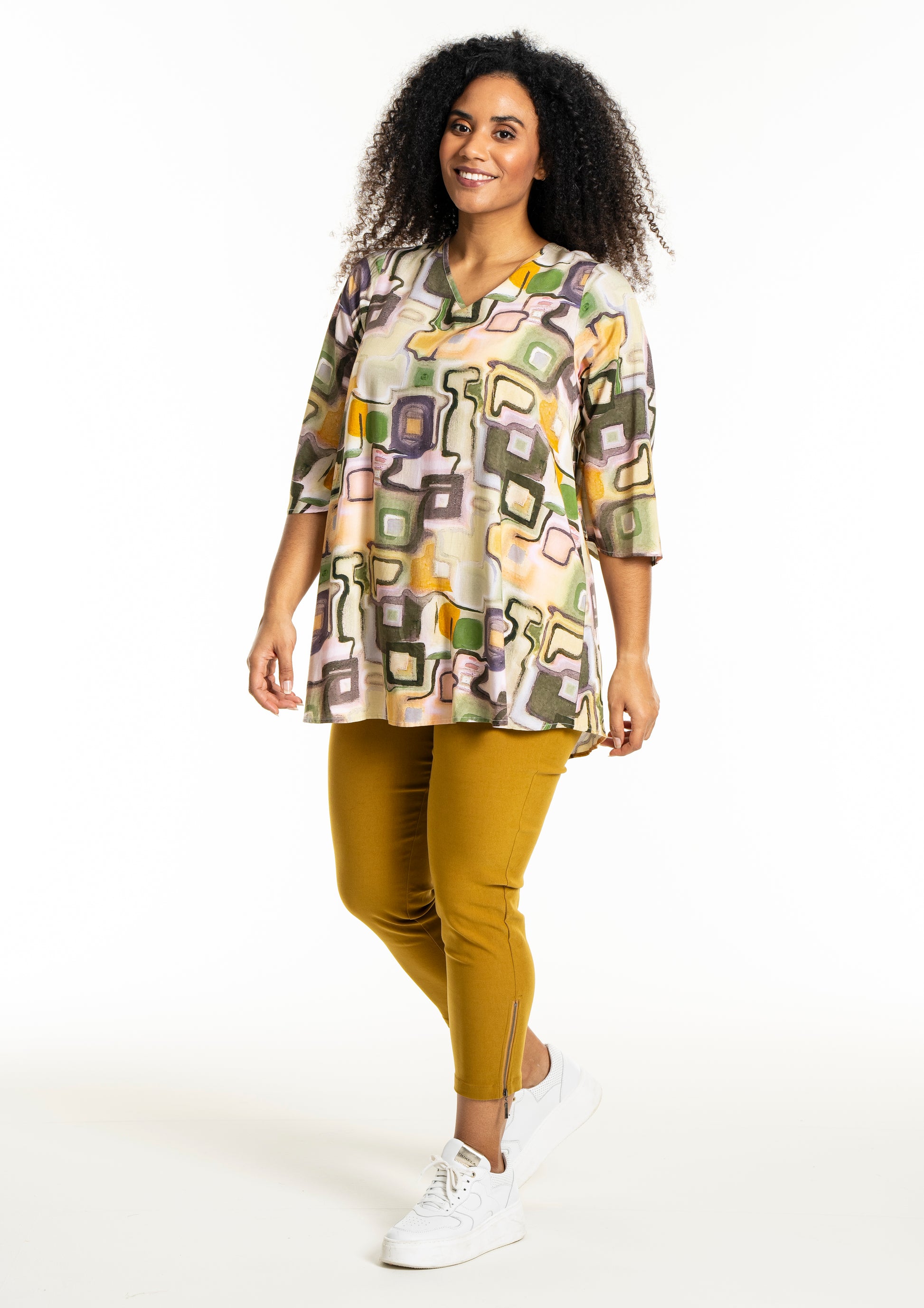 Den V-formede halsutskjæringen og trekvartlange ermer gir tunikaen et moderne og feminint uttrykk, som passer perfekt til både hverdag og avslappede anledninger. Kombiner den med et par leggings eller jeans for et komplett utseende. Se flere stilige plus size tunikaer eller utforsk vårt utvalg av bluser for flere inspirerende muligheter.