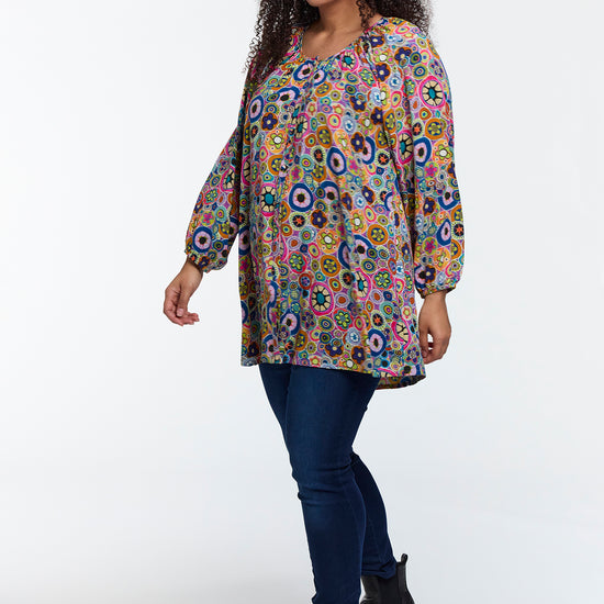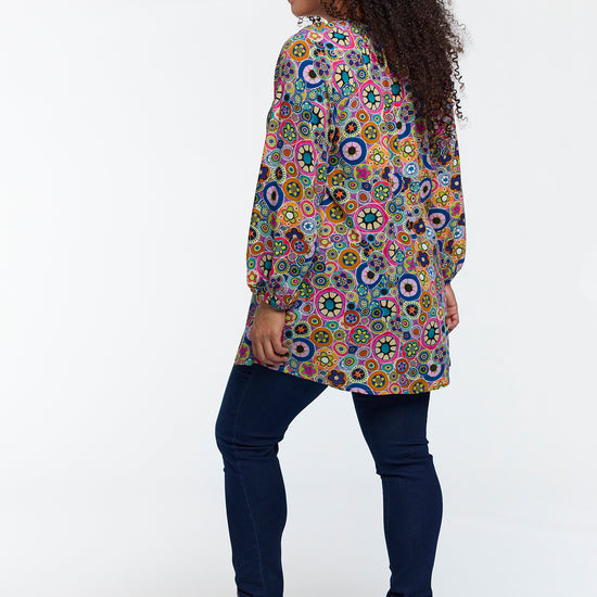 Studio leverer her en tunika i 100% viskose med et iøynefallende sirkelmønster i blå, grønne, rosa og hvite toner. Modellen har en løs, lett A-formet silhuett, rund hals og lange ermer med elastisk avslutning som gir bevegelsesfrihet og en feminin look.