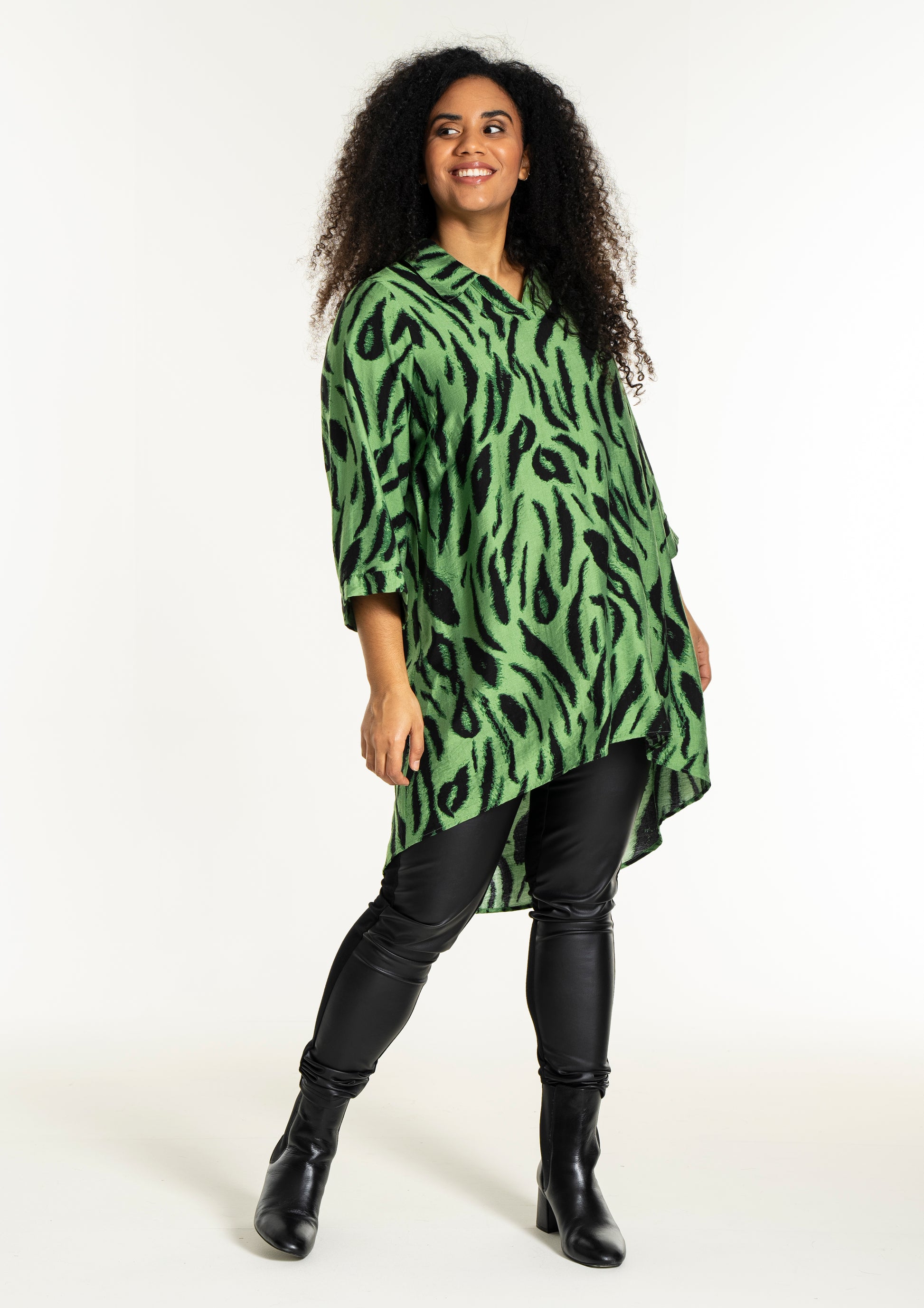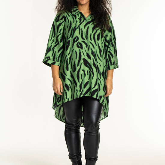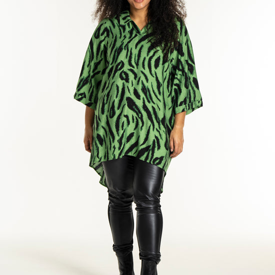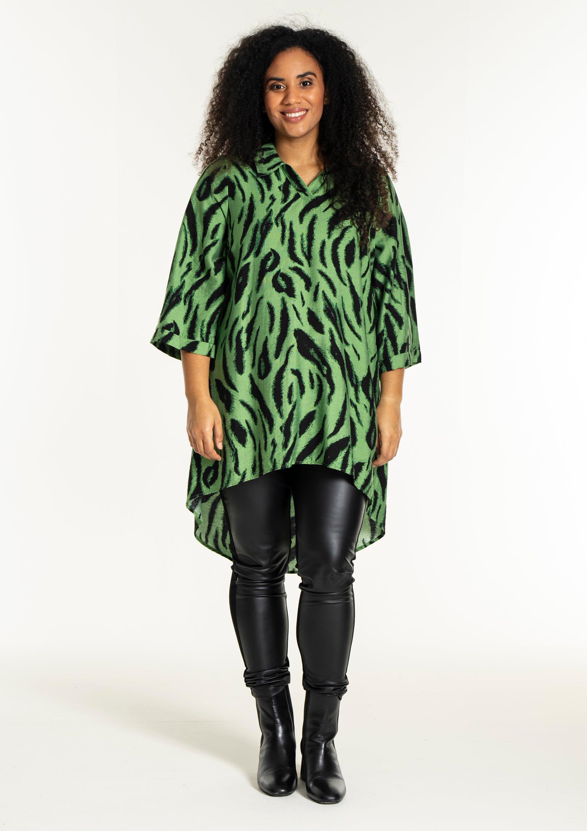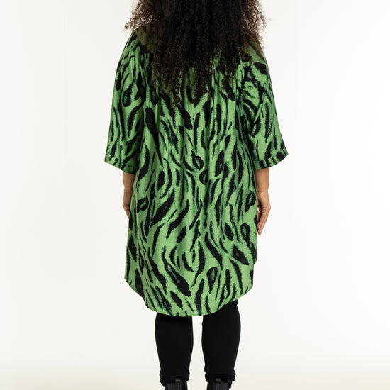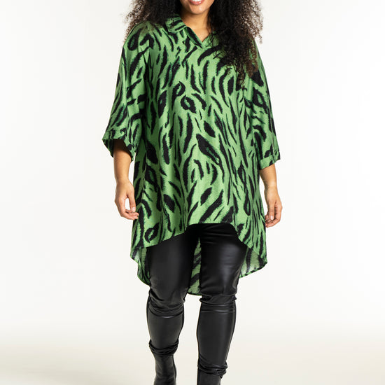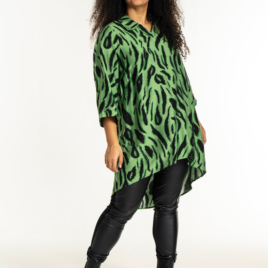 Opplev den vakre tunikaen fra Studio som kombinerer stil og komfort i ett fantastisk design. Med et slående sort penselstrøkmønster på en lys grønn bakgrunn, tilfører denne tunikaen et kunstnerisk preg til garderoben din. Designet er løst og avslappet, hvilket gir en vakker drapering. Det myke materialet består av 85% viskose og 15% nylon, som sikrer både letthet og en anelse struktur.
