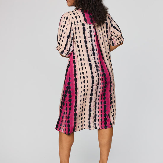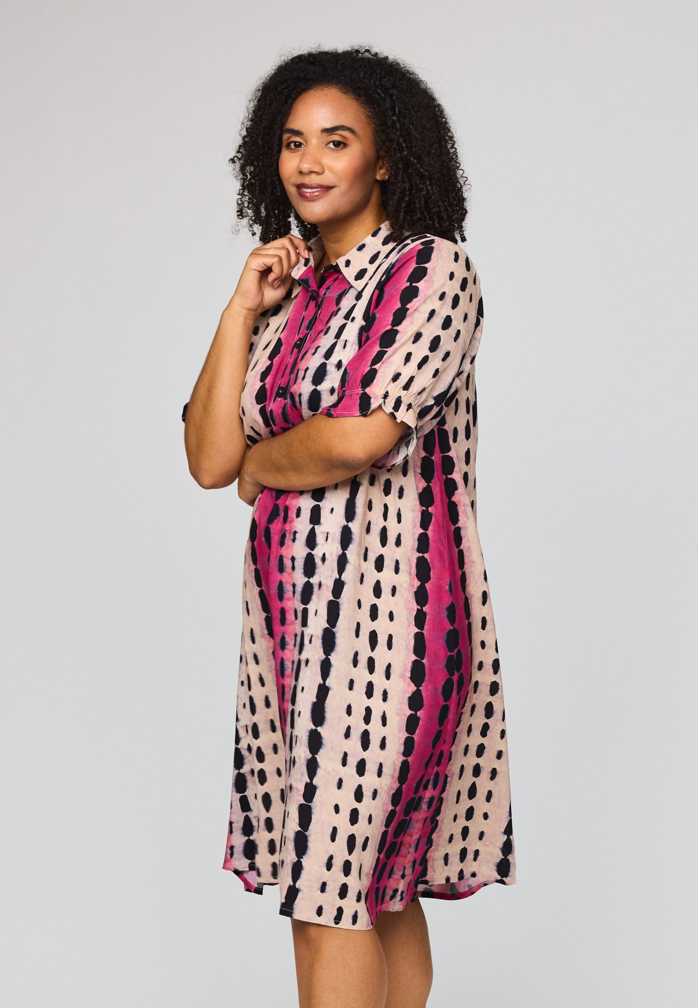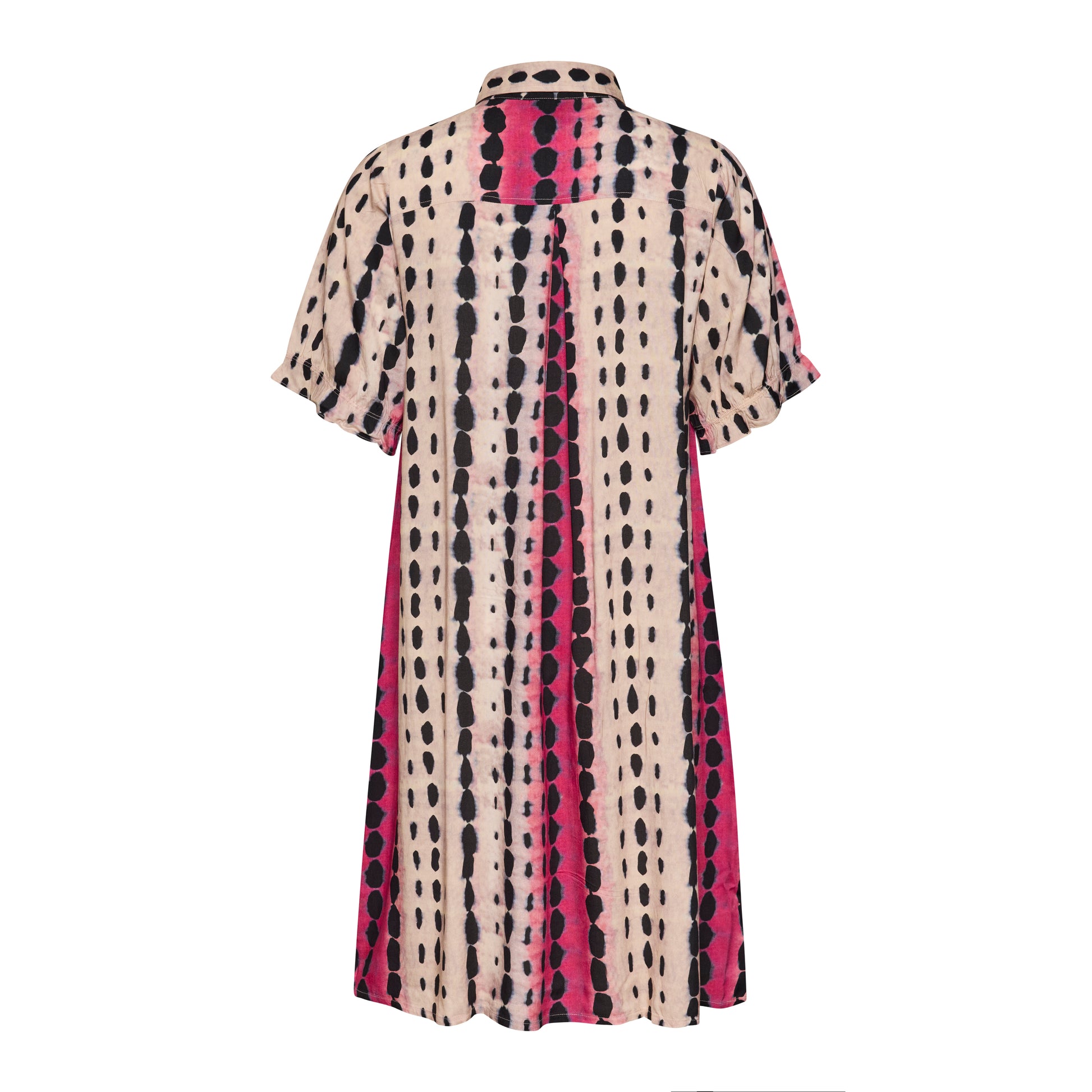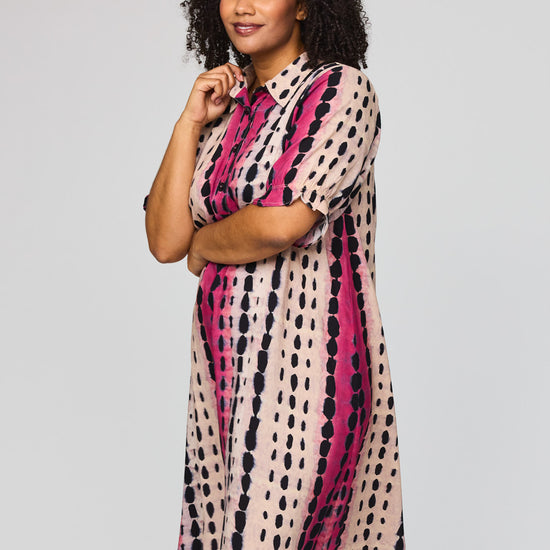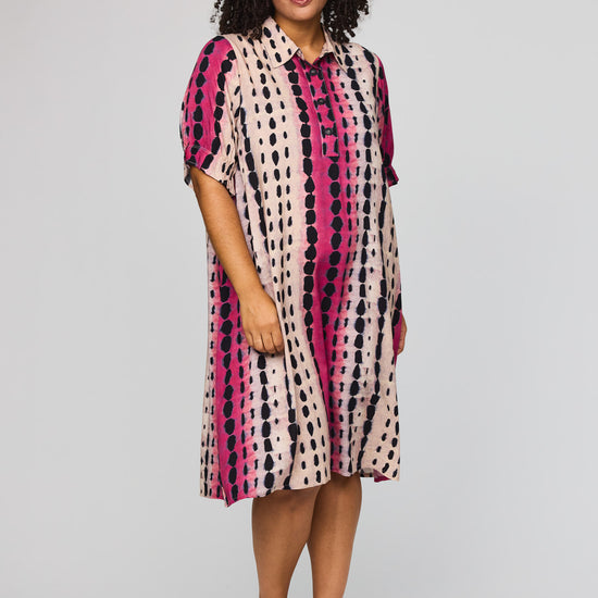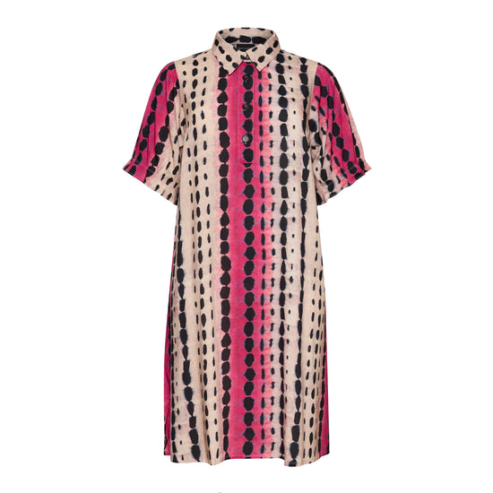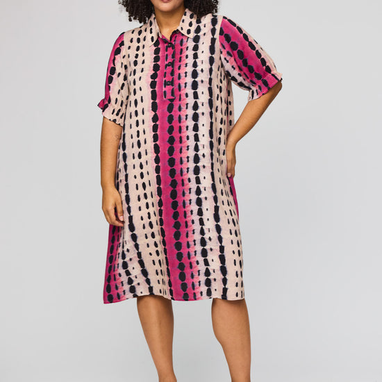 Denne vakre kjolen fra Studio kombinerer et avslappet snitt med et livlig og moderne uttrykk. Den er designet med en klassisk skjortekrage og en knappelukking foran, noe som gir et elegant preg til det ellers løse utseendet. Det grafiske mønsteret med loddrette striper i rosa og svart på en lys bakgrunn skaper en fin visuell effekt som forlenger silhuetten.