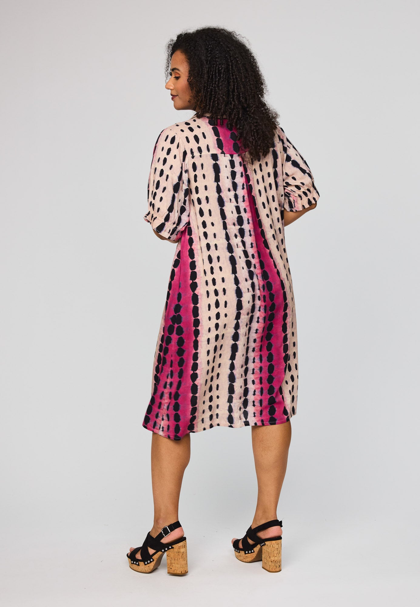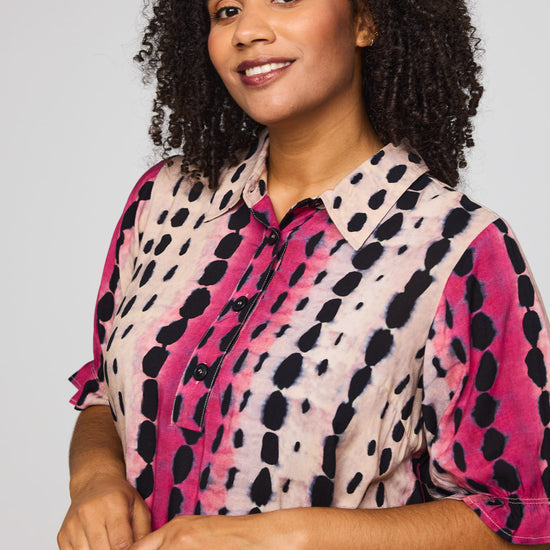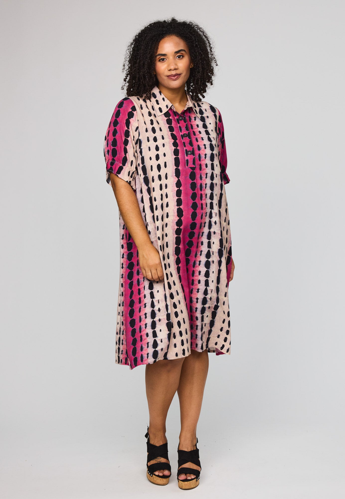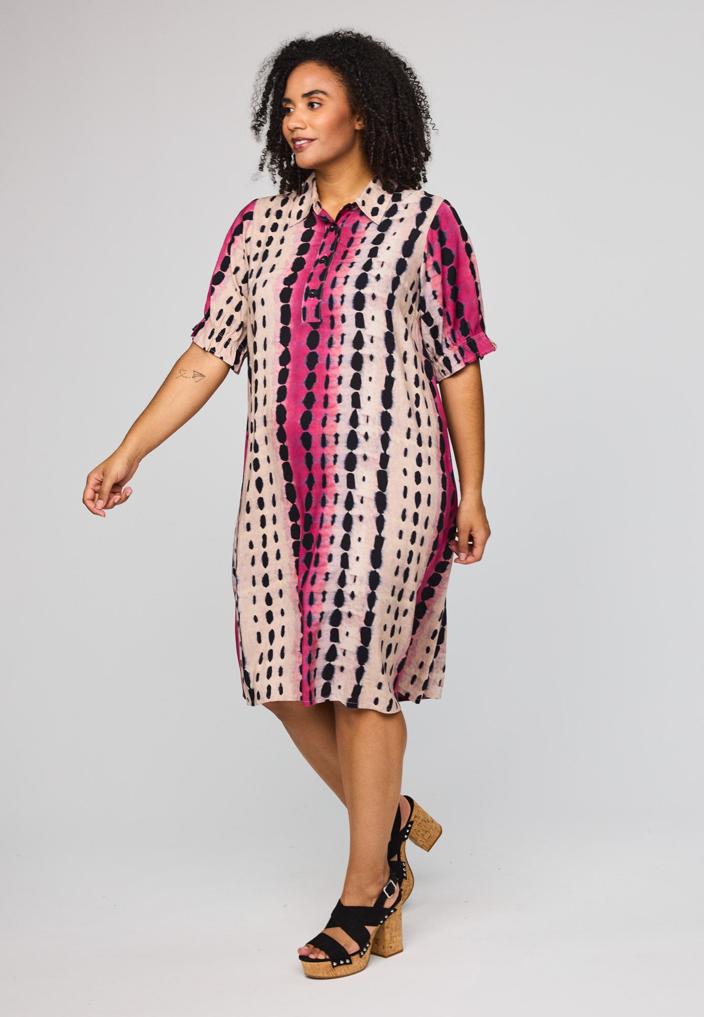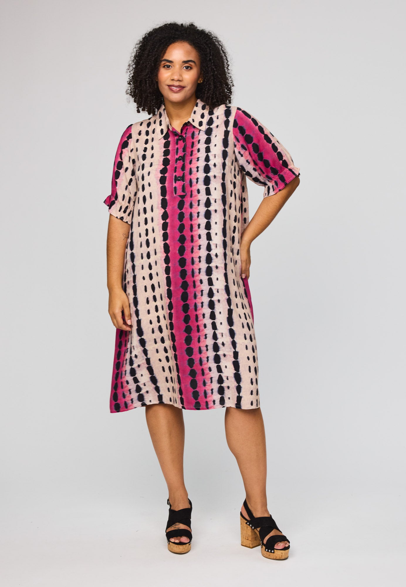 Denne vakre kjolen fra Studio kombinerer et avslappet snitt med et livlig og moderne uttrykk. Den er designet med en klassisk skjortekrage og en knappelukking foran, noe som gir et elegant preg til det ellers løse utseendet. Det grafiske mønsteret med loddrette striper i rosa og svart på en lys bakgrunn skaper en fin visuell effekt som forlenger silhuetten.