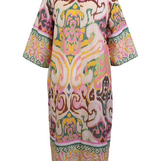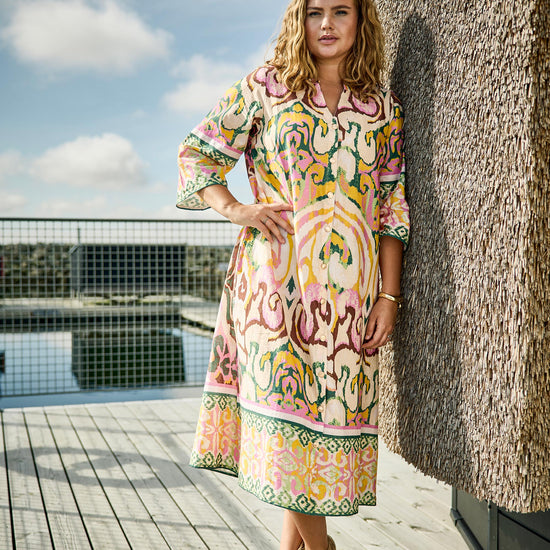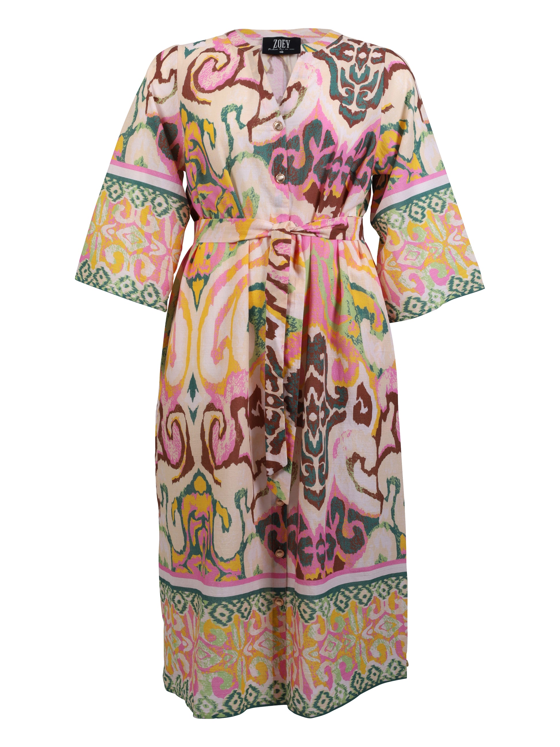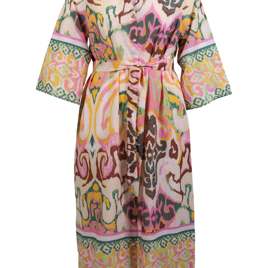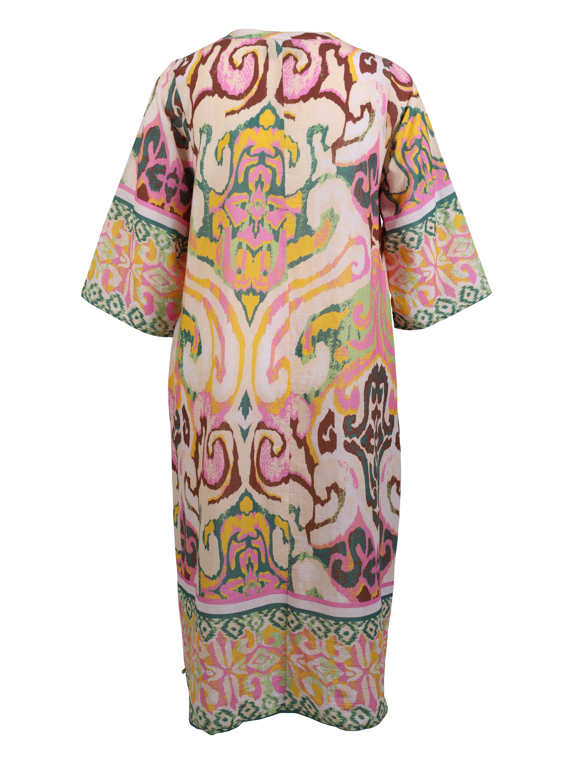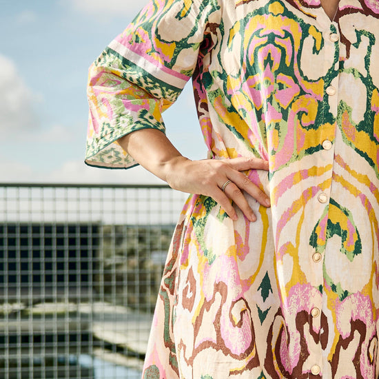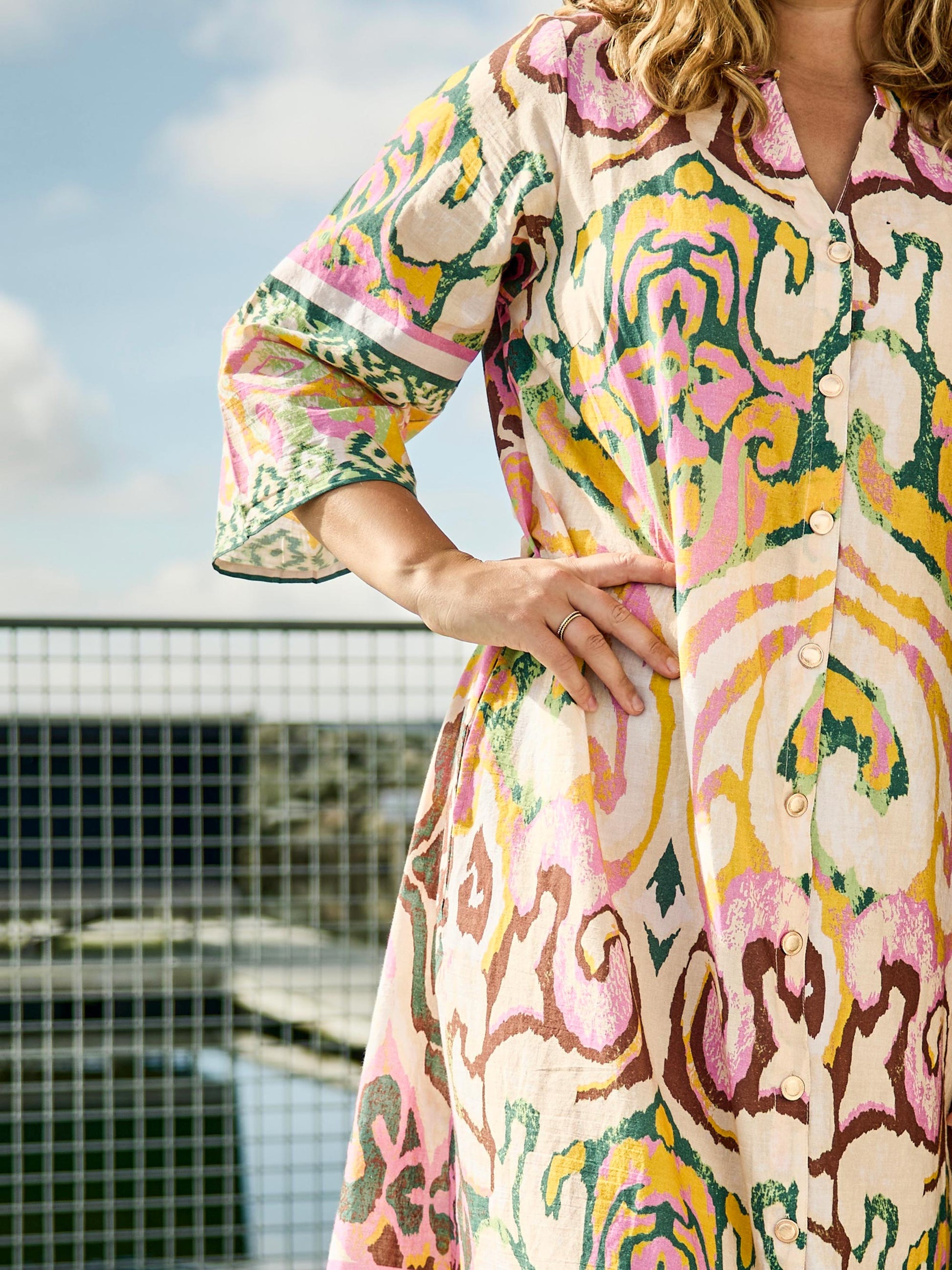 Kjolen er gjennomknappet og har trekvart lange ermer som gir en feminin touch. Det levende, abstrakte mønsteret i rosa, gul og grønn skaper et livlig og kunstnerisk uttrykk, perfekt for dem som ønsker å skille seg ut.