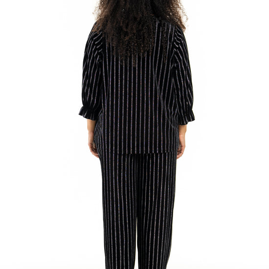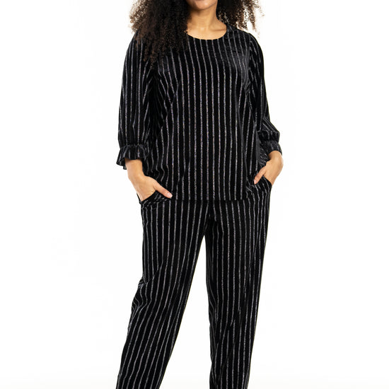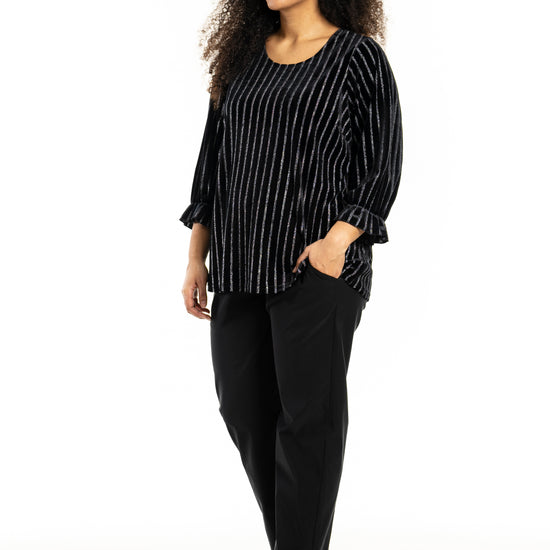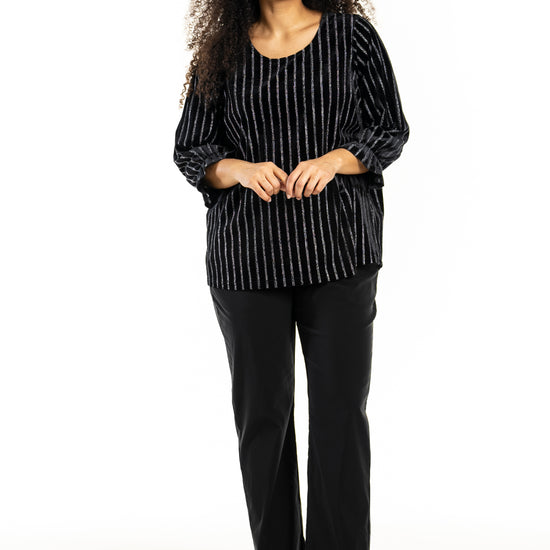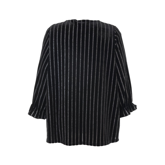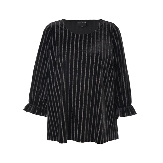 Oppgrader garderoben din med denne enkle og elegante blusen fra Studio. Blusen er laget i en fin, elastisk polyesterkvalitet, som sikrer en behagelig passform. Den vakre detaljen med vertikale sølvstriper gir et sofistikert preg som gjør den perfekt til både hverdag og festlige anledninger.