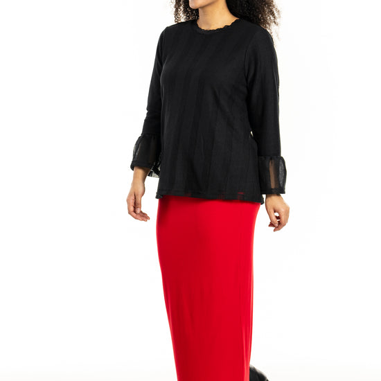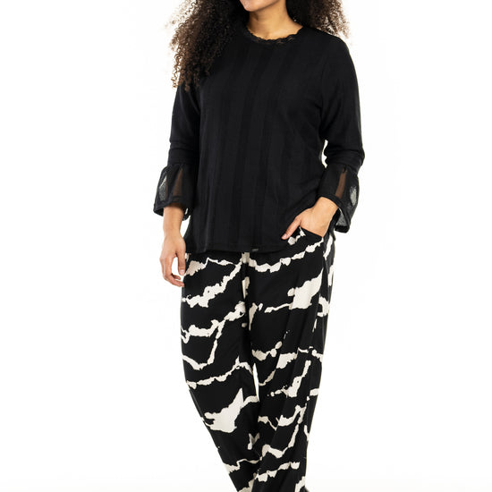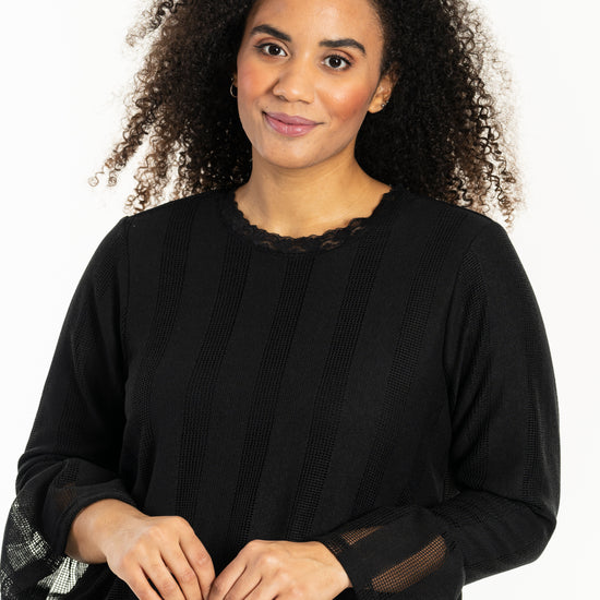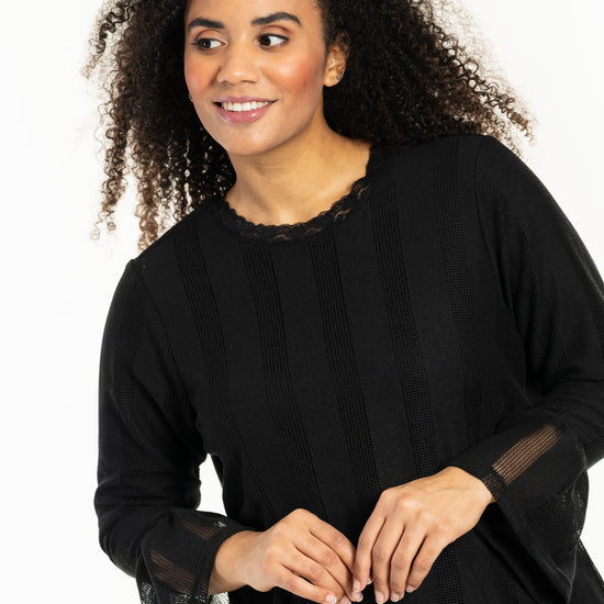Oppdag den stilige blusen fra Studio, designet i to lag som kombinerer komfort med eleganse. Denne blusen har et indre lag av elastisk viskosejersey som sikrer en tett passform, mens det ytre laget av polyester skaper et fint spill av vertikale striper. Blusen har en rund hals med delikat blondekant og lange ermer med brede, oppblåste mansjetter.