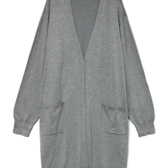 Den åpne cardiganen i medium grå melange gir deg et lett og behagelig ekstra lag til enhver anledning. Med løs passform, V-utringning og lange ermer får du maksimal komfort og et avslappet uttrykk. Praktiske frontlommer og ribbestrikkede mansjetter gir funksjonelle detaljer, mens den nøytrale fargen gjør den enkel å kombinere med resten av garderoben.