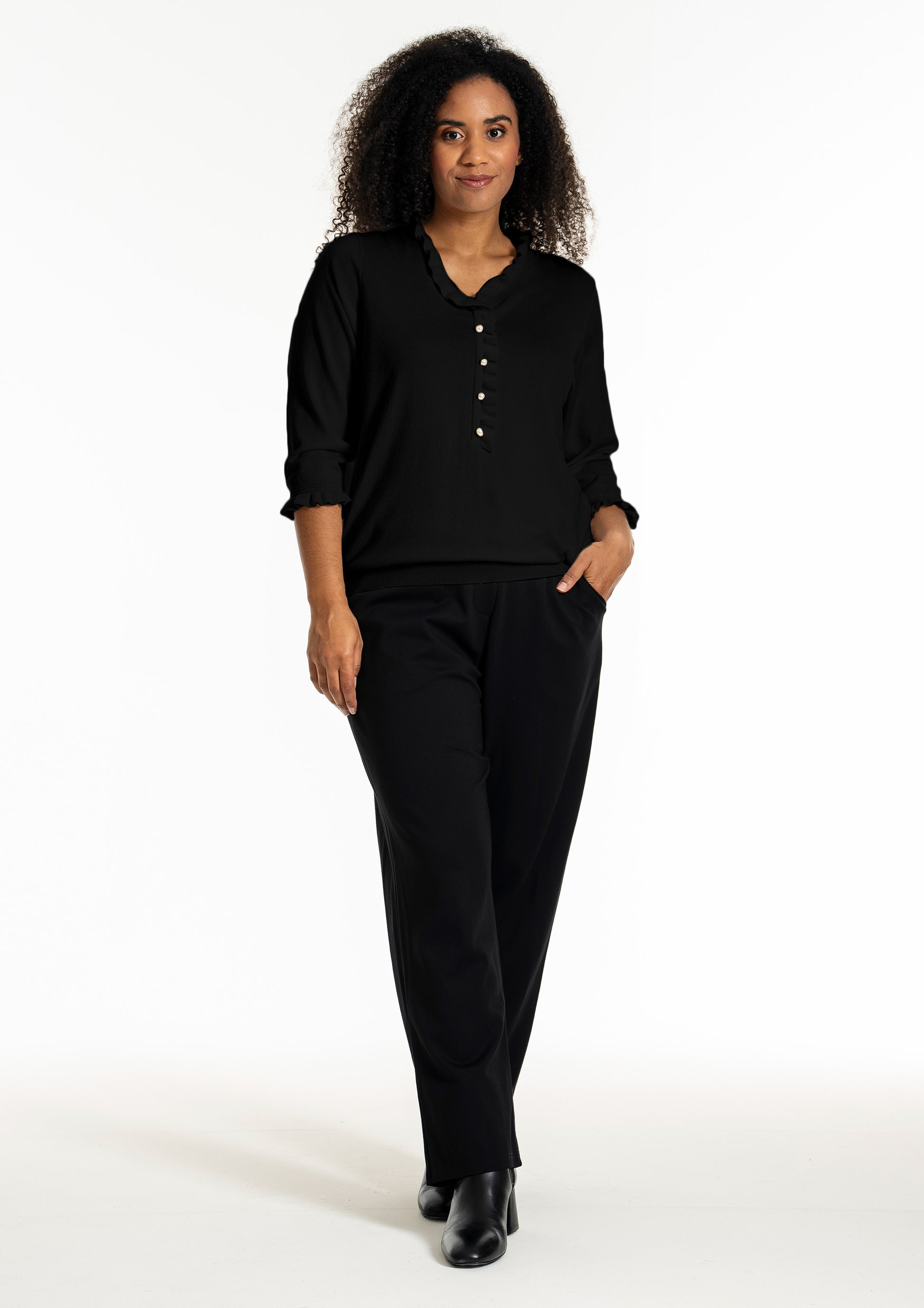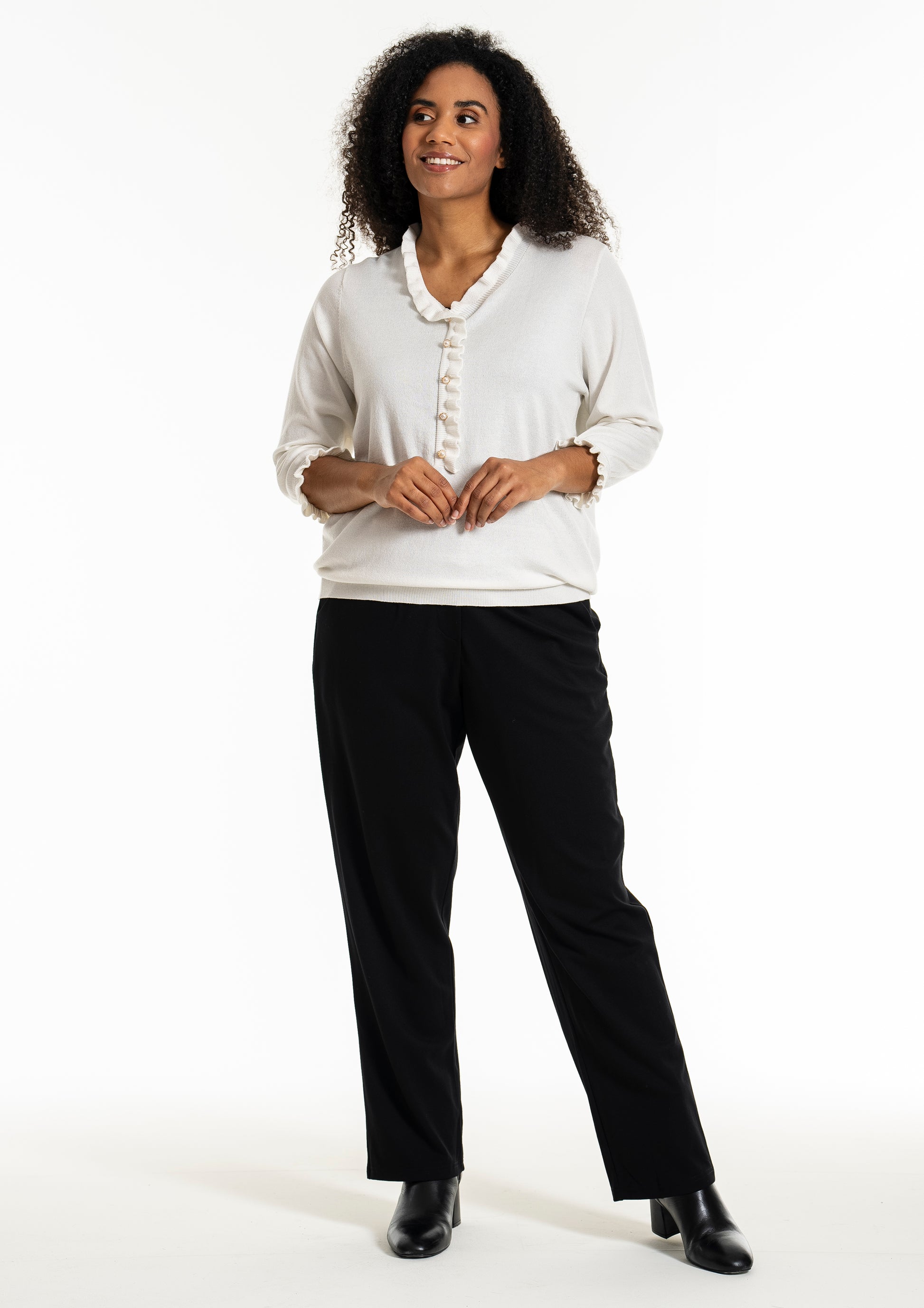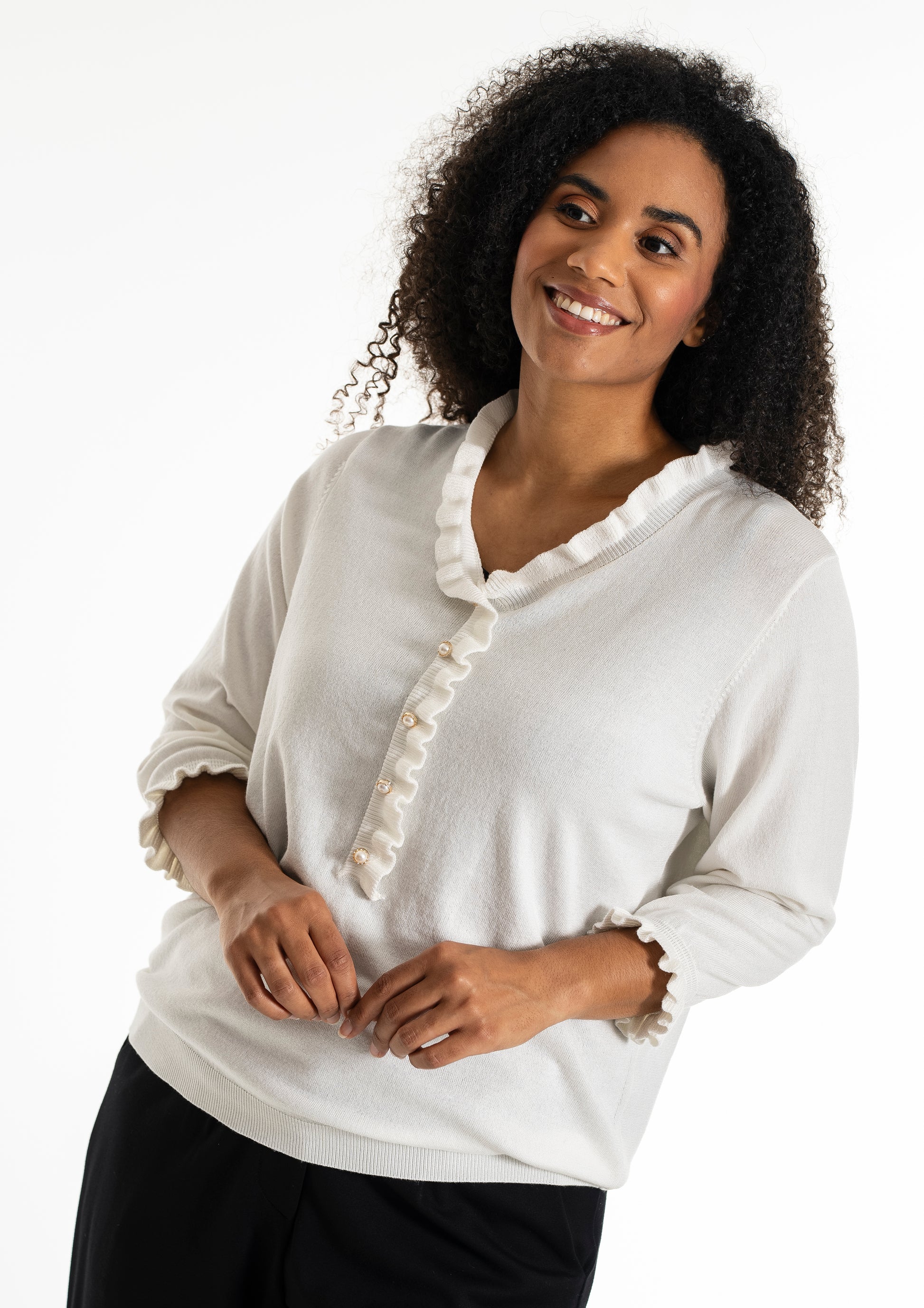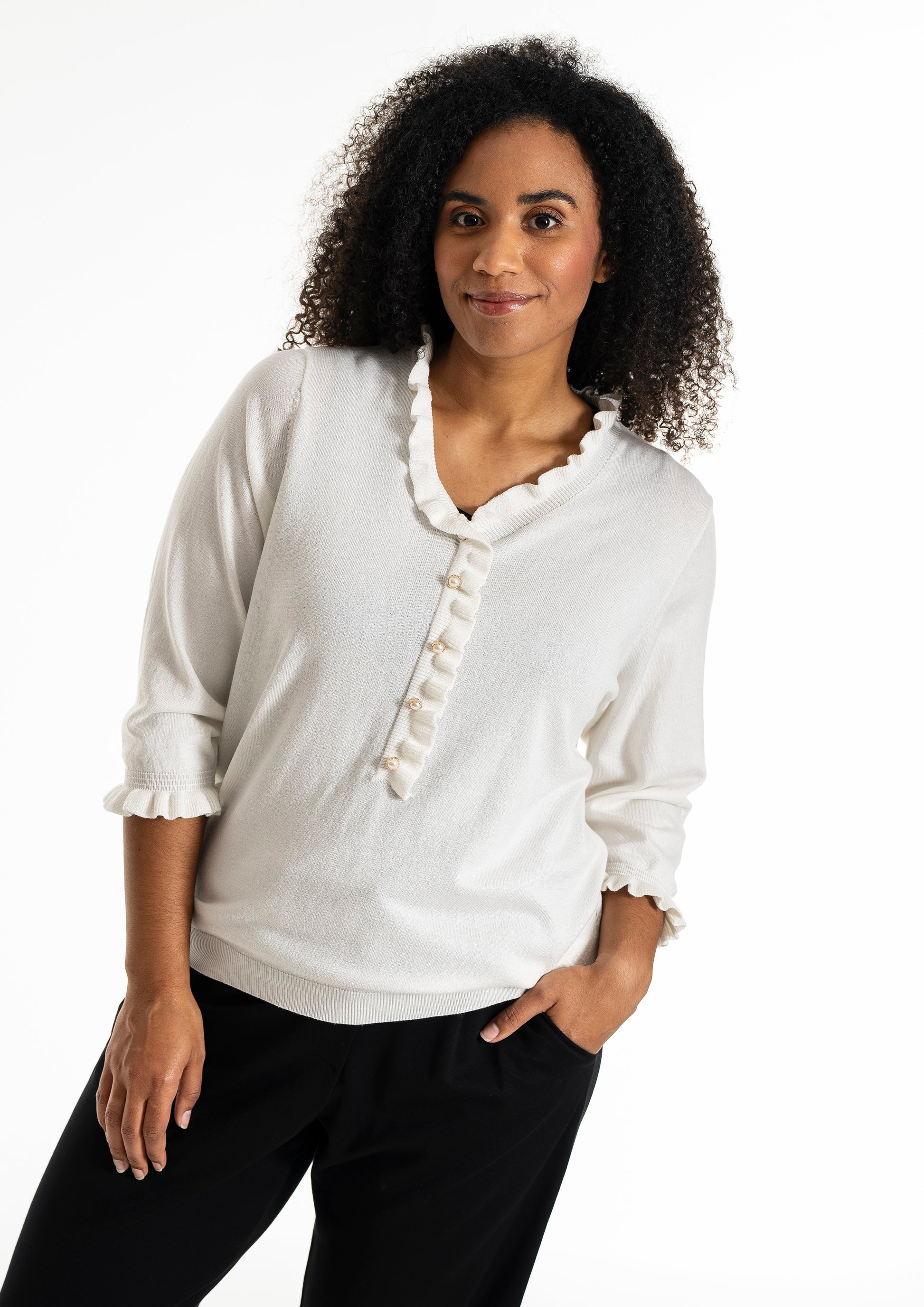 Blusen er tilgjengelig i tre elegante farger - svart, offwhite og rosa - som gjør det enkelt å matche med andre plagg i garderoben din. Den er laget i en deilig strikket kvalitet som sikrer både pusteevne og komfort hele dagen. Perfekt å kombinere med plus size jeans eller plus size skjørt for et komplett antrekk.