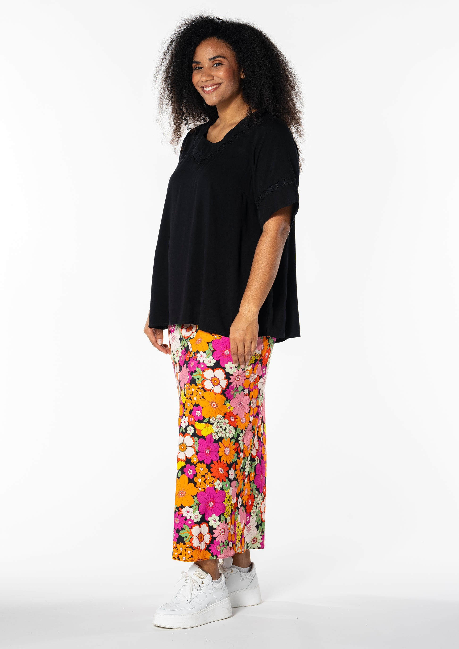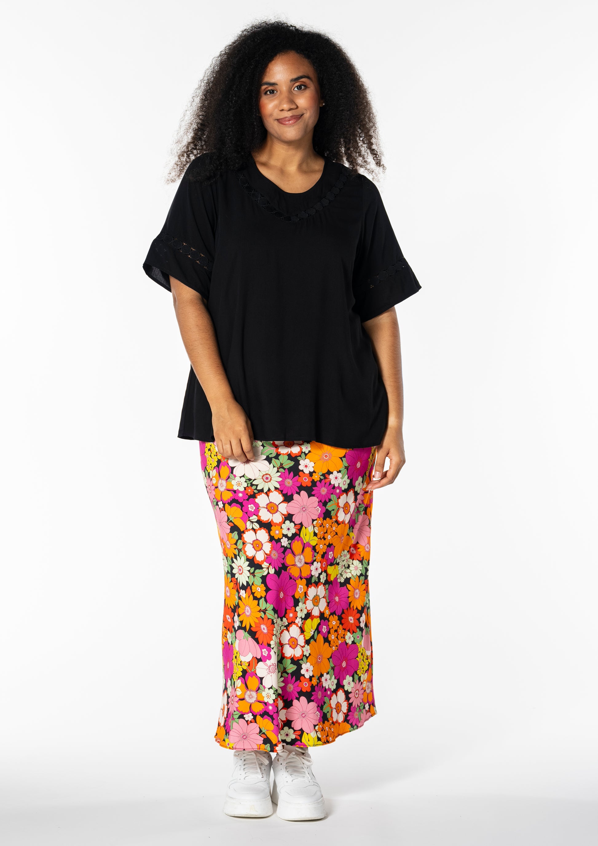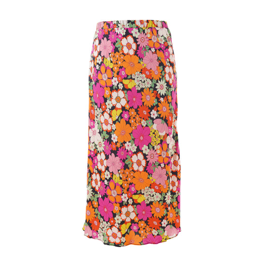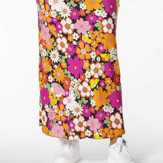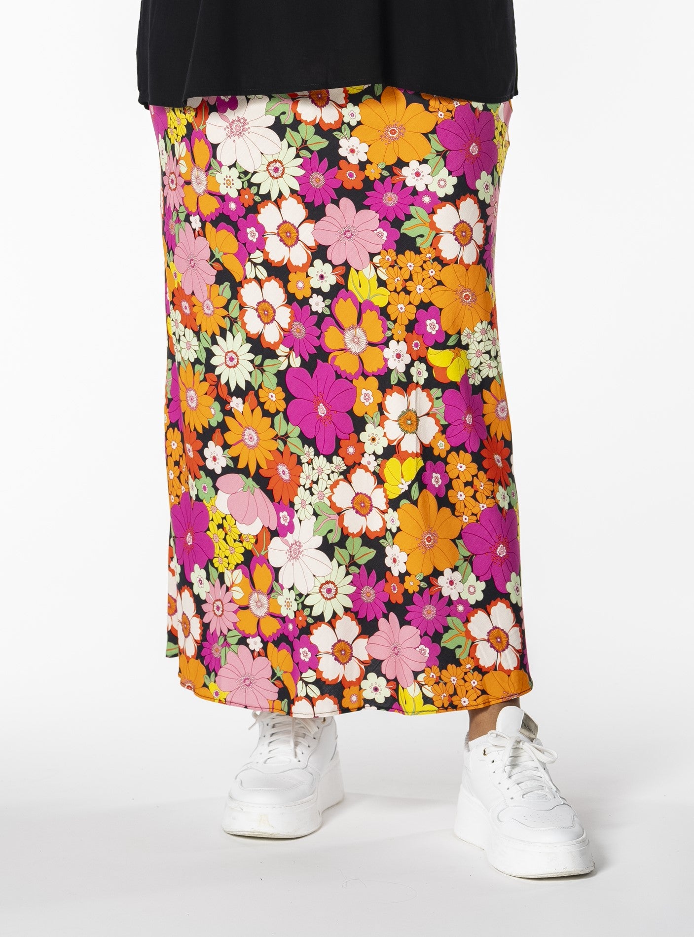 Gjør antrekket ditt levende med denne vakre midi-nederdelen fra Studio, perfekt for å bringe farge og stil inn i garderoben din. Denne nederdelen er laget av 100% viskose, noe som sikrer en lett og behagelig passform. Det fargerike blomstermønsteret i nyanser av oransje og rosa mot en svart bakgrunn skaper en iøynefallende kontrast, som passer til både hverdagsbruk og festlige anledninger.