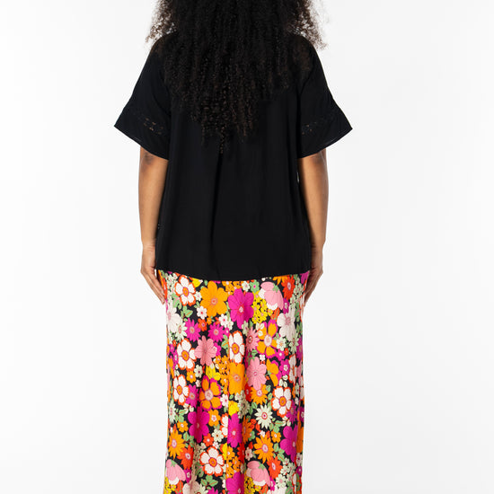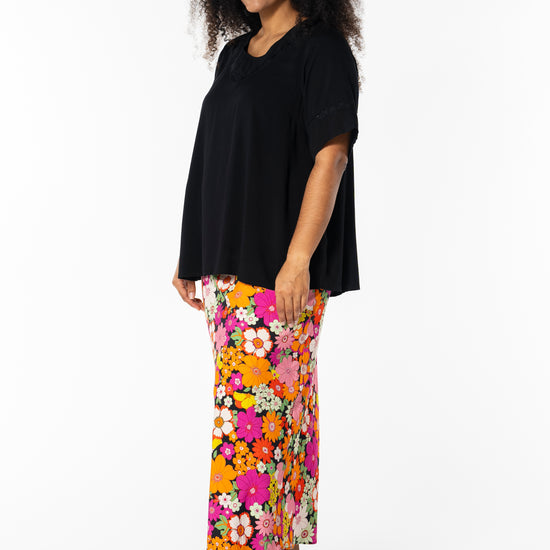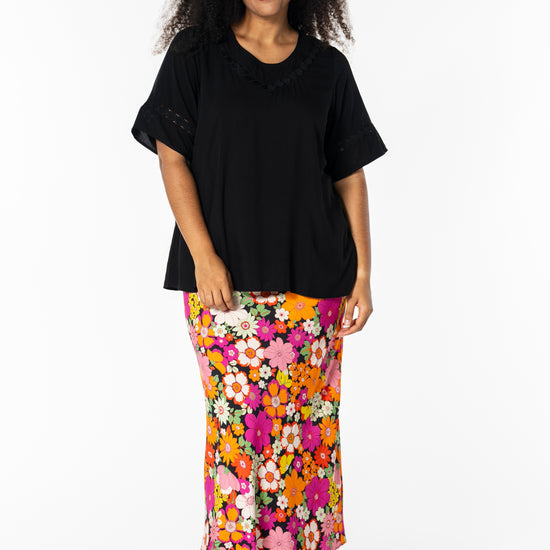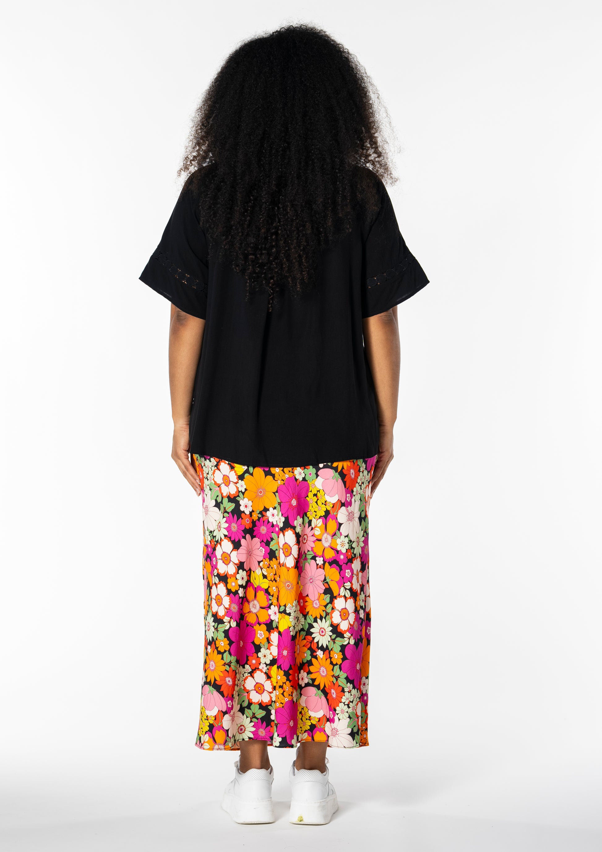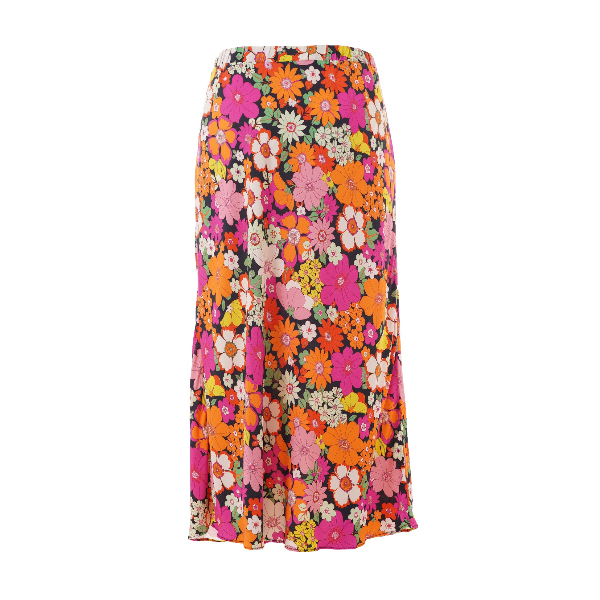 Gjør antrekket ditt levende med denne vakre midi-nederdelen fra Studio, perfekt for å bringe farge og stil inn i garderoben din. Denne nederdelen er laget av 100% viskose, noe som sikrer en lett og behagelig passform. Det fargerike blomstermønsteret i nyanser av oransje og rosa mot en svart bakgrunn skaper en iøynefallende kontrast, som passer til både hverdagsbruk og festlige anledninger.