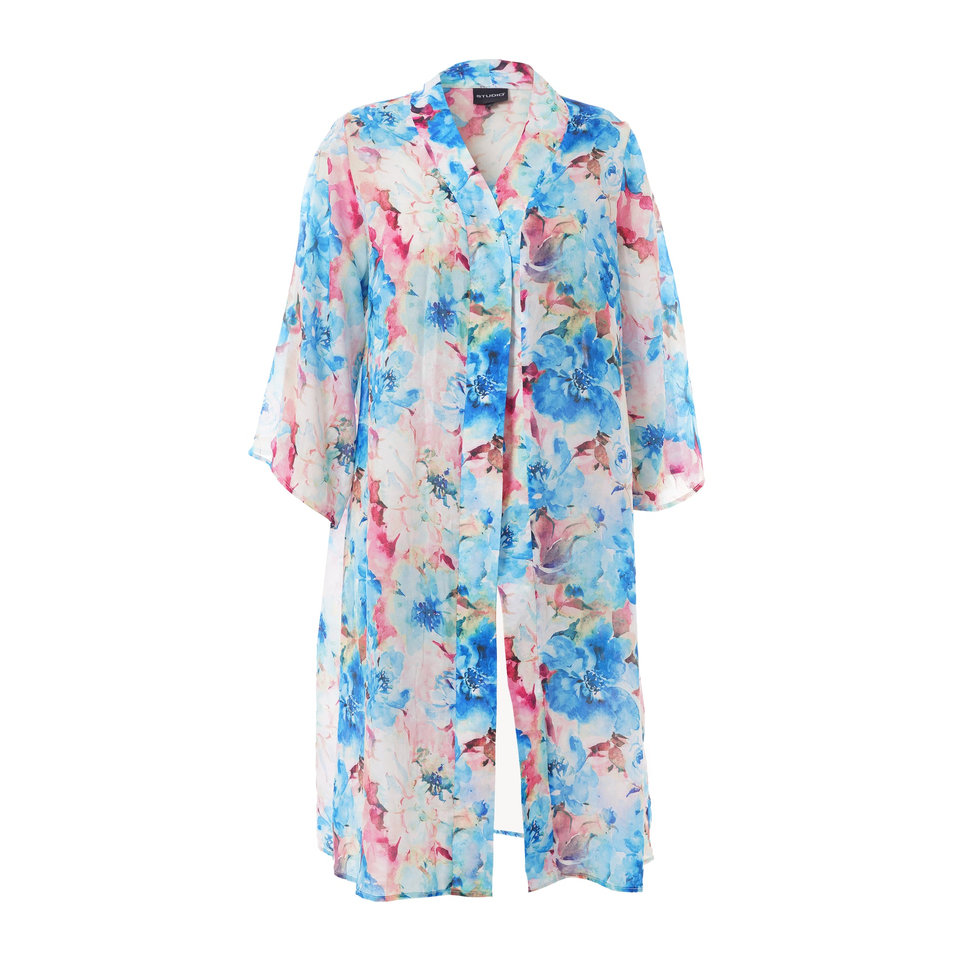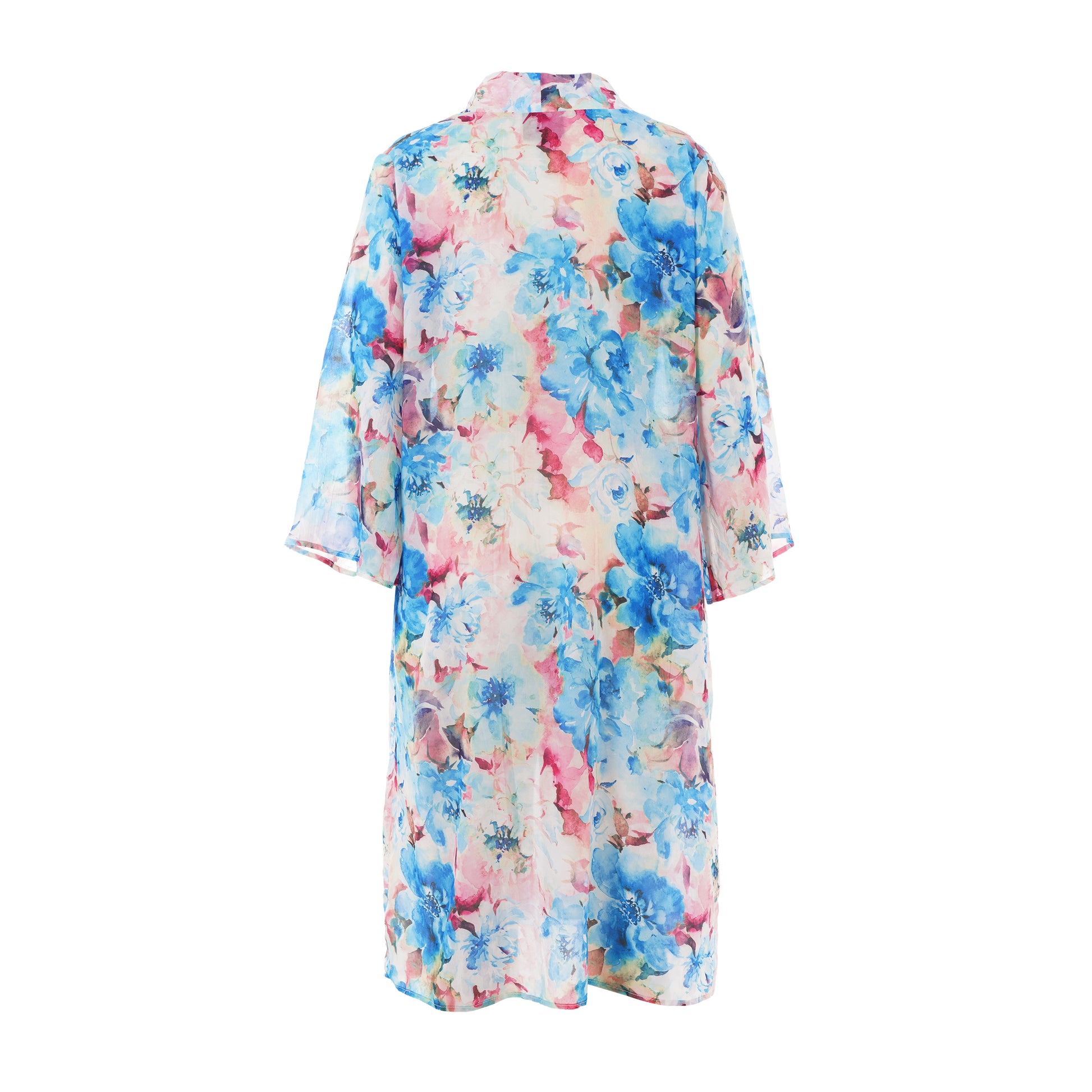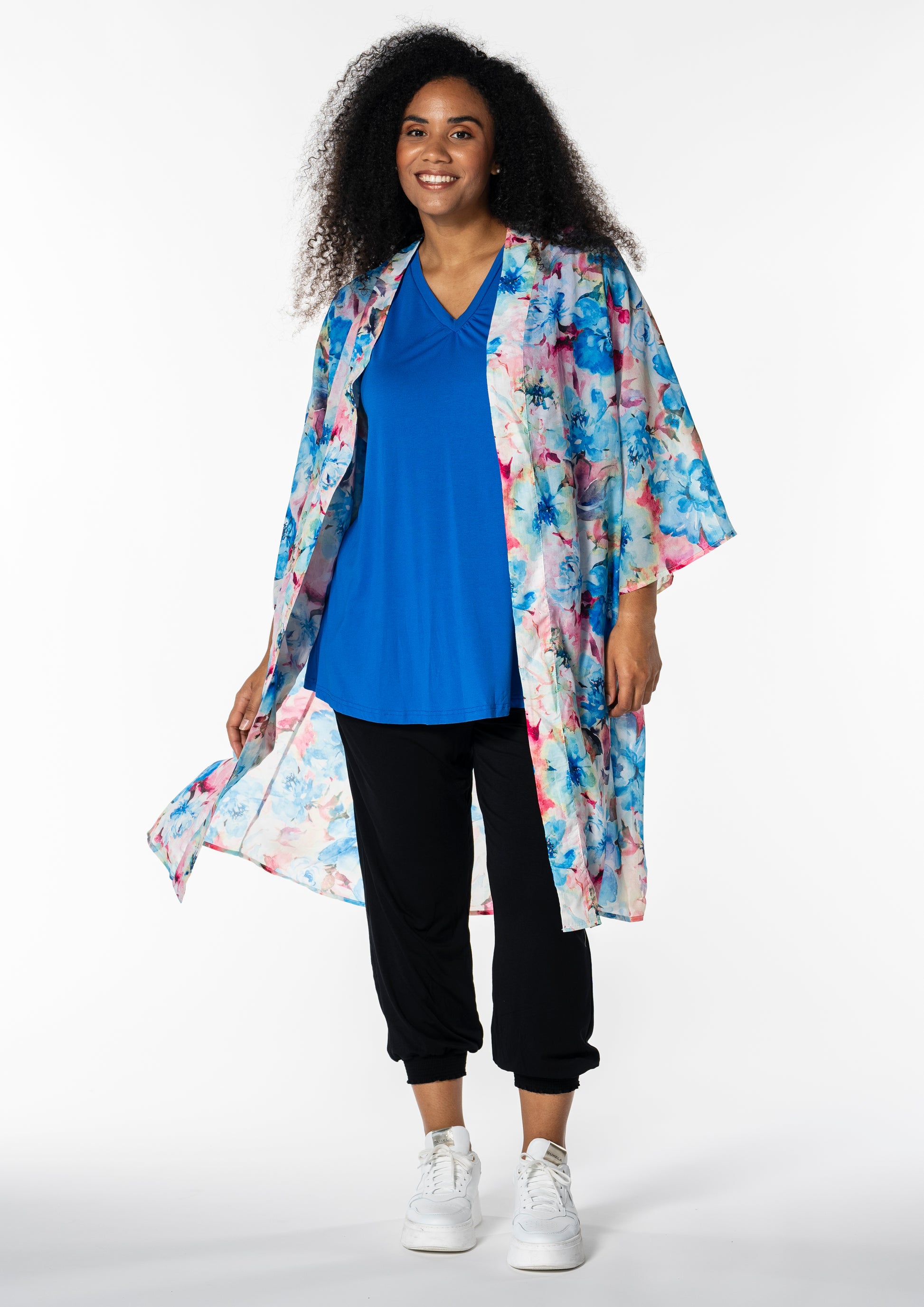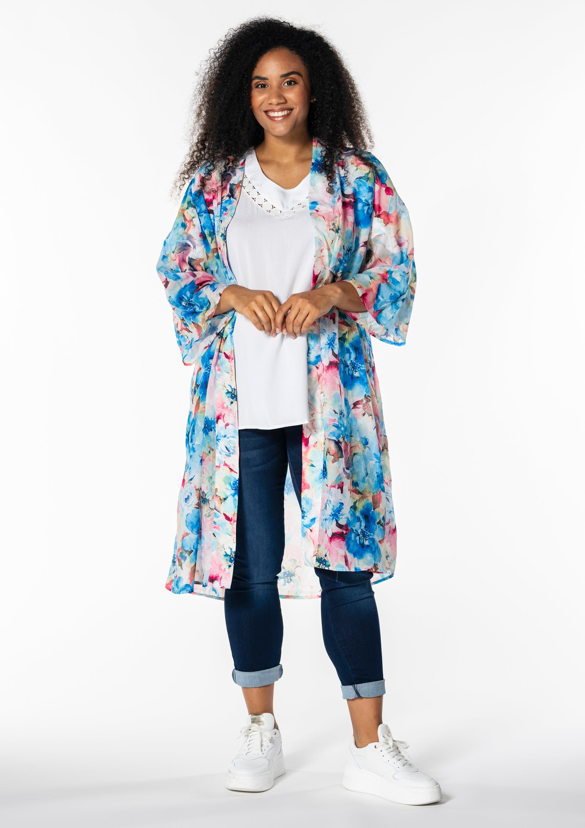 Opplev den vakre kimonoen fra Studio, som kombinerer eleganse og komfort i en enkel design. Med sitt livlige multi color print i blå og rosa toner, tilfører den et friskt pust til enhver garderobe. Kimonoen er laget av 100% polyester, noe som sikrer en lett og luftig passform, som er behagelig å ha på hele dagen.