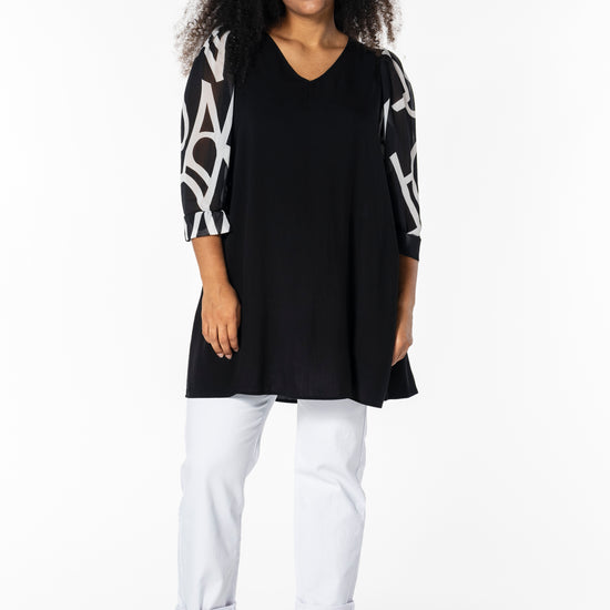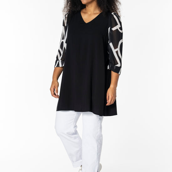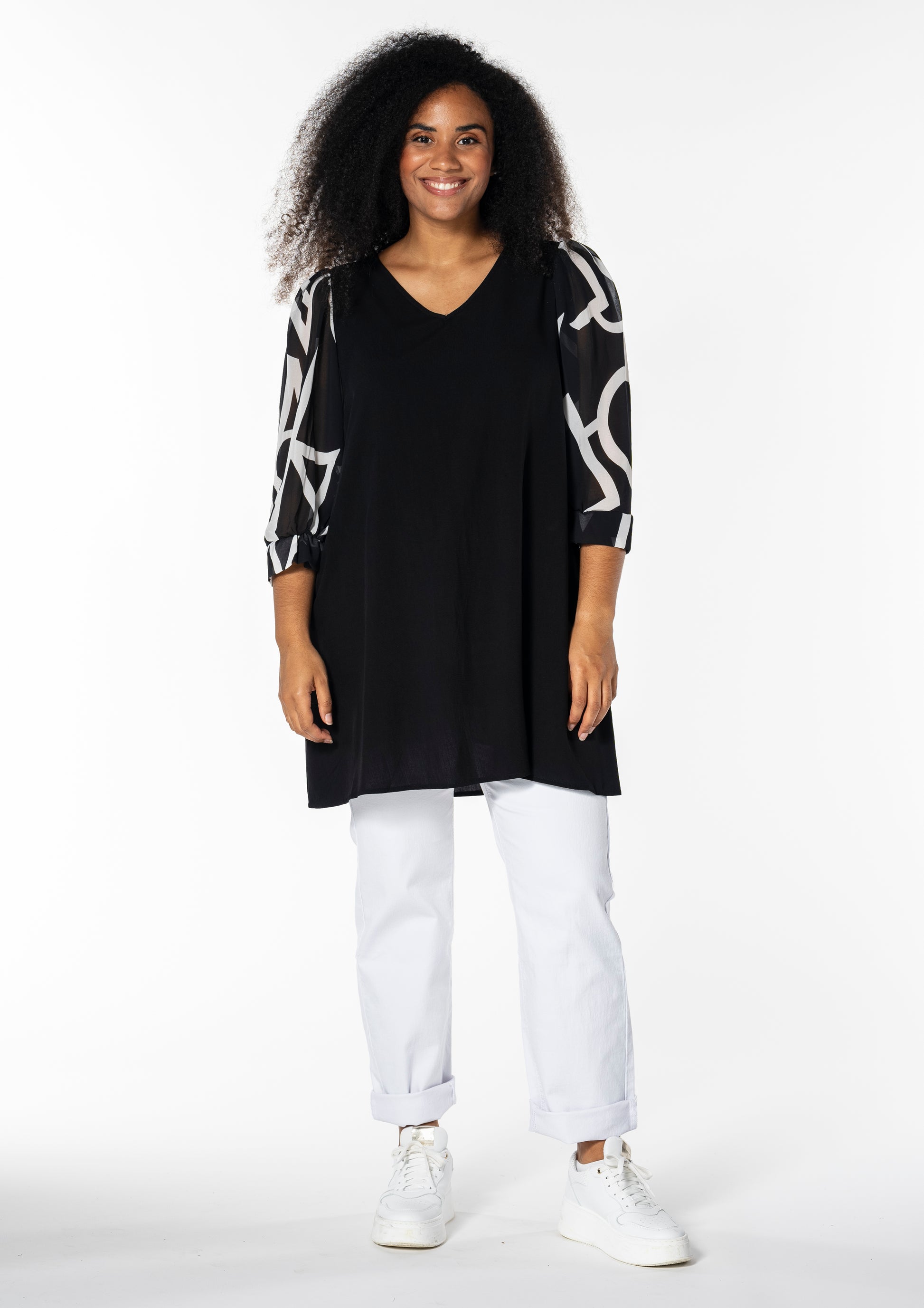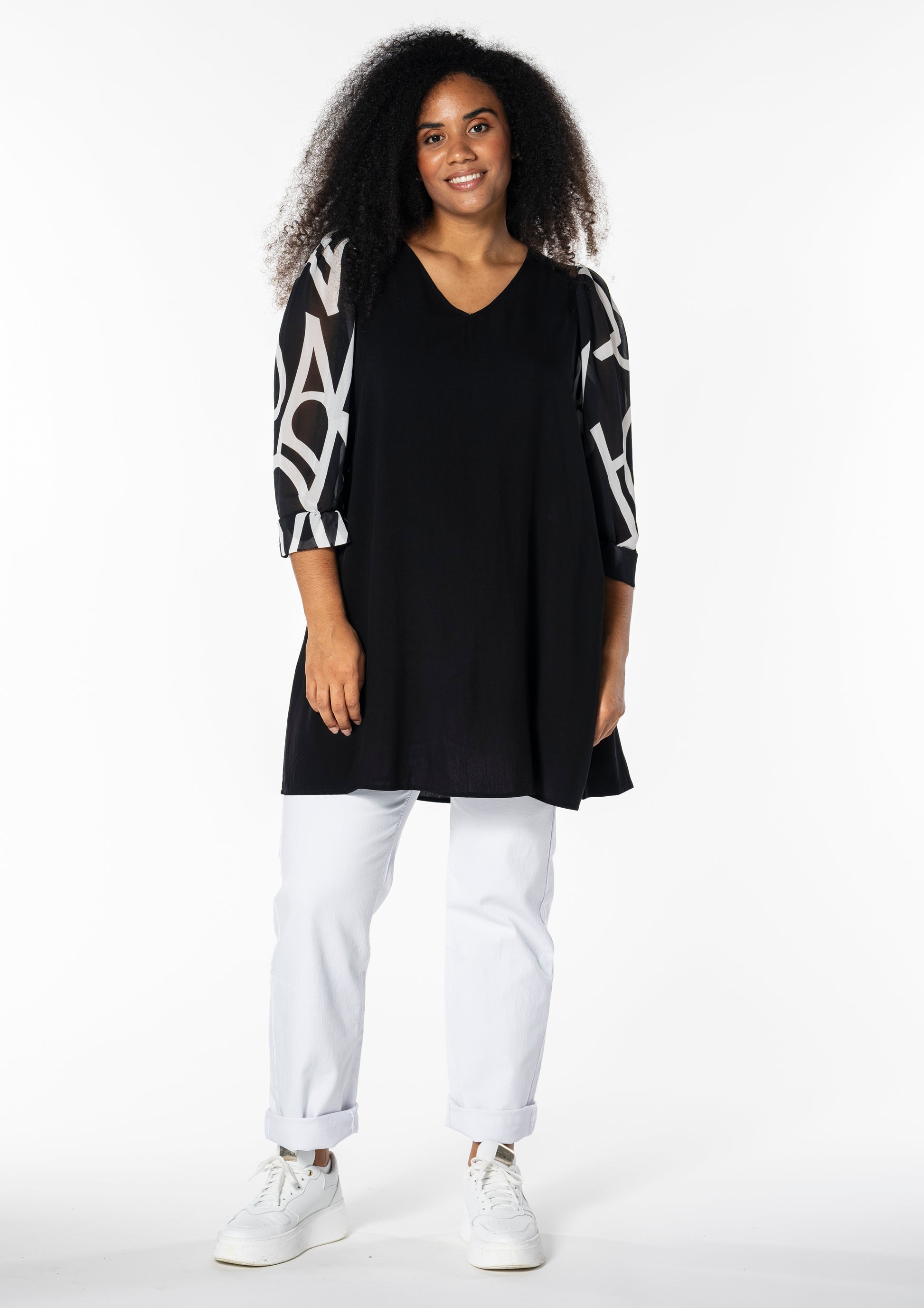 Oppdag en vakker tunika fra Studio som kombinerer eleganse og komfort til perfeksjon. Denne tunikaen er i en solid svart farge med sjarmerende hvite hjerter på chiffonermene, som skaper et unikt og stilfullt utseende. Designet har en flott V-hals og trekvartlange chiffonmermer som gir et feminint preg til antrekket ditt. Tunikaen er laget i 100% viskose og har en A-formet passform som faller lett og flatterende rundt kroppen.