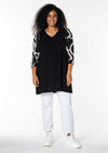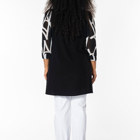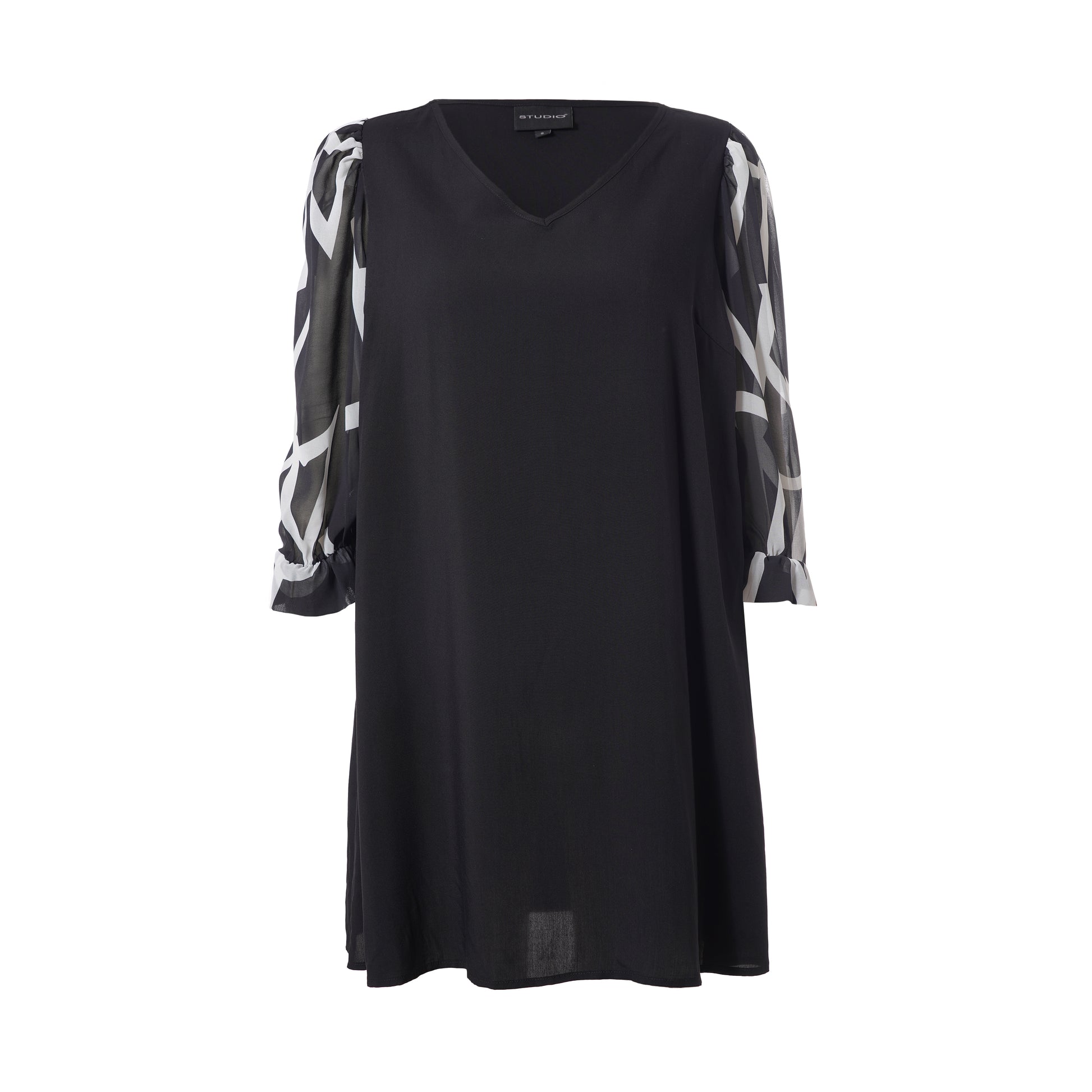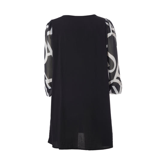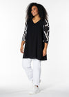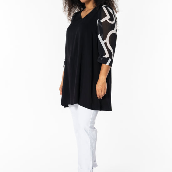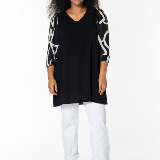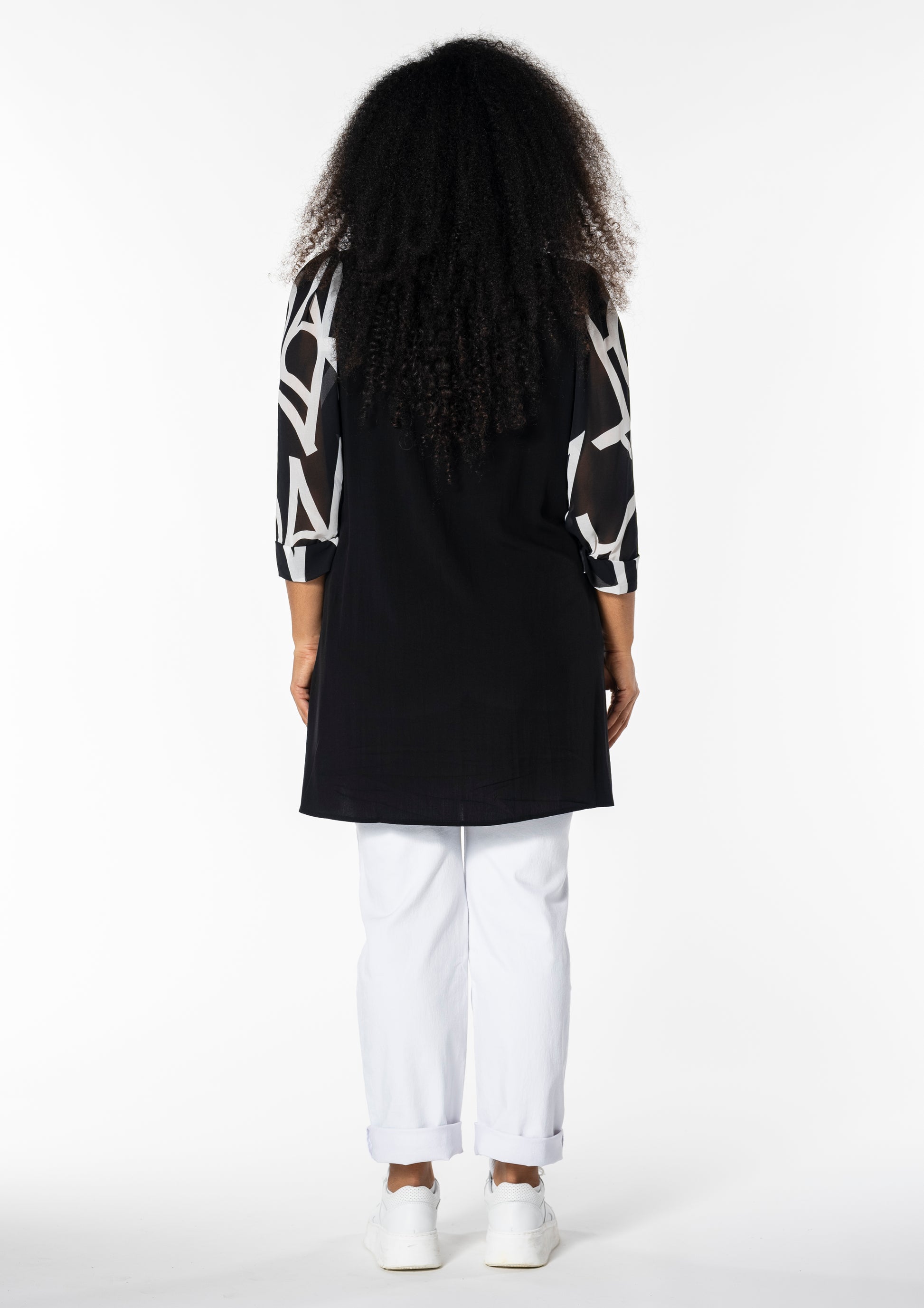 Oppdag en vakker tunika fra Studio som kombinerer eleganse og komfort til perfeksjon. Denne tunikaen er i en solid svart farge med sjarmerende hvite hjerter på chiffonermene, som skaper et unikt og stilfullt utseende. Designet har en flott V-hals og trekvartlange chiffonmermer som gir et feminint preg til antrekket ditt. Tunikaen er laget i 100% viskose og har en A-formet passform som faller lett og flatterende rundt kroppen.