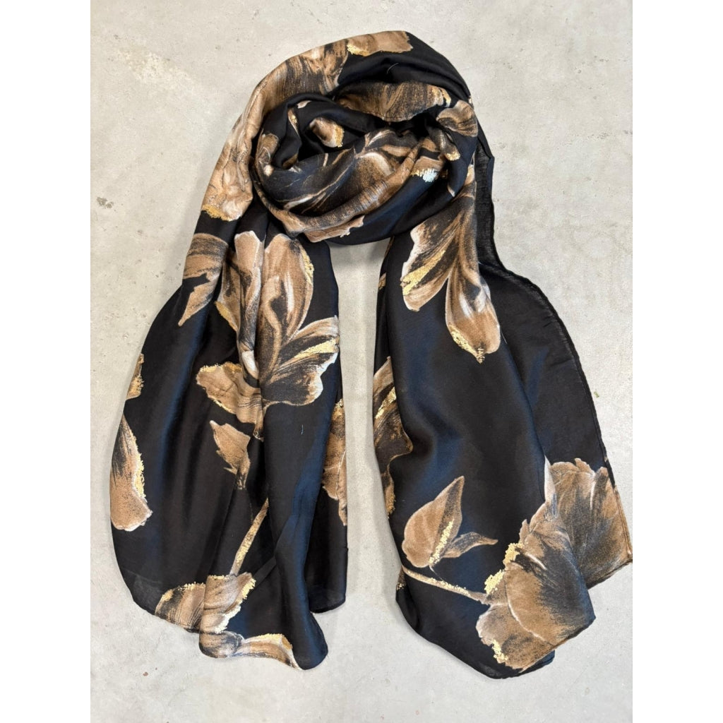 Flot viskose tørklæde i sort og brun med strejf af guld.