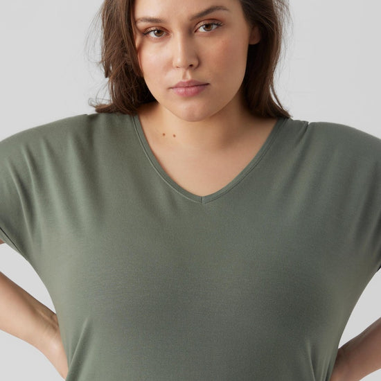 Opplev den ultimate komforten med denne grunnleggende T-skjorten fra Vero Moda Curve, laget i en myk kvalitet av 95 % lyocell og 5 % elastan. Med en elegant V-hals og korte ermer er denne T-skjorten det perfekte valget for din hverdagsgarderobe. Stoffsammensetningen sikrer både komfort og en god passform som komplimenterer ulike kroppsformer.