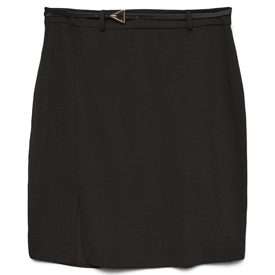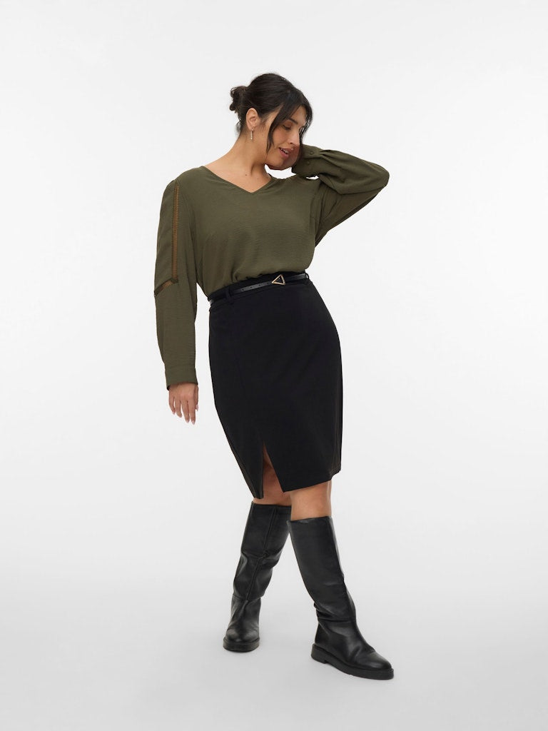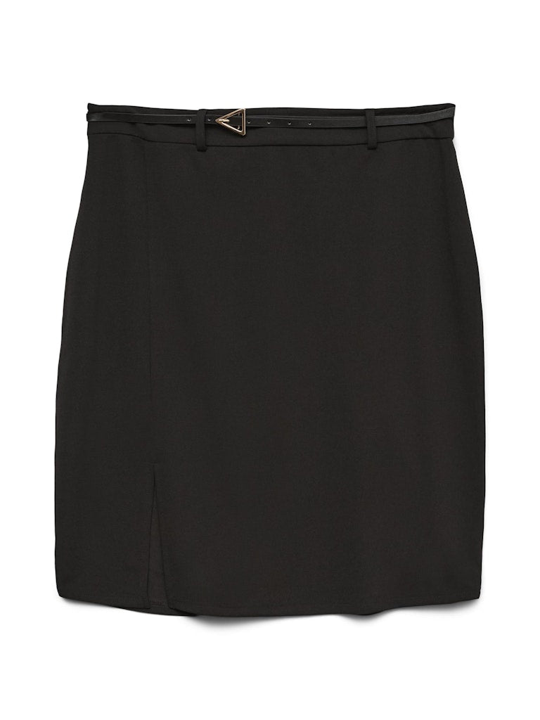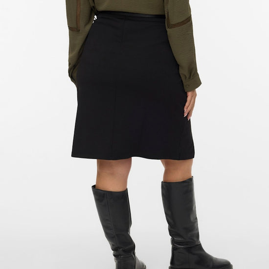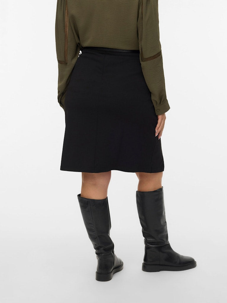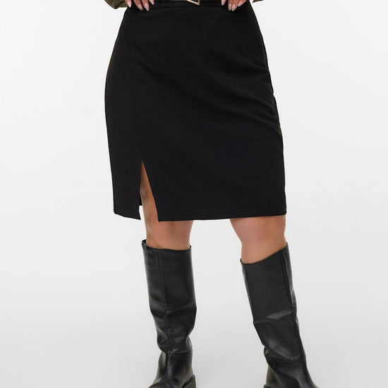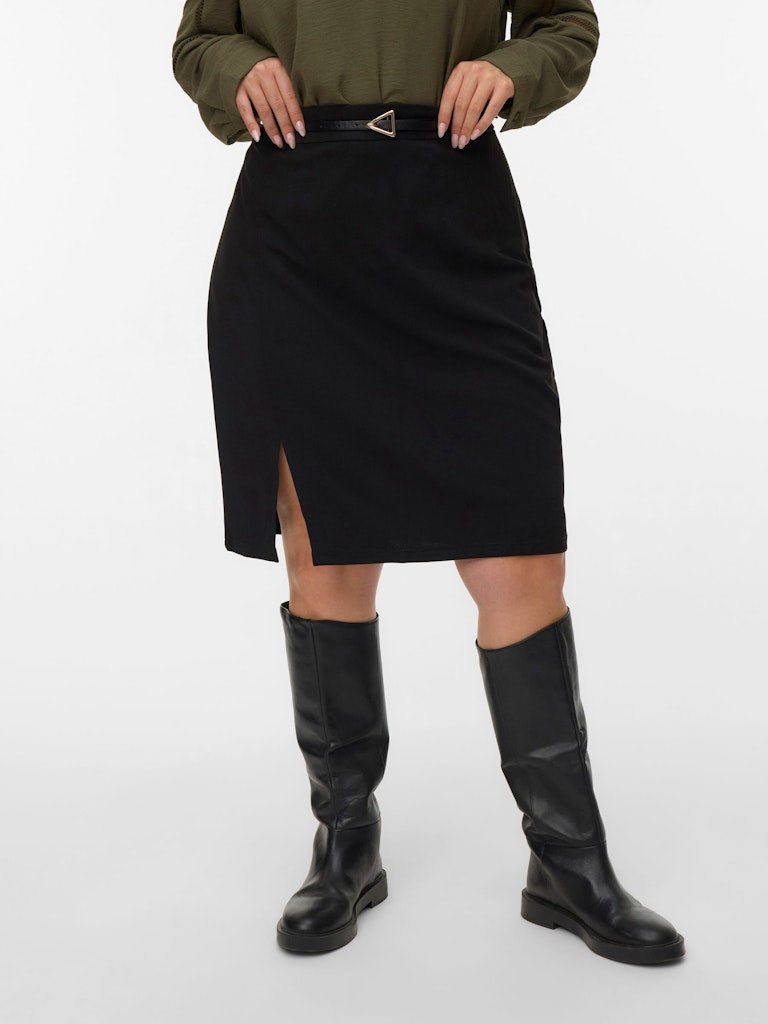 Dette vakre skjørtet fra Vero Moda Curve er designet for å fremheve dine former på en stilfull måte. Modellen har en tettsittende passform som går til like rundt knærne, og det integrerte beltet med en fin metallspenne markerer midjen flott.