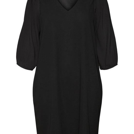 Kort kjole med V-hals og 3/4 plisserte ermer med strikk.