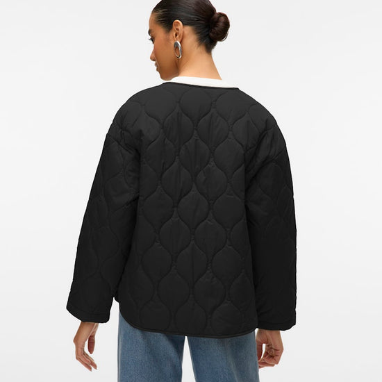 Den svarte quiltede jakken fra Vero Moda Curve er den perfekte kombinasjonen av stil og funksjonalitet. Denne lett vatterte jakken er ideell når du trenger mild varme, og fungerer som et ekstra lag som er perfekt for overgangsperioder med uforutsigbart vær. Jakken har en rund hals og lange ermer med droppede skuldre, som gir et avslappet og moderne utseende.