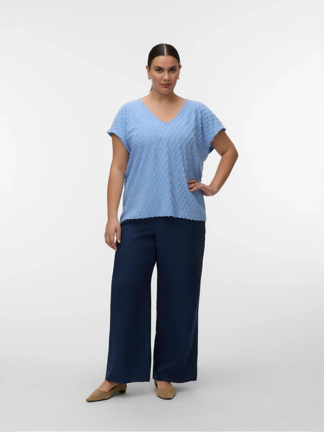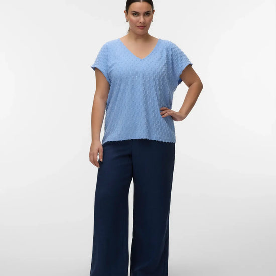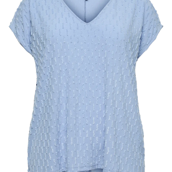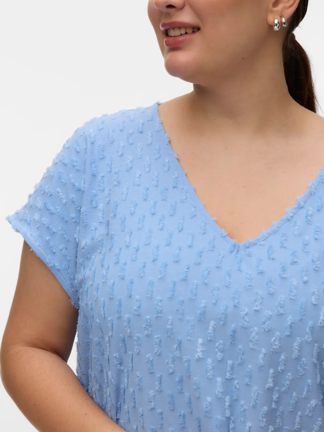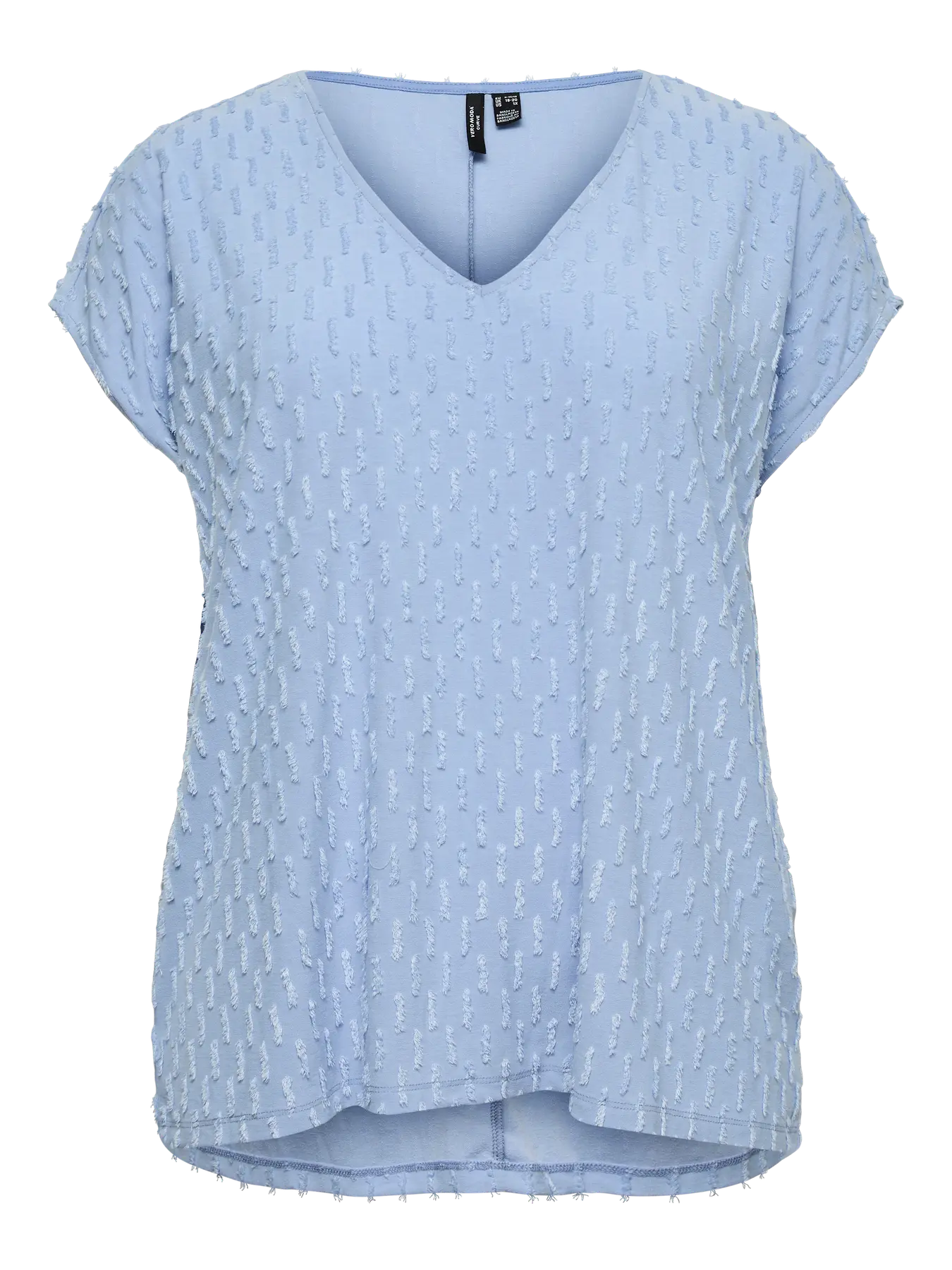 Denne skønne lyseblå top fra Vero moda curve fanger straks øjet med sin flotte og teksturerede overflade. Materialet er prydet med fine, små frynsedetaljer i stoffet, der giver tøjet et levende og feminint udtryk. Pasformen er utrolig behagelig med et fald, der sidder luftigt og let på kroppen uden at stramme. Du får her en fantastisk tilføjelse til din samling af bluser, der byder på en flatterende v-udskæring og smarte cap sleeves, som lige akkurat dækker overkanten af skulderen.