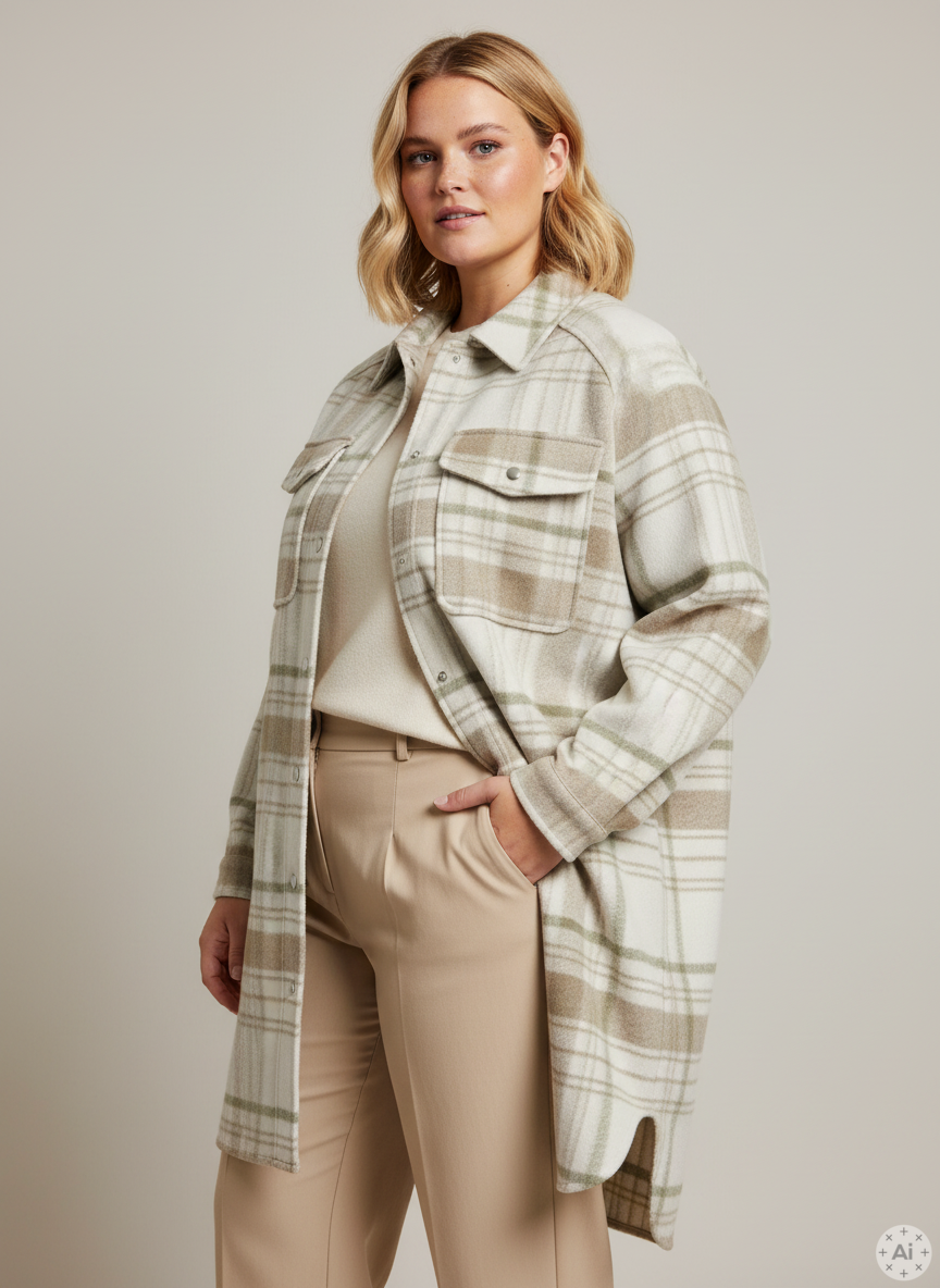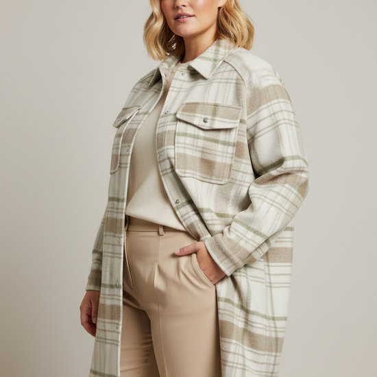 Den dempede grønne nyansen gjør jakken enkel å style med både plus size bukser og strikk for et komplett høstlook. Jakken holder deg varm på kjølige dager og passer like godt til jobb som til fritid.