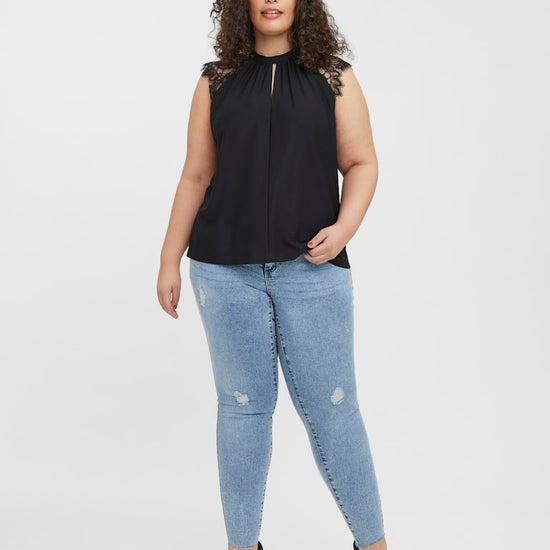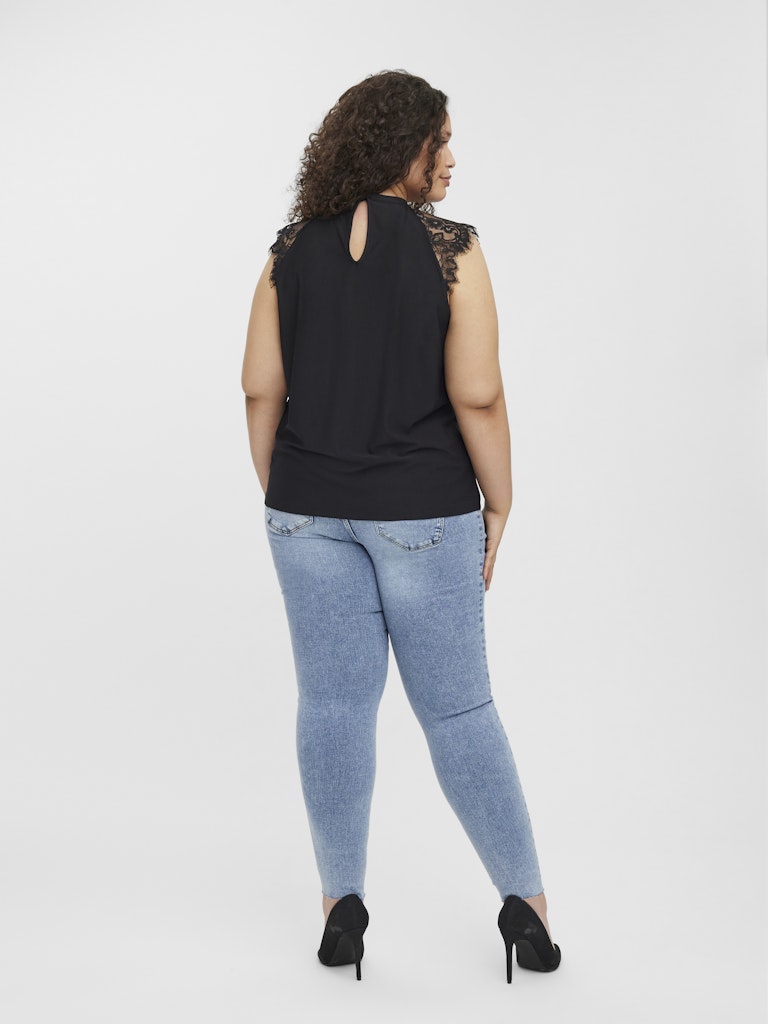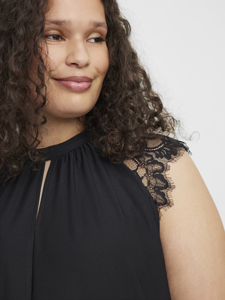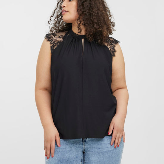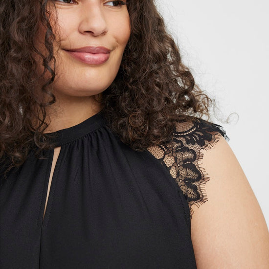 Denne vakre toppen fra Vero Moda Curve er designet med et feminint og sofistikert uttrykk som passer perfekt til både hverdag og fest. Toppen kommer i en klassisk sort farge og har en elegant høy hals med en dekorativ splitt foran, samt fine blonder over skuldrene som gir et lett og romantisk utseende.