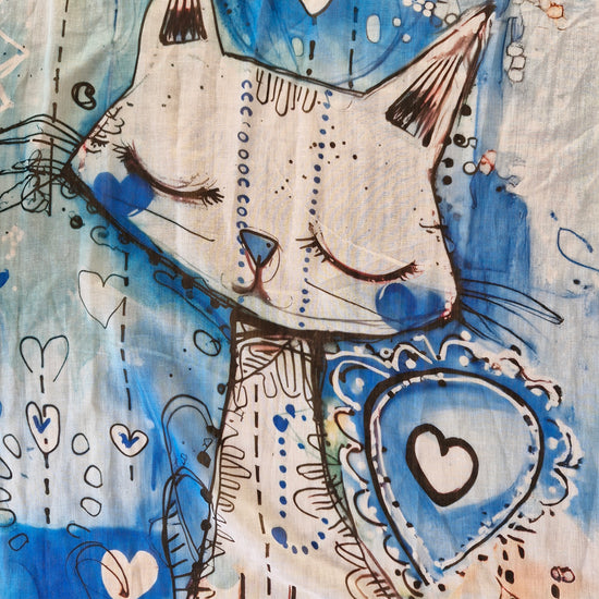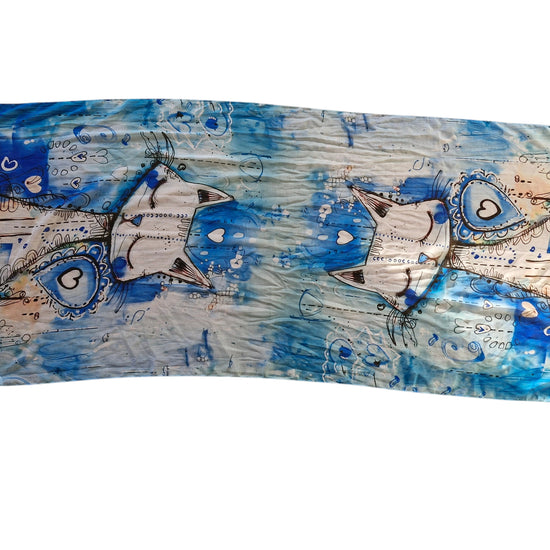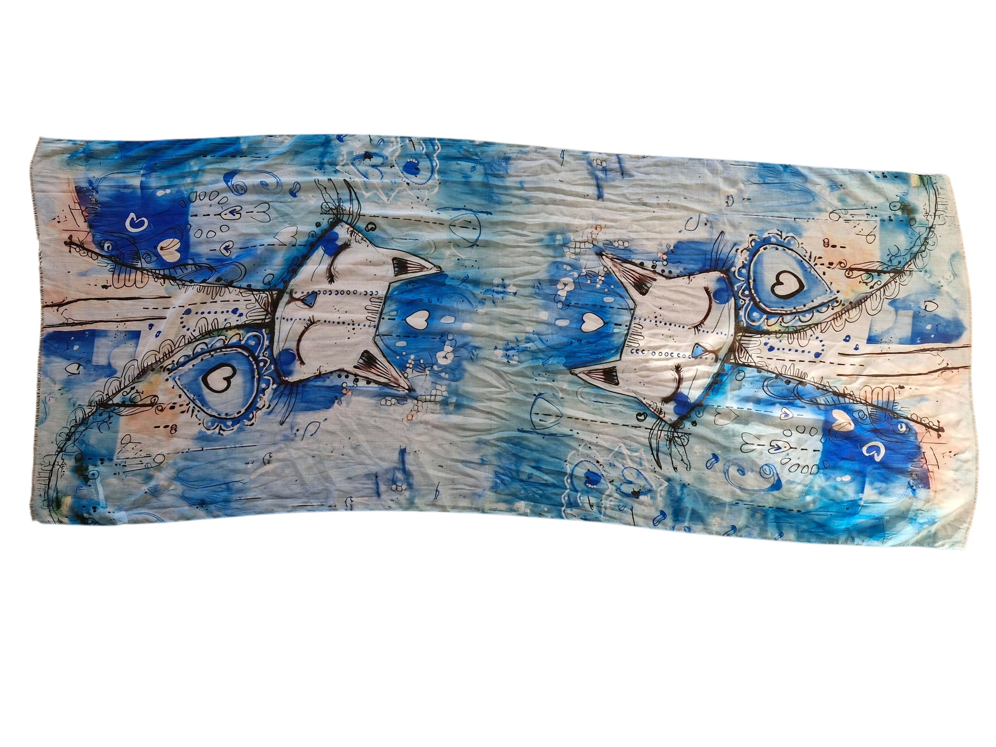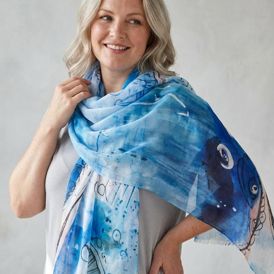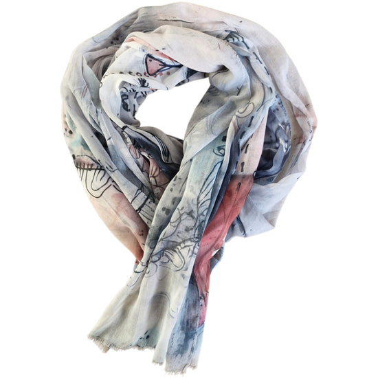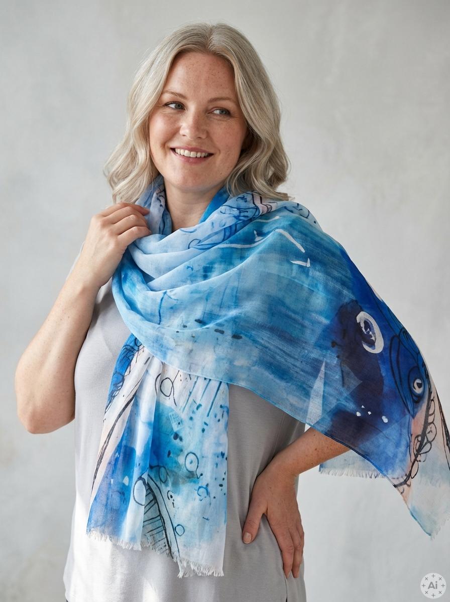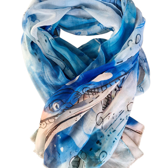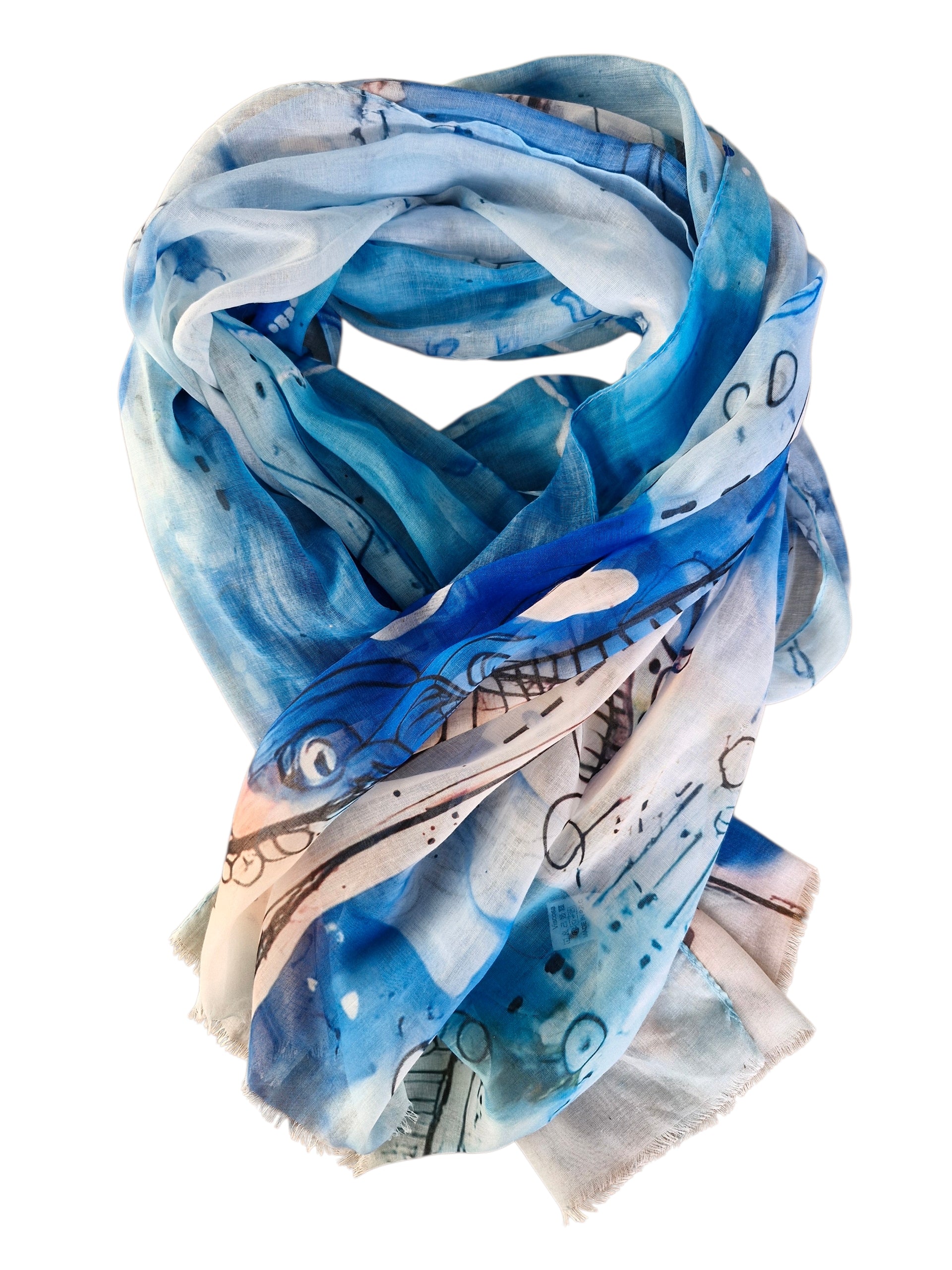 Dette vakre skjerfet fra Vanting er designet med et iøynefallende og kreativt trykk, der diverse blå toner blandes med grafiske, svarte streker på en lys bakgrunn. Den lette kvaliteten gjør det behagelig å ha rundt halsen, og det abstrakte mønsteret tilfører en moderne vri til garderoben din.